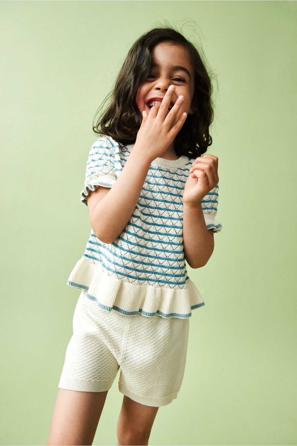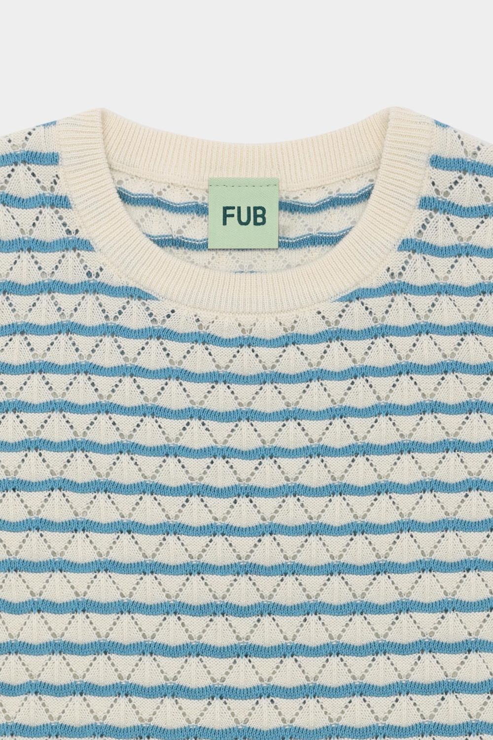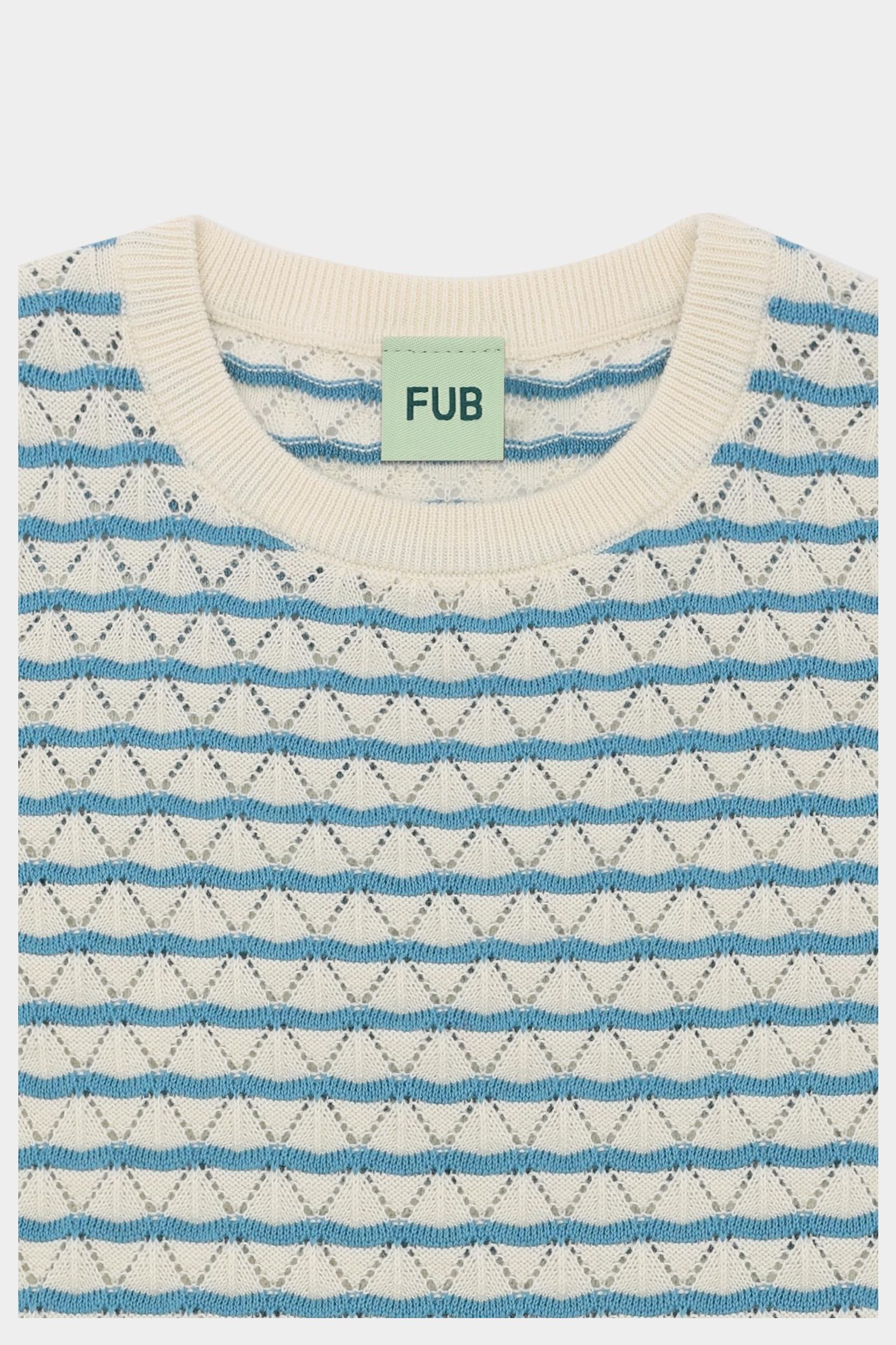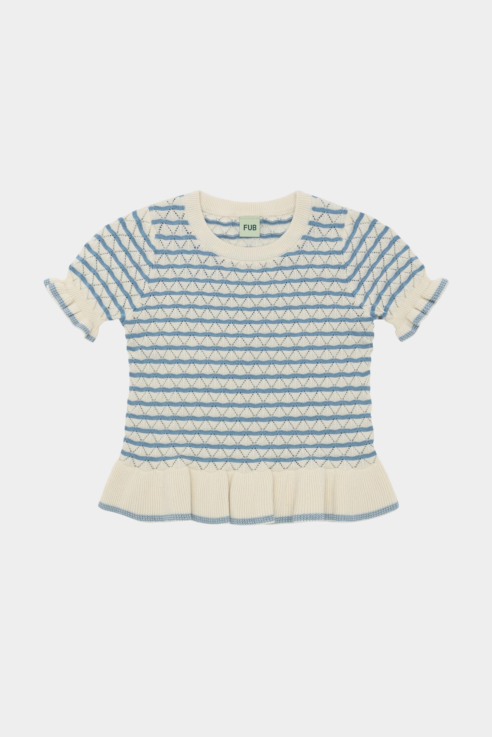 Denne kortærmede t-shirt er strikket i et dekorativt pointellemønster. Den er designet med flæsekanter og rund ribstrikket halskant. T-shirten har en lige pasform og er lavet af økologisk bomuld. Den fås i en stribet og en ensfarvet variant.