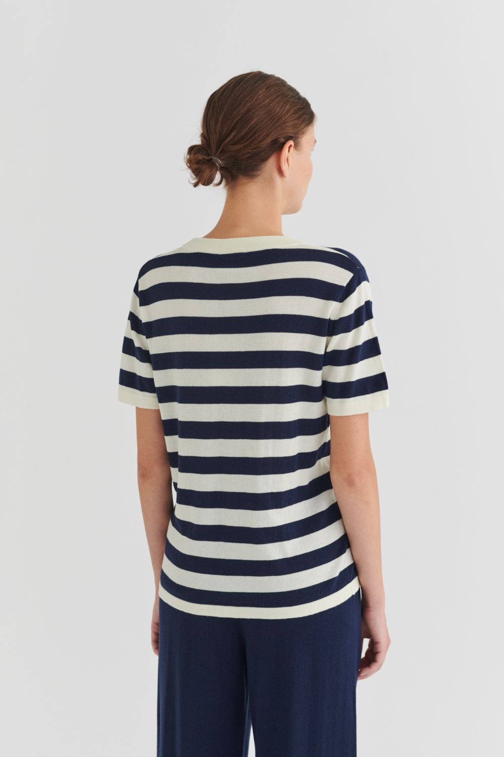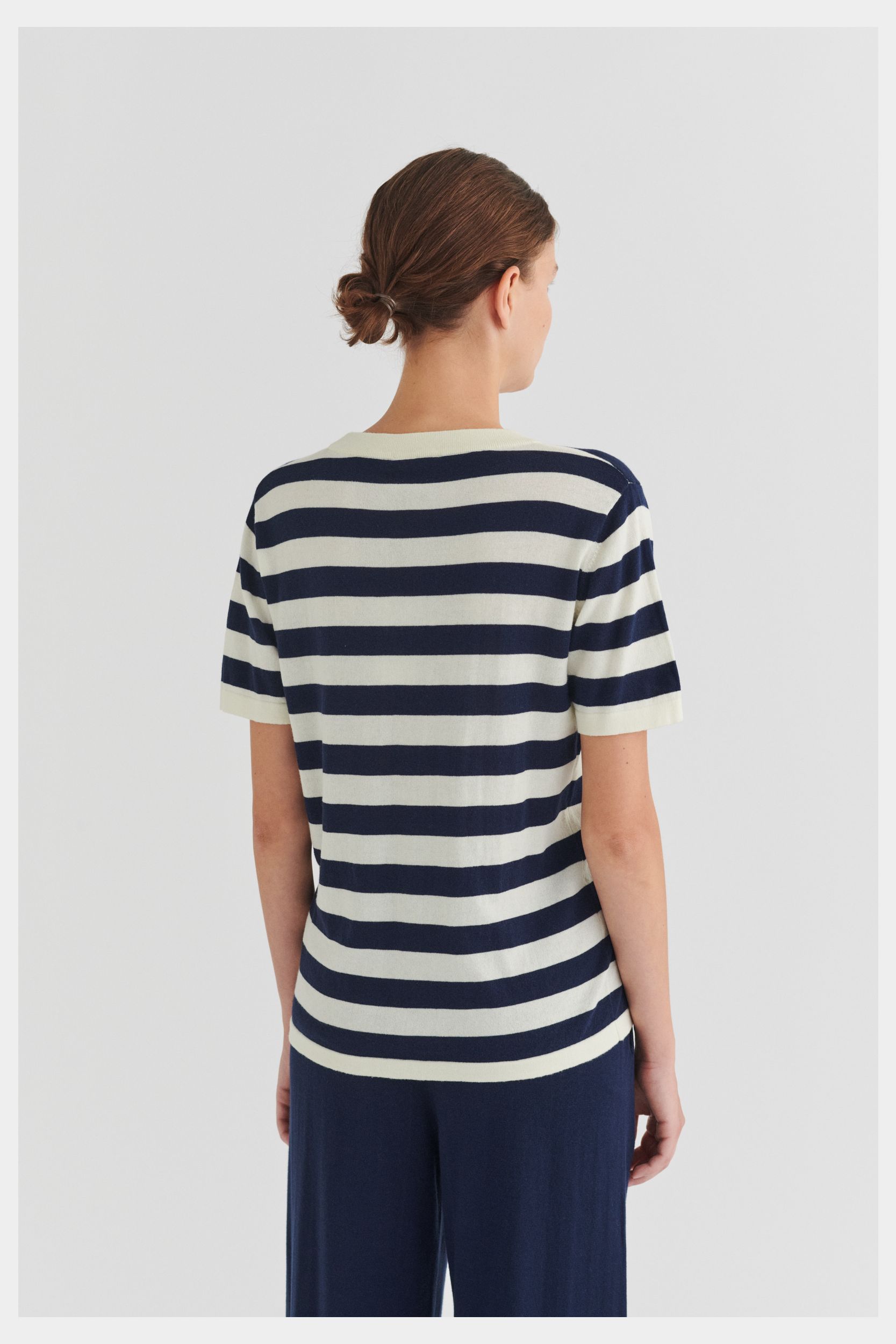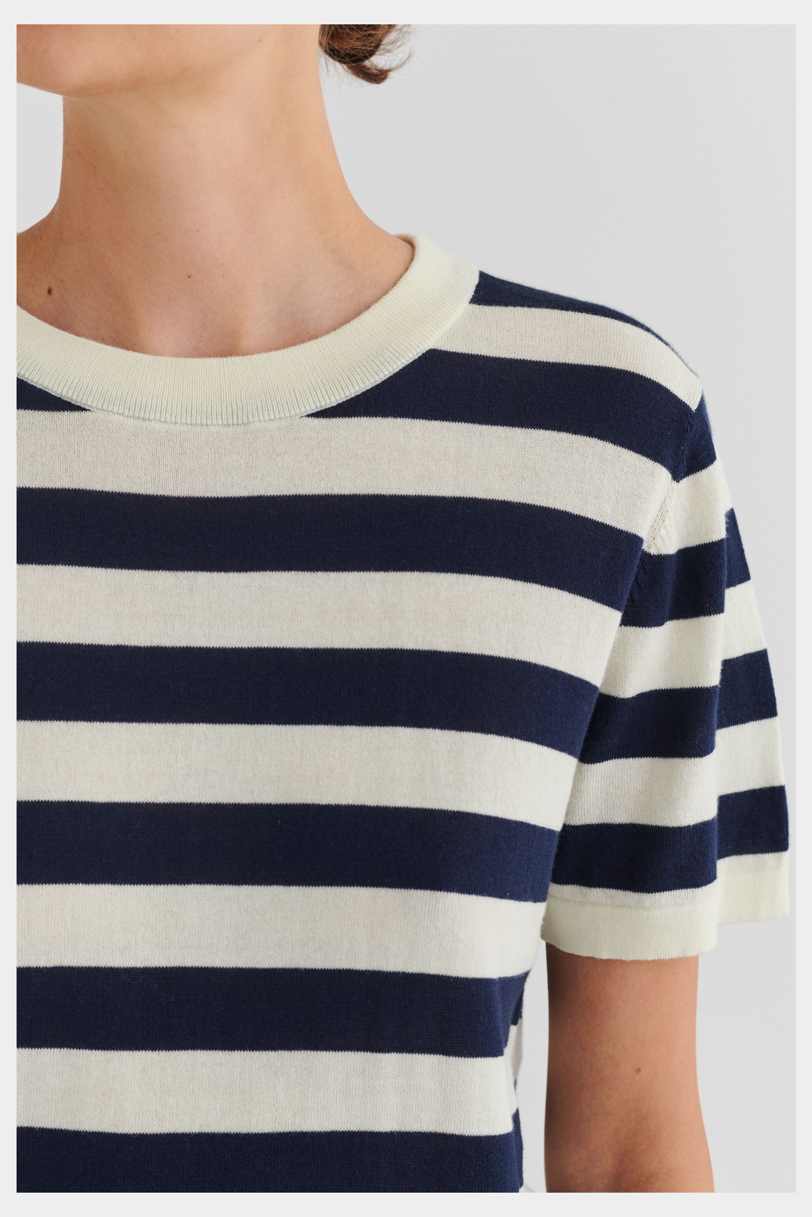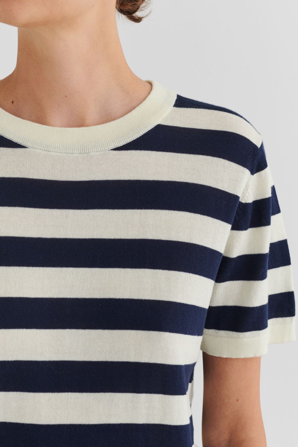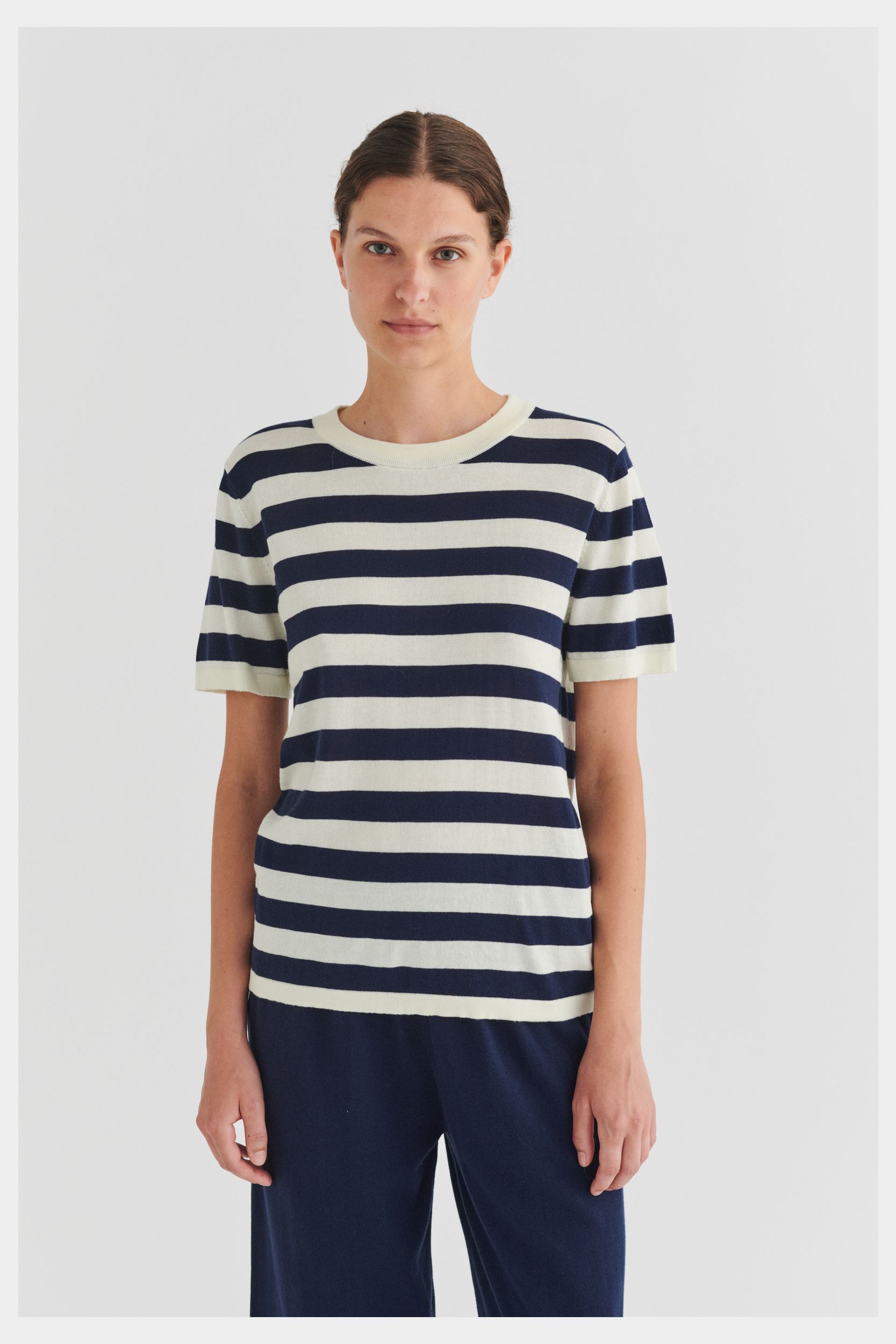 Denne klassiske T-shirt er strikket i en tynd single jersey-struktur og har en rummelig pasform. Den har ombukkede kanter, en ribstrikket halskant og er lavet i økologisk bomuld. T-shirten fås i ensfarvet og med striber.