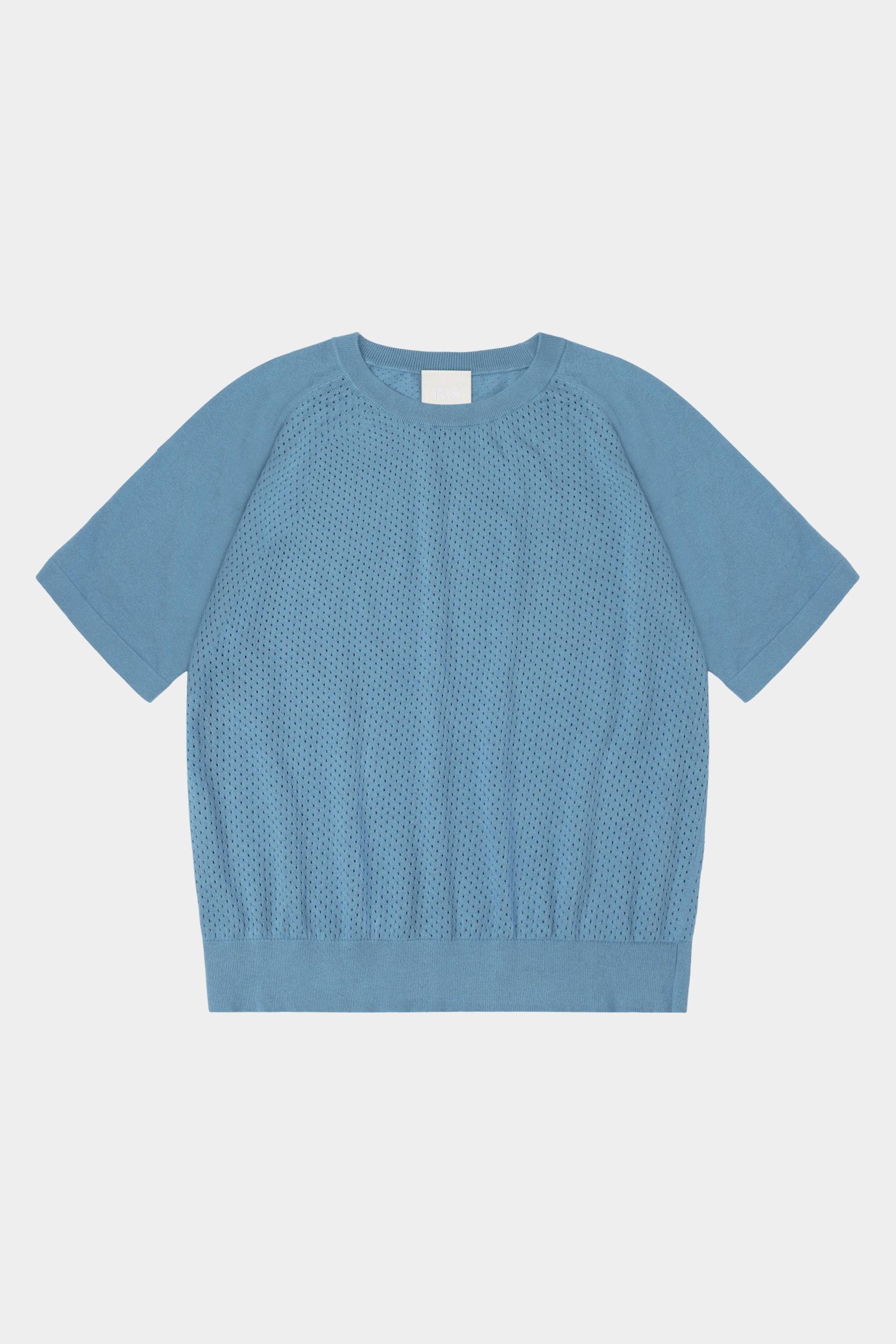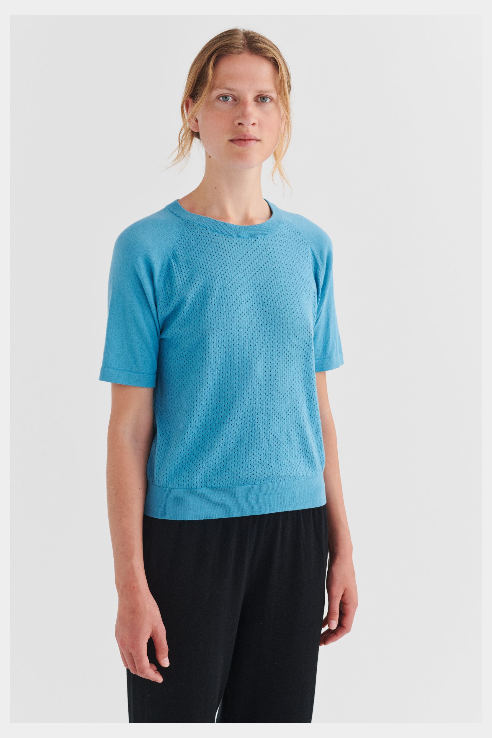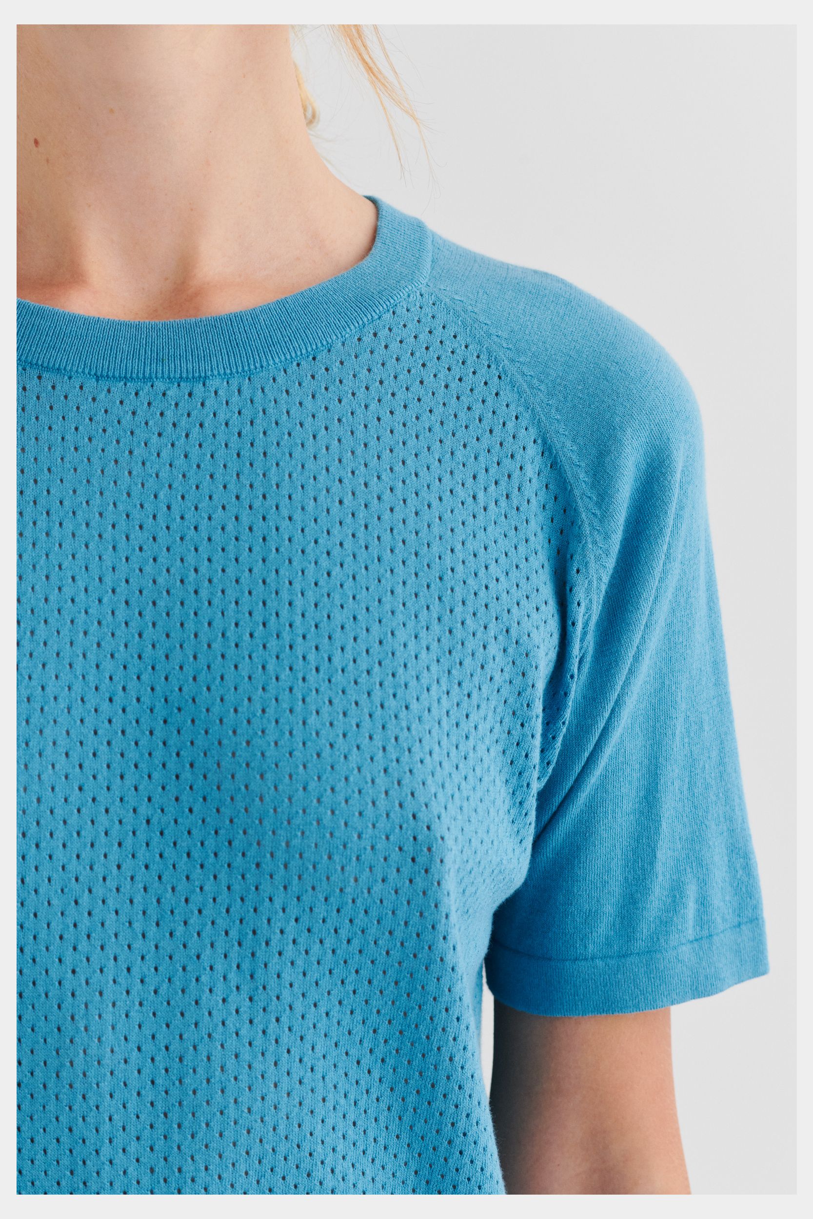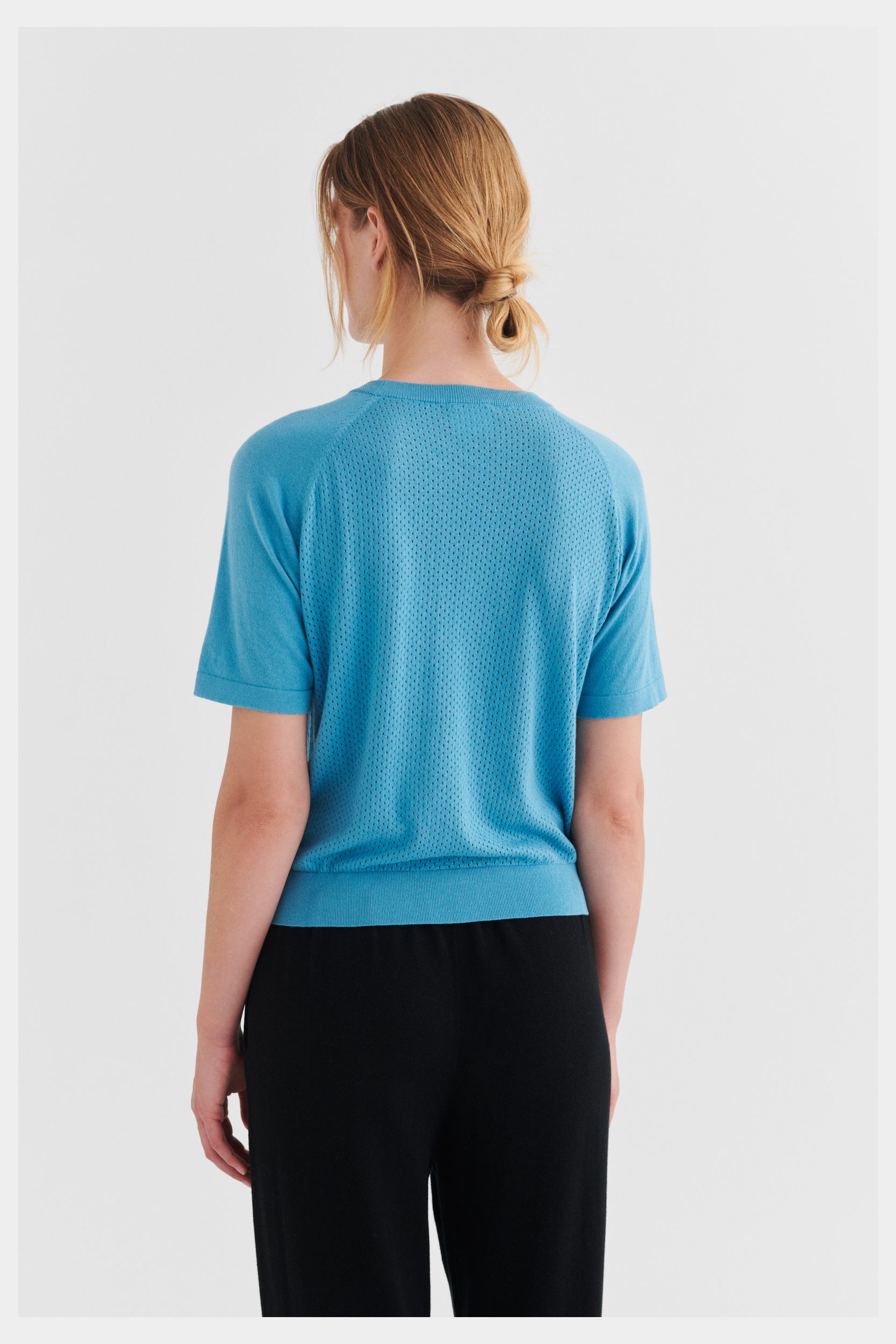 Denne kortærmede t-shirt er designet med raglanærmer, rund hals og ribdetaljer ved krave og forneden. Ærmerne er strikket i single jersey og er afsluttet med ombukkede kanter og kroppen er strikket i et diskret pointellemønster. T-shirten har en almindelig pasform og er lavet af økologisk bomuld.