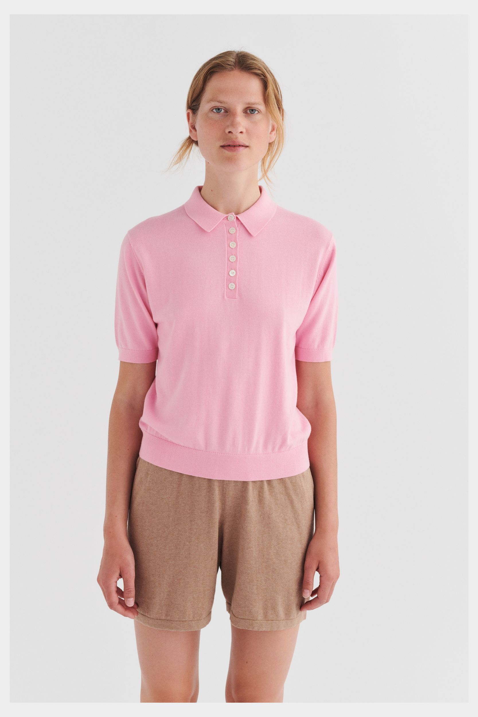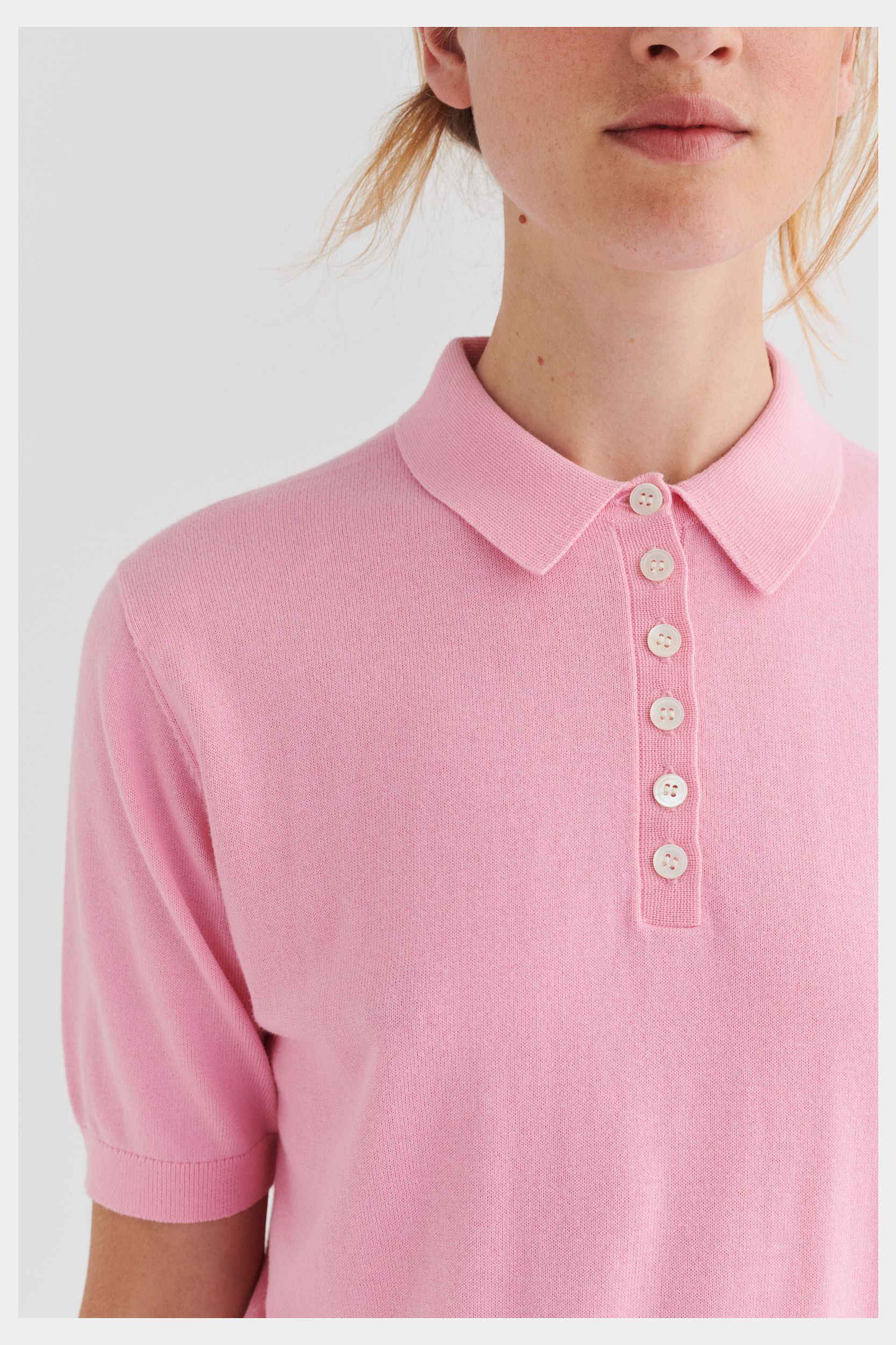 Denne kortærmede polo er strikket i single jersey og er lavet af økologisk bomuld. Poloen har en almindelig pasform og er detaljeret med skjortekrave, ribkanter og stolpelukning med perlemorsknapper.
