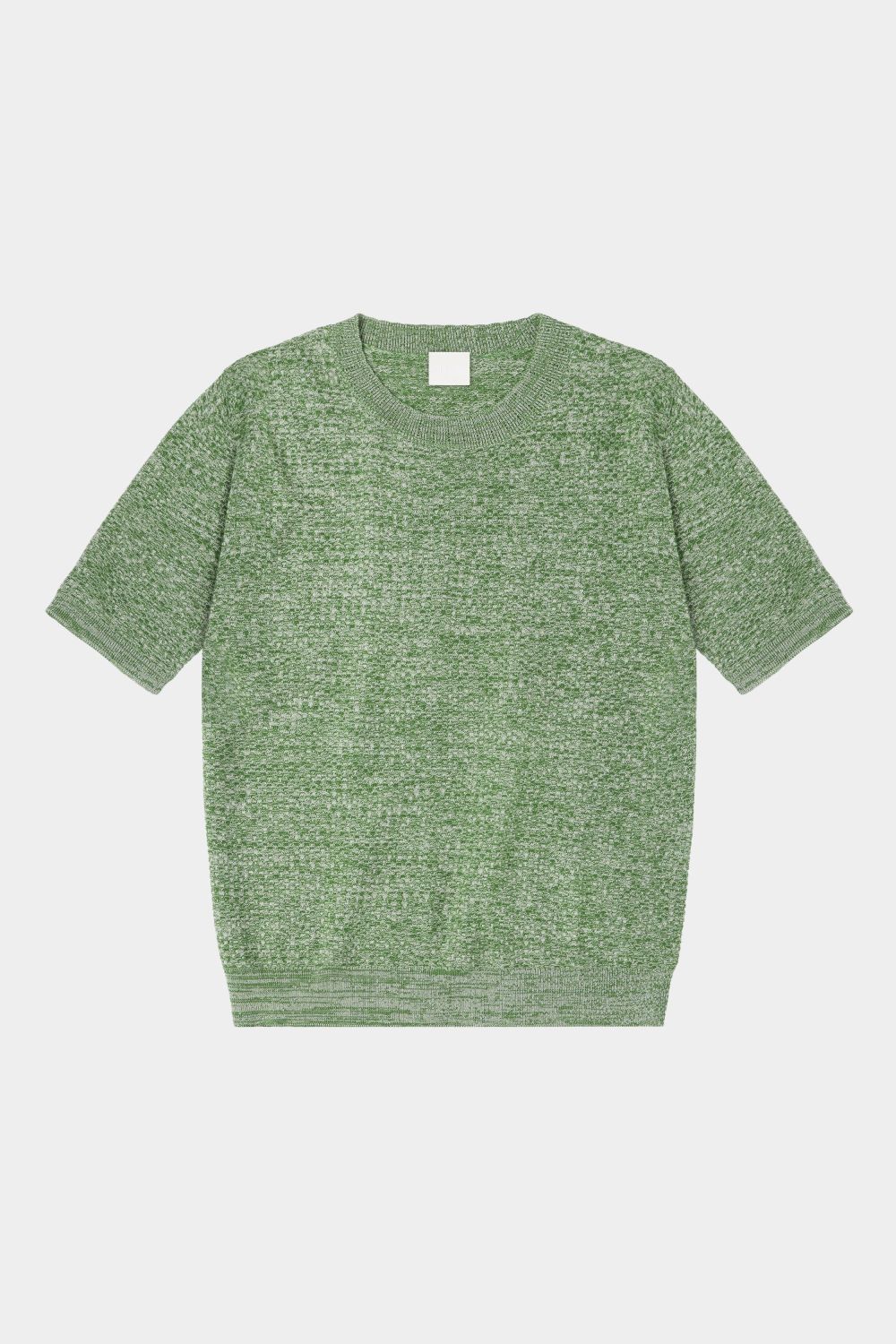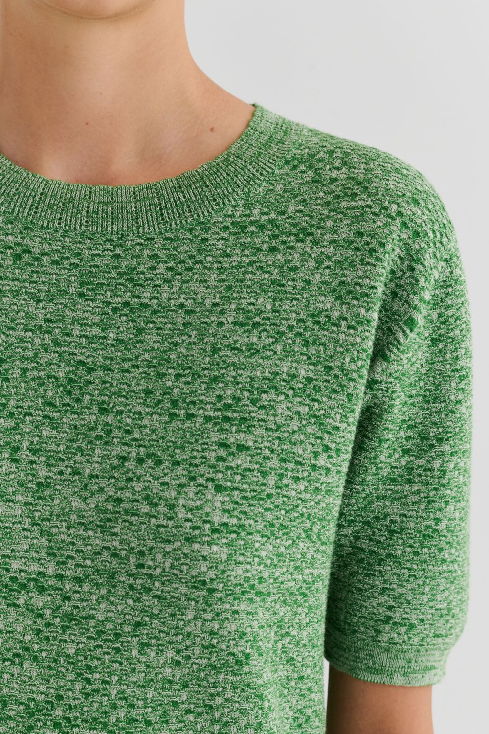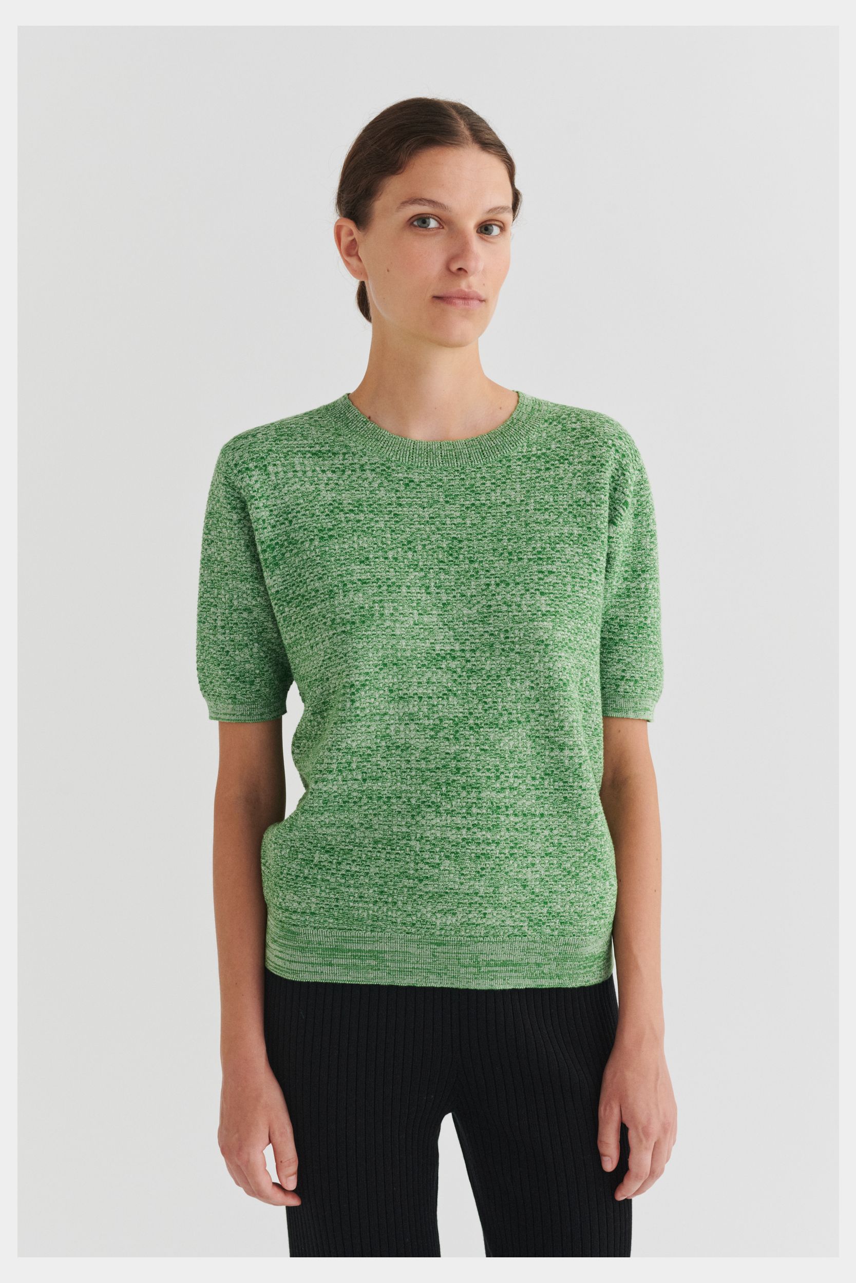 Denne kortærmede t-shirt er strikket i et dekorativt strukturmønster og er lavet af økologisk bomuld. T-shirten har en almindelig pasform og er detaljeret med en rund halsudskæring med en diskret pointelledetalje samt klassiske ribkanter ved ærmer og forneden. Den fås både i en melange-version og i en ensfarvet version.