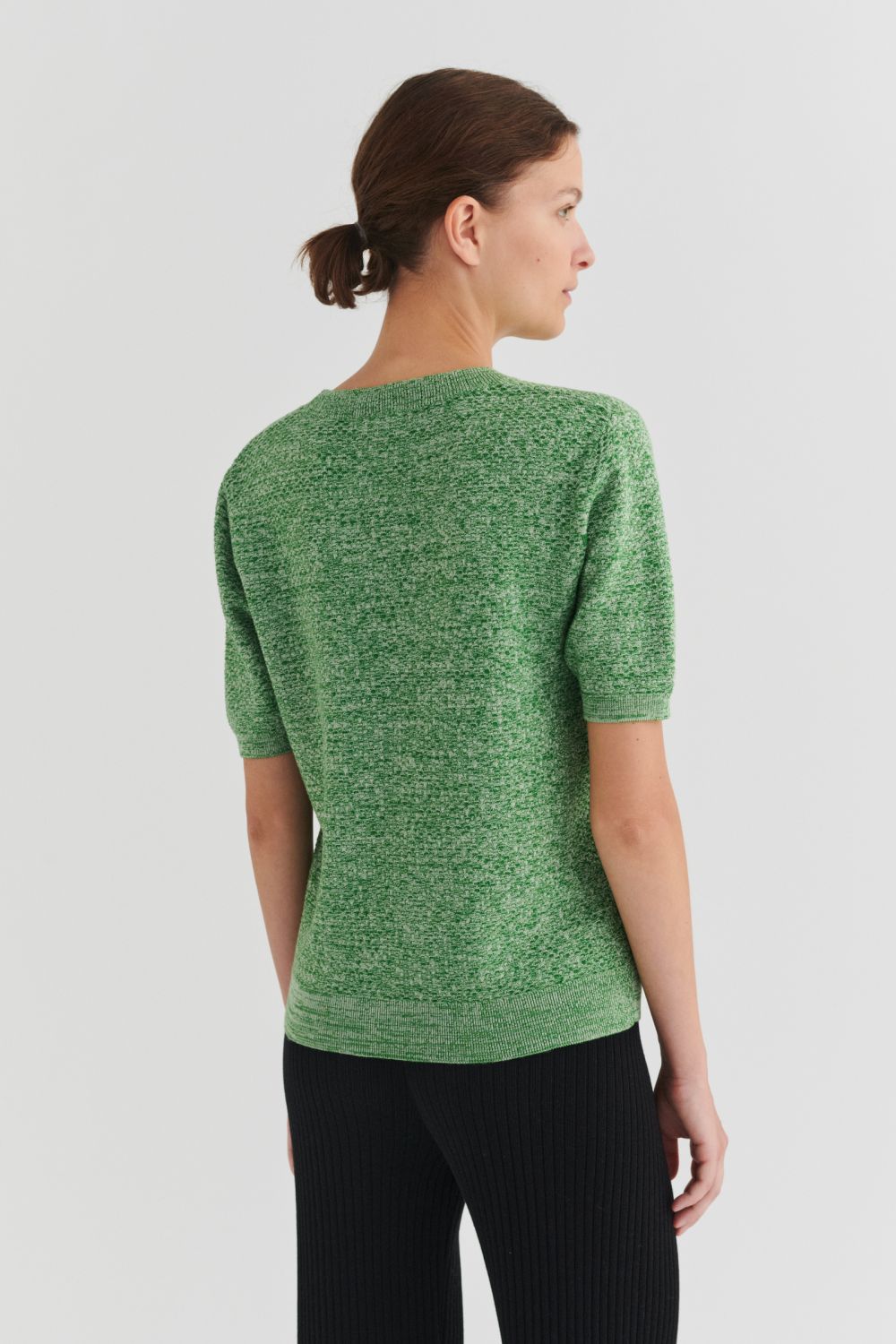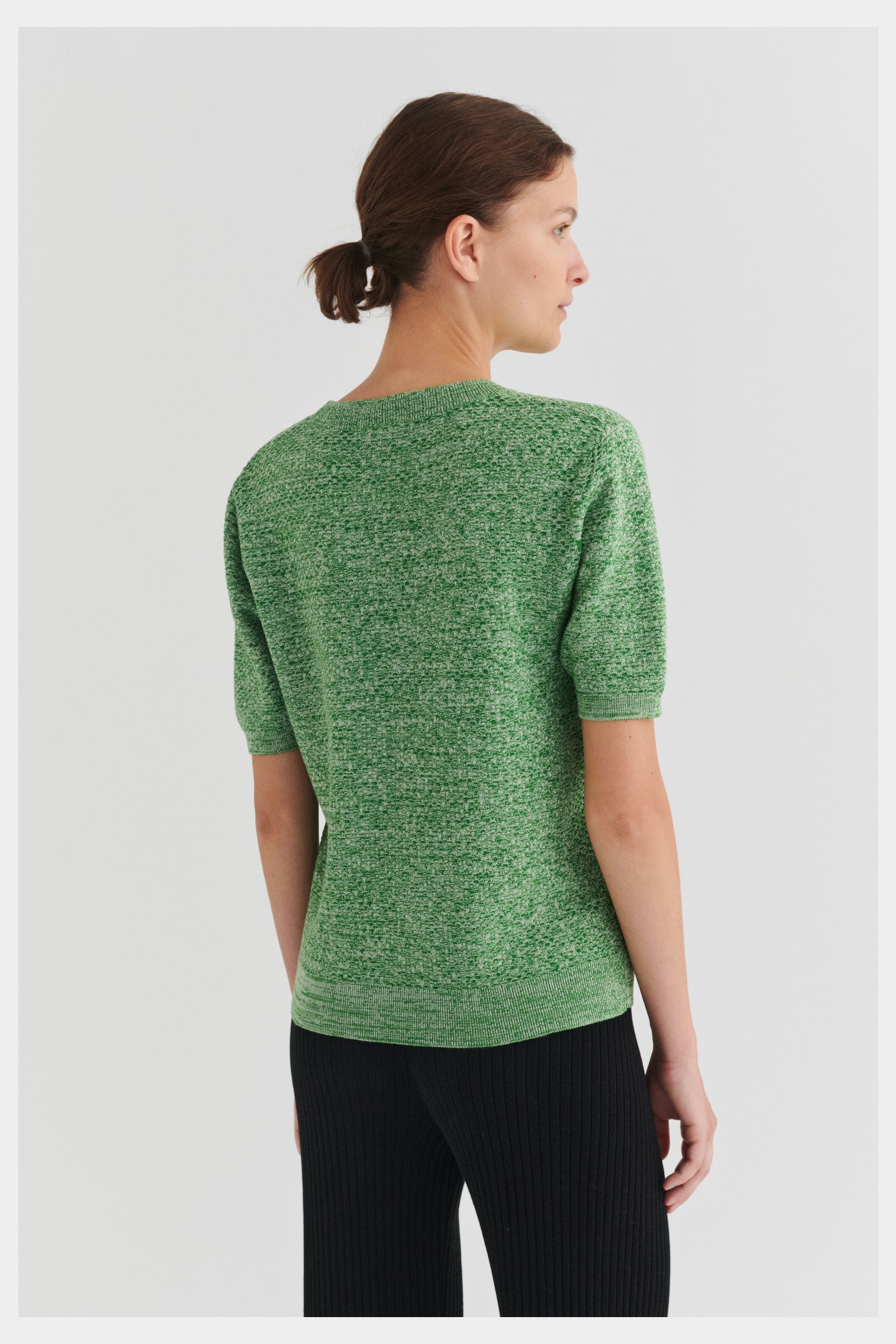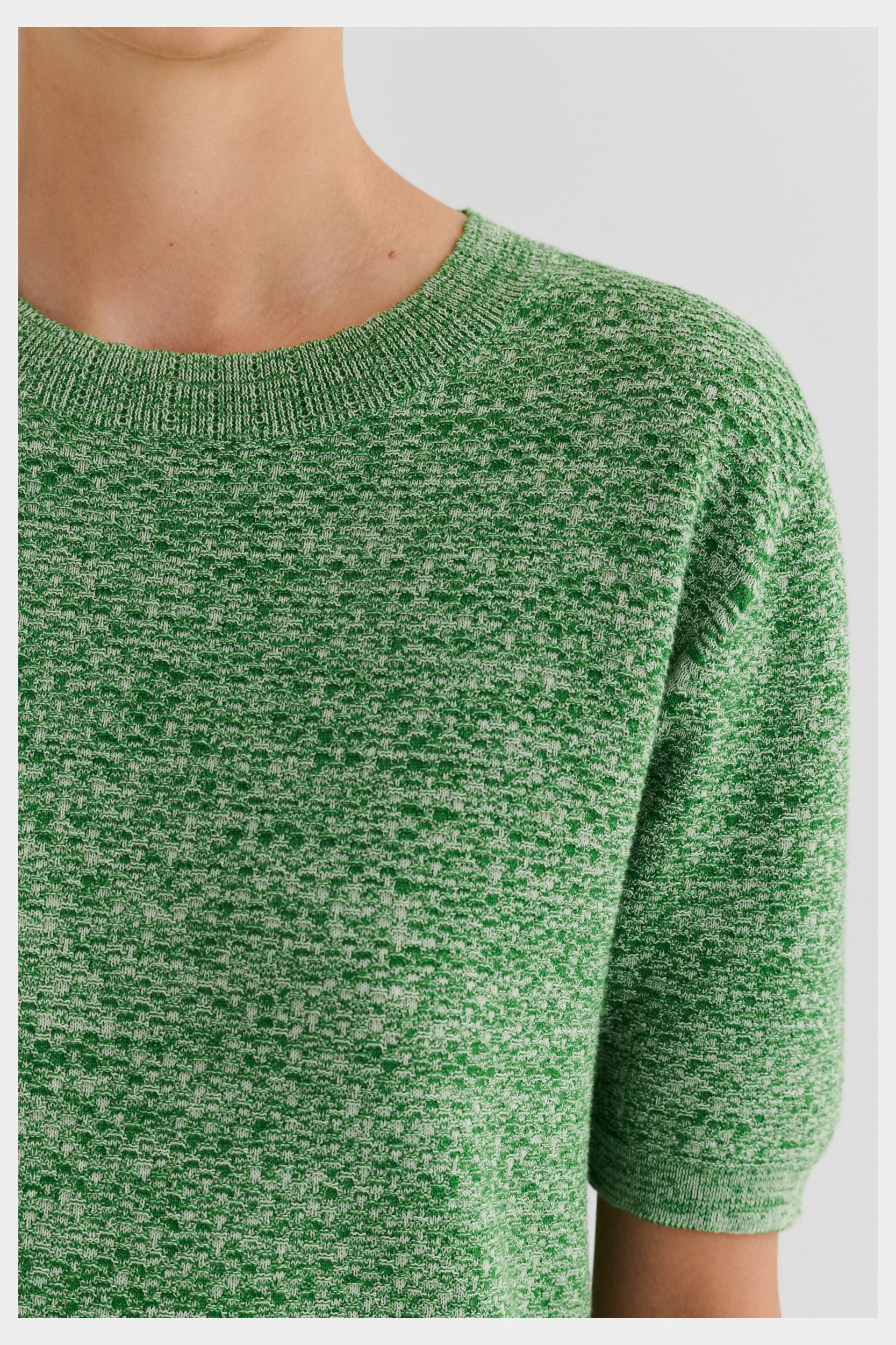 Denne kortærmede t-shirt er strikket i et dekorativt strukturmønster og er lavet af økologisk bomuld. T-shirten har en almindelig pasform og er detaljeret med en rund halsudskæring med en diskret pointelledetalje samt klassiske ribkanter ved ærmer og forneden. Den fås både i en melange-version og i en ensfarvet version.