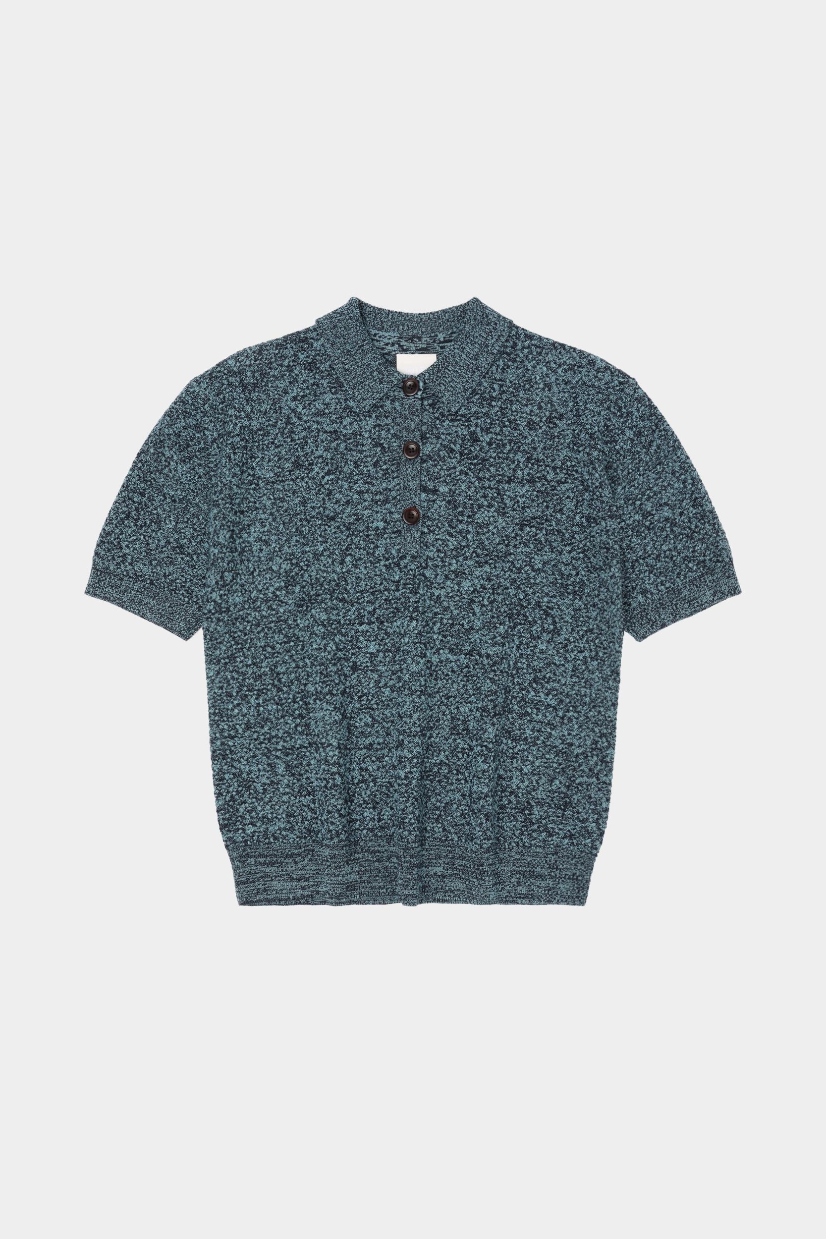 Denne polo er strikket i ren merinould og er designet med lavt skulderpunkt, ribstrikket skjortekrave og en let løs pasform. Poloen er strikket i et fast strukturmønster og har knaplukning foran med knapper af corozonød samt ribdetaljer forneden og ved ærmekanterne. Fås i en meleret version og en ensfarvet version. Vores merinould er BLUESIGN® og RWS-certificeret, fri for skadelig kemi og stammer fra får, der ikke er blevet udsat for mulesing.