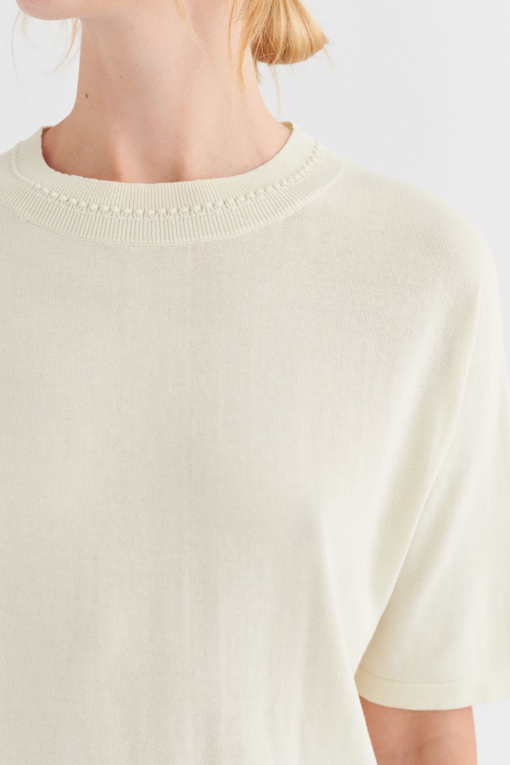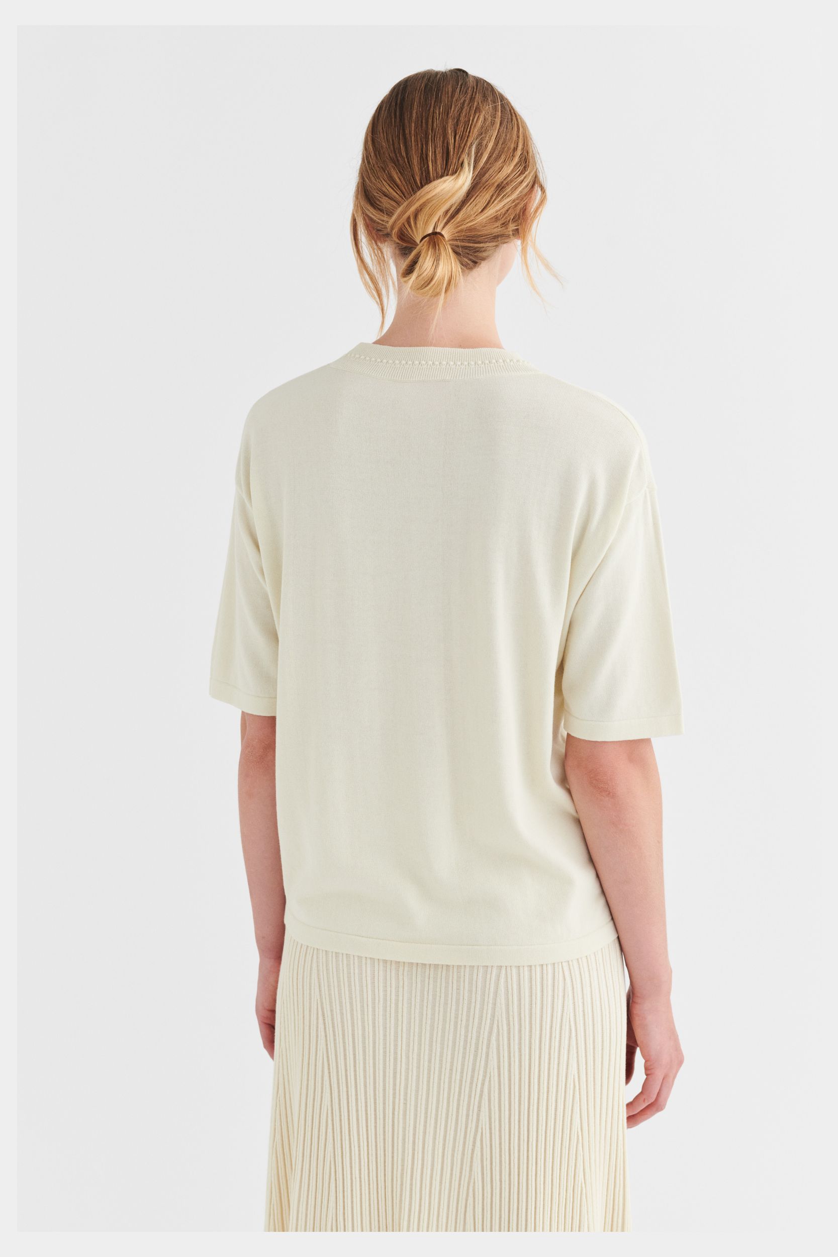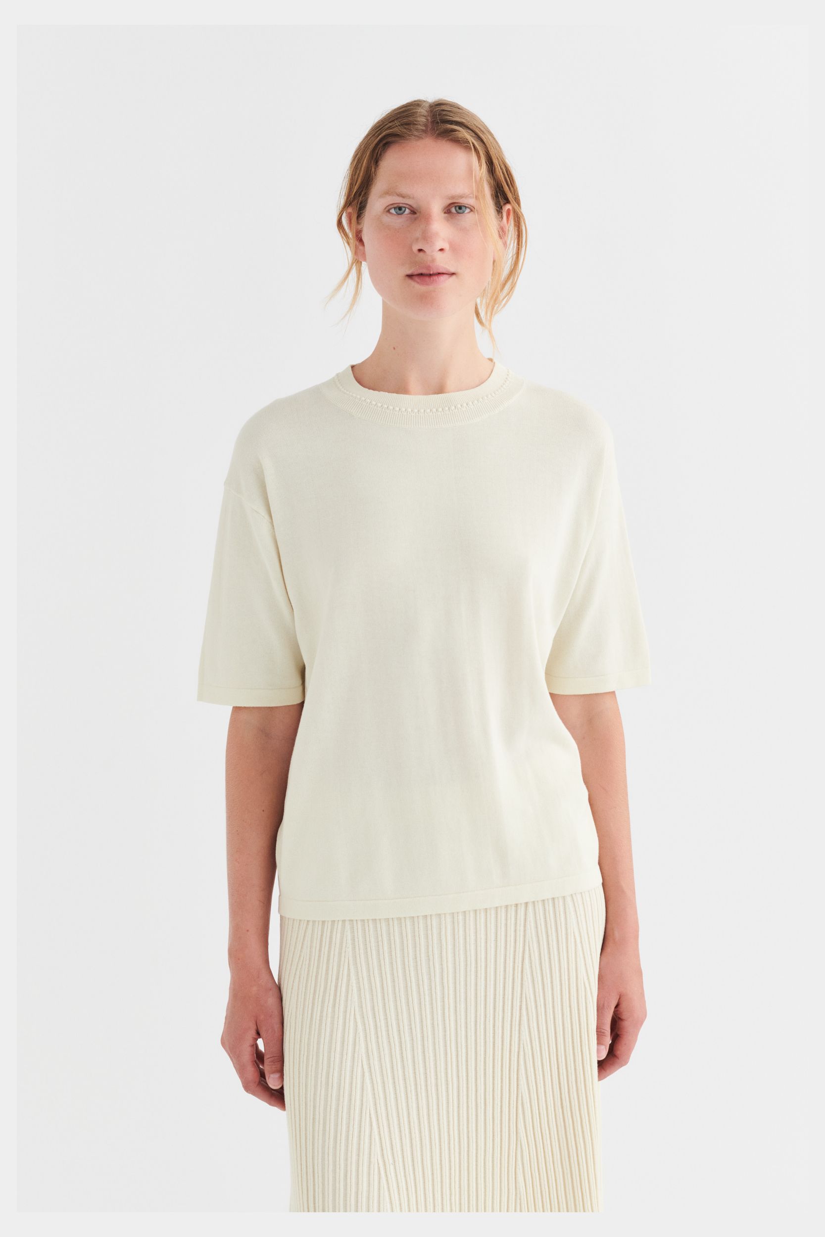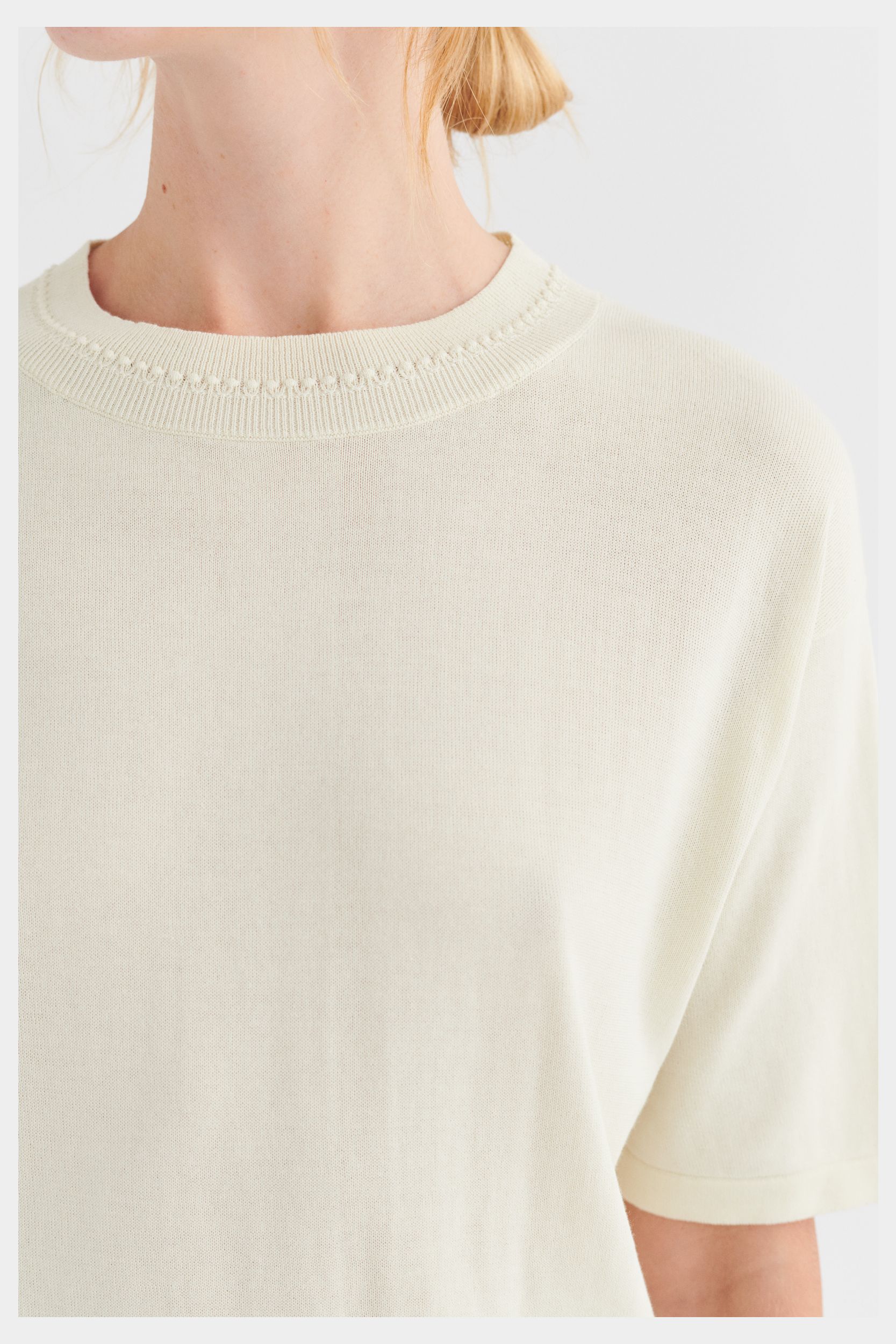 Denne oversize t-shirt er strikket i fast single jersey. Den er detaljeret med ombukkede kanter og ribstrikket halskant med en dekorativ detalje. T-shirten er lavet af et økologisk high-twist bomuldsgarn, som er spundet hårdere end vores klassiske bomuld og giver stylen et fastere, skarpere og mere formstabilt udtryk.