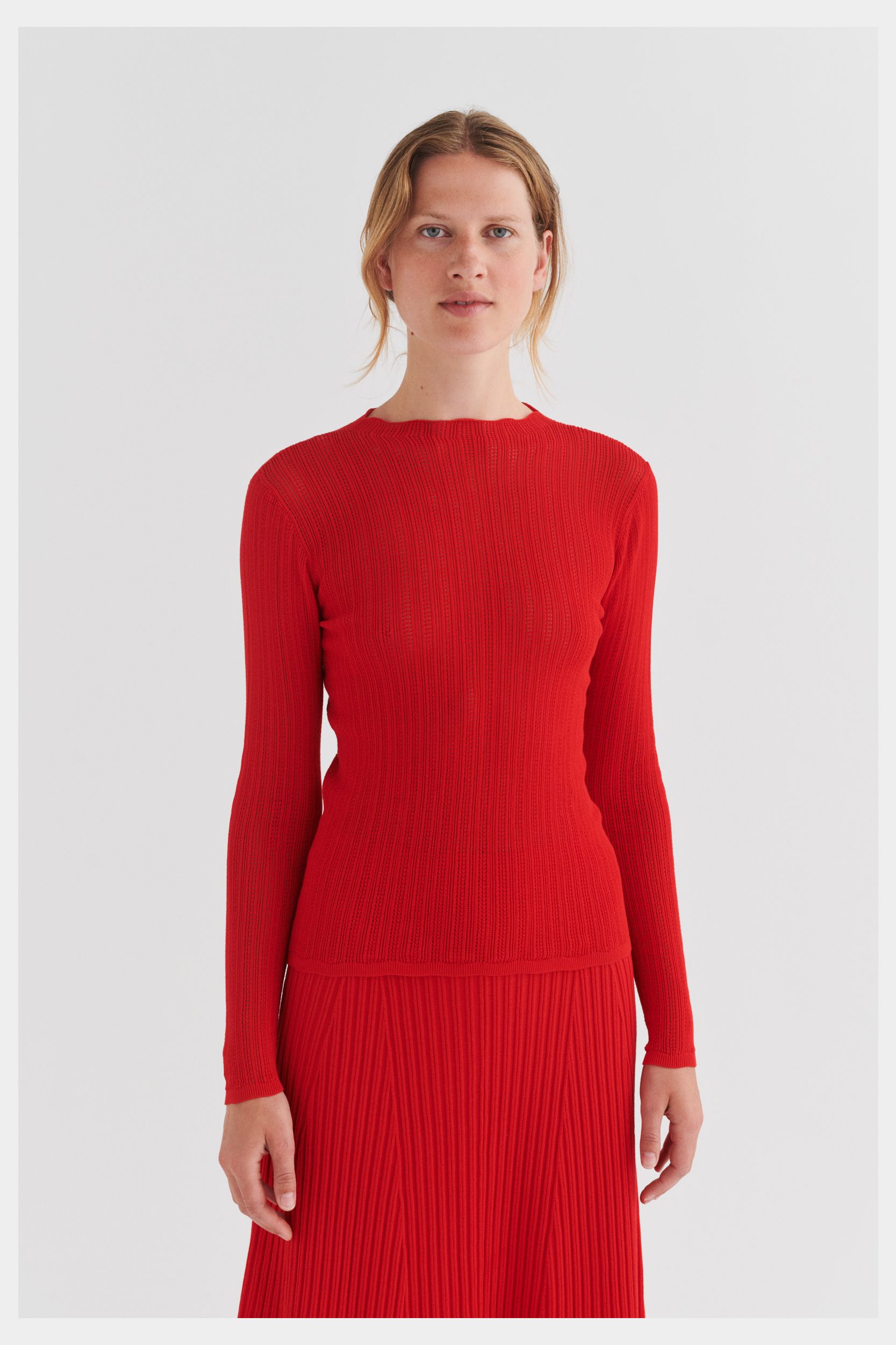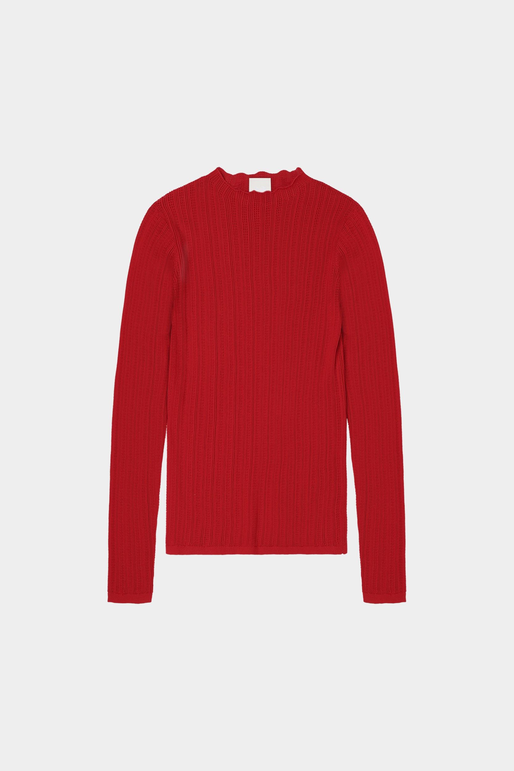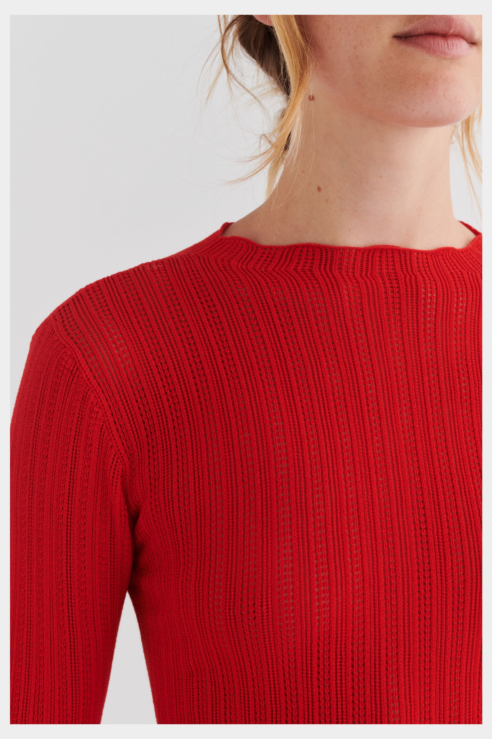 Denne langærmede top er strikket i en fin pointellestruktur og har en lige smal pasform. Den er detaljeret med høj hals og diskret finish på ærmekanter og forneden. Toppen er er strikket i et økologisk high-twist bomuldsgarn, som er spundet hårdere end vores klassiske bomuld, og giver stylen et fastere, skarpere og mere formstabilt udtryk.