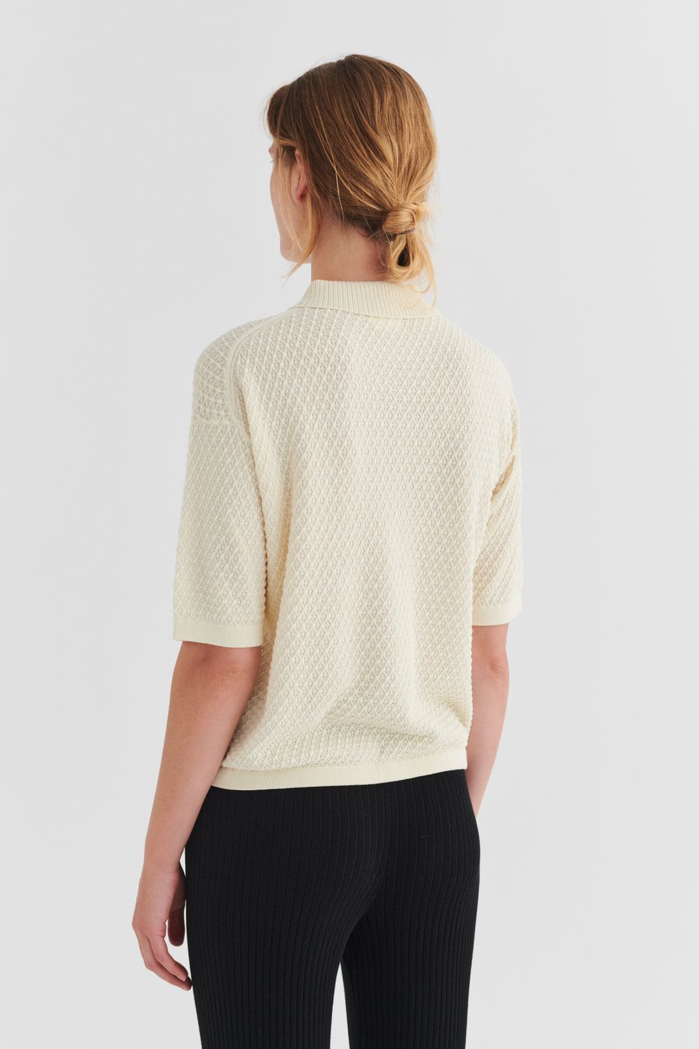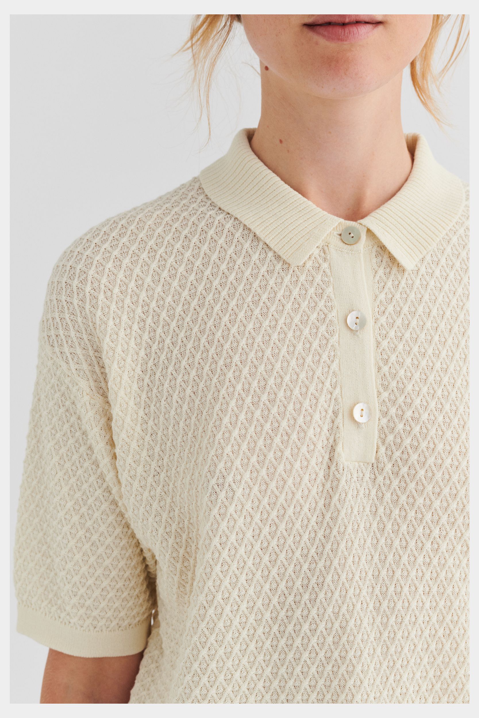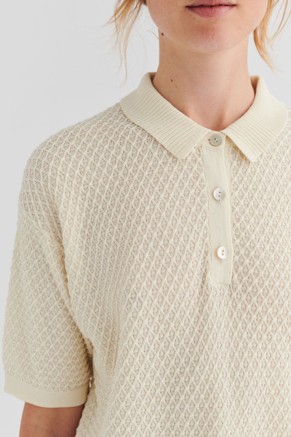 Denne kortærmede polo er strikket i en fast struktur og har en løs pasform. Den har ribstrikket krave, ombukkede kanter og stolpelukning med perlemorsknapper. Poloen er strikket i et økologisk high-twist bomuldsgarn, som er spundet hårdere end vores klassiske bomuld, og giver stylen et fastere, skarpere og mere formstabilt udtryk.