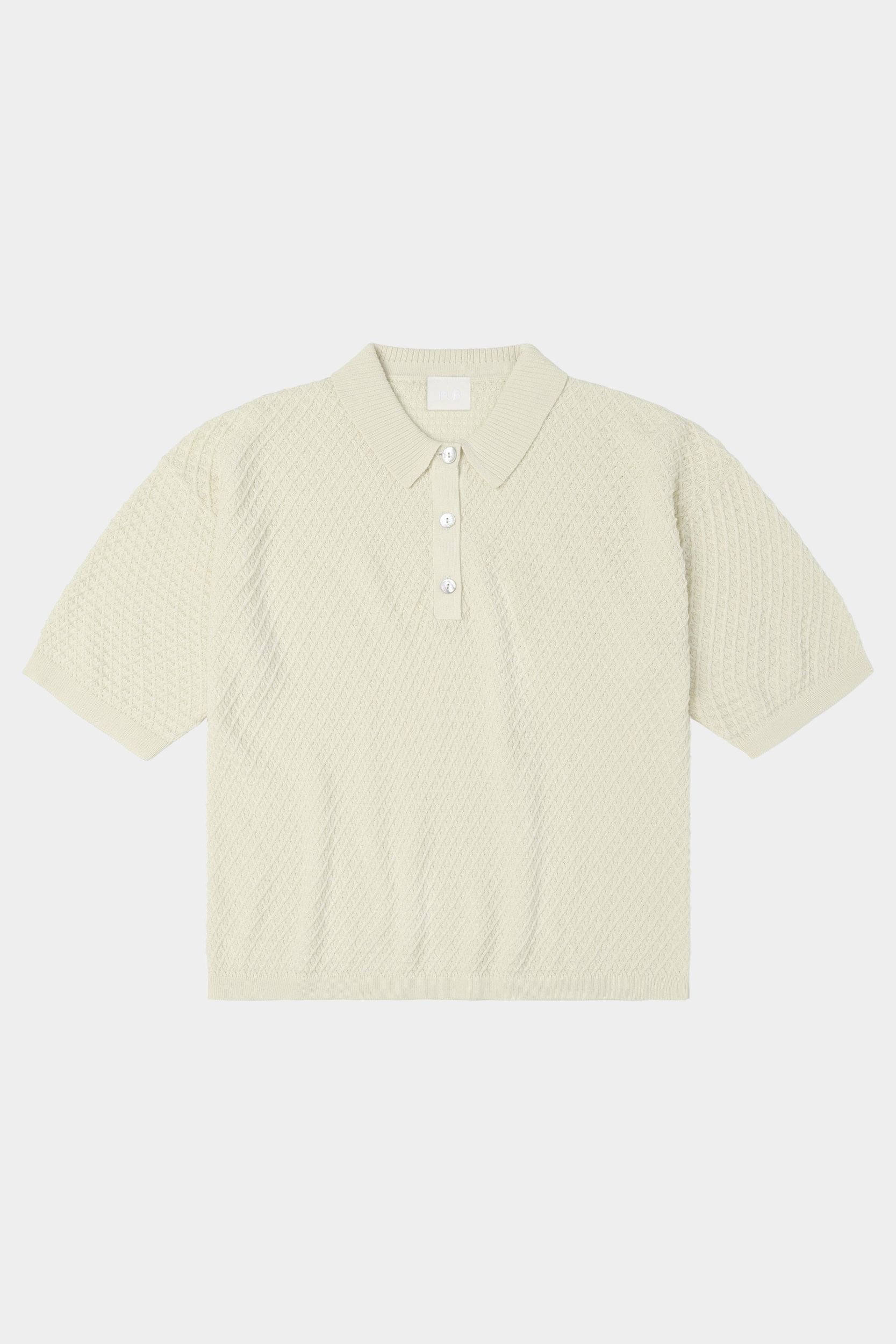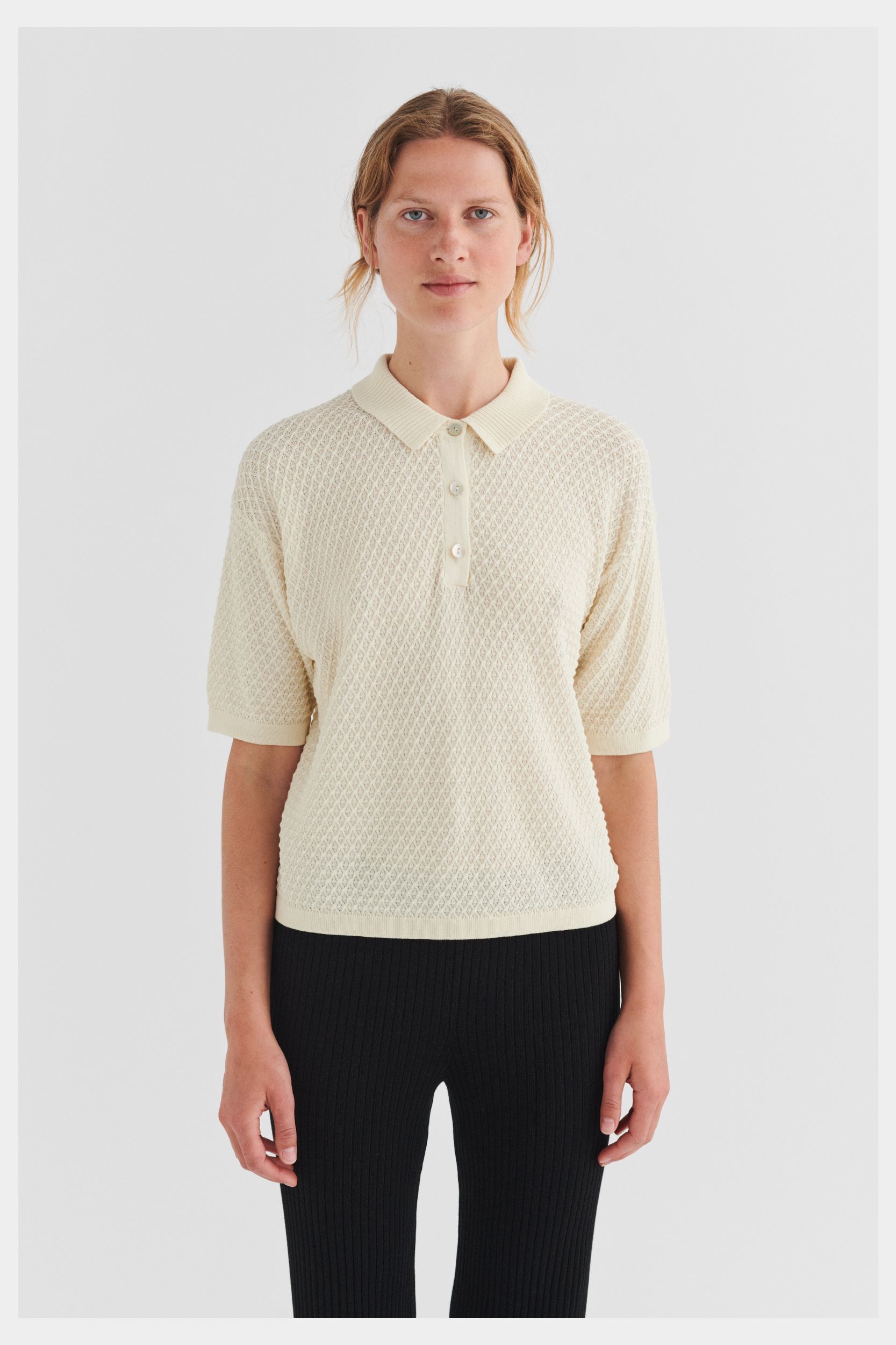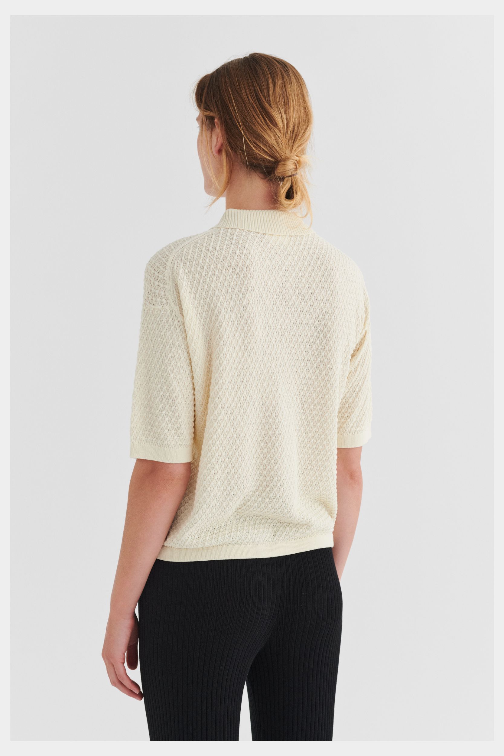 Denne kortærmede polo er strikket i en fast struktur og har en løs pasform. Den har ribstrikket krave, ombukkede kanter og stolpelukning med perlemorsknapper. Poloen er strikket i et økologisk high-twist bomuldsgarn, som er spundet hårdere end vores klassiske bomuld, og giver stylen et fastere, skarpere og mere formstabilt udtryk.
