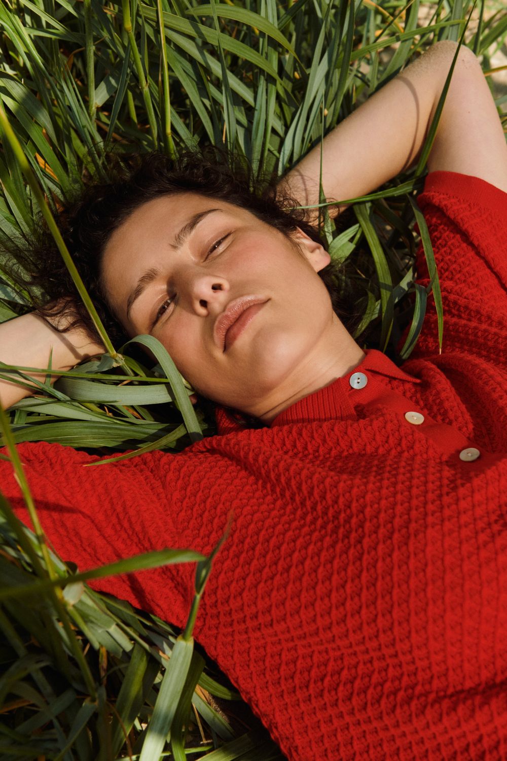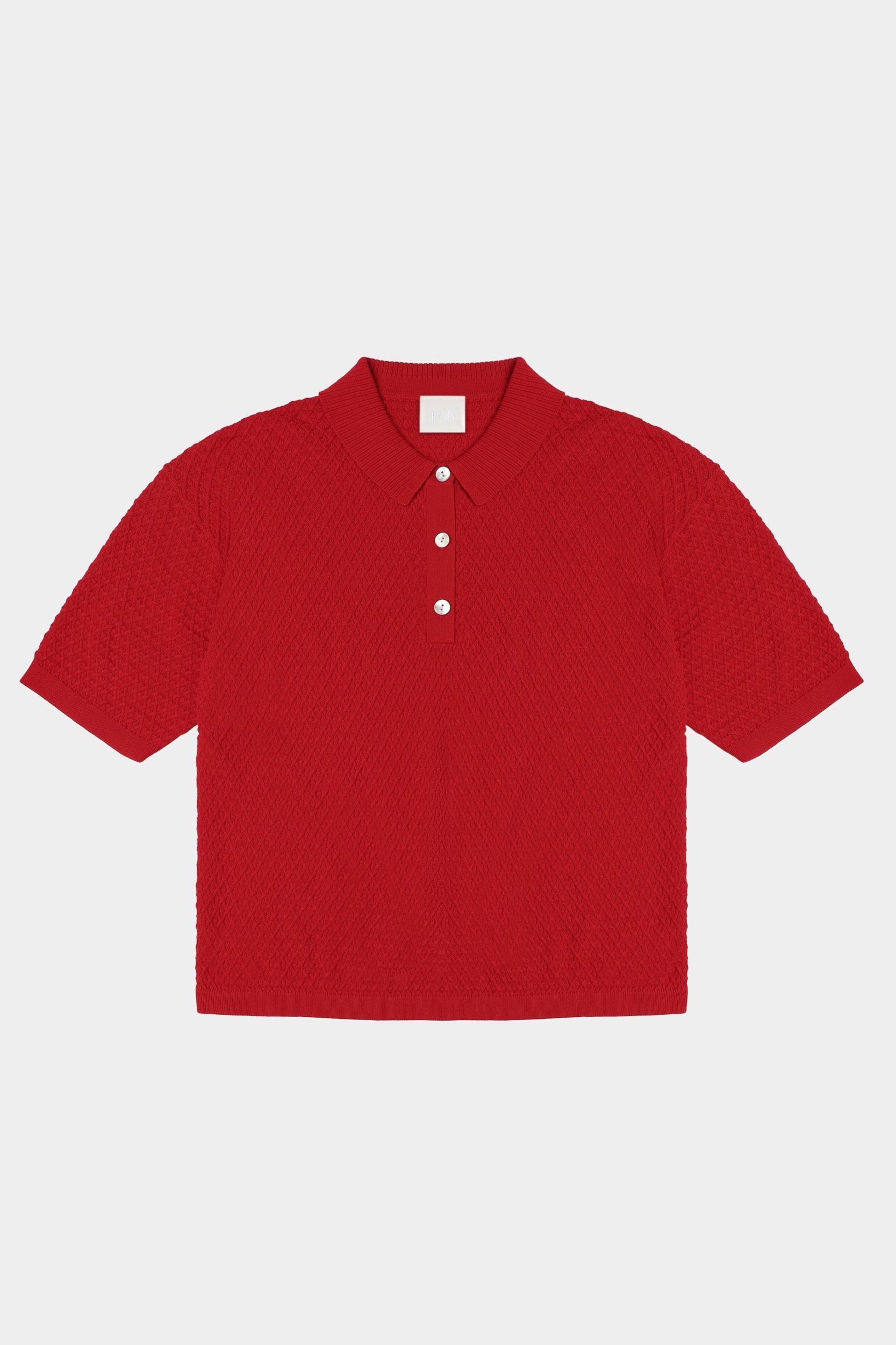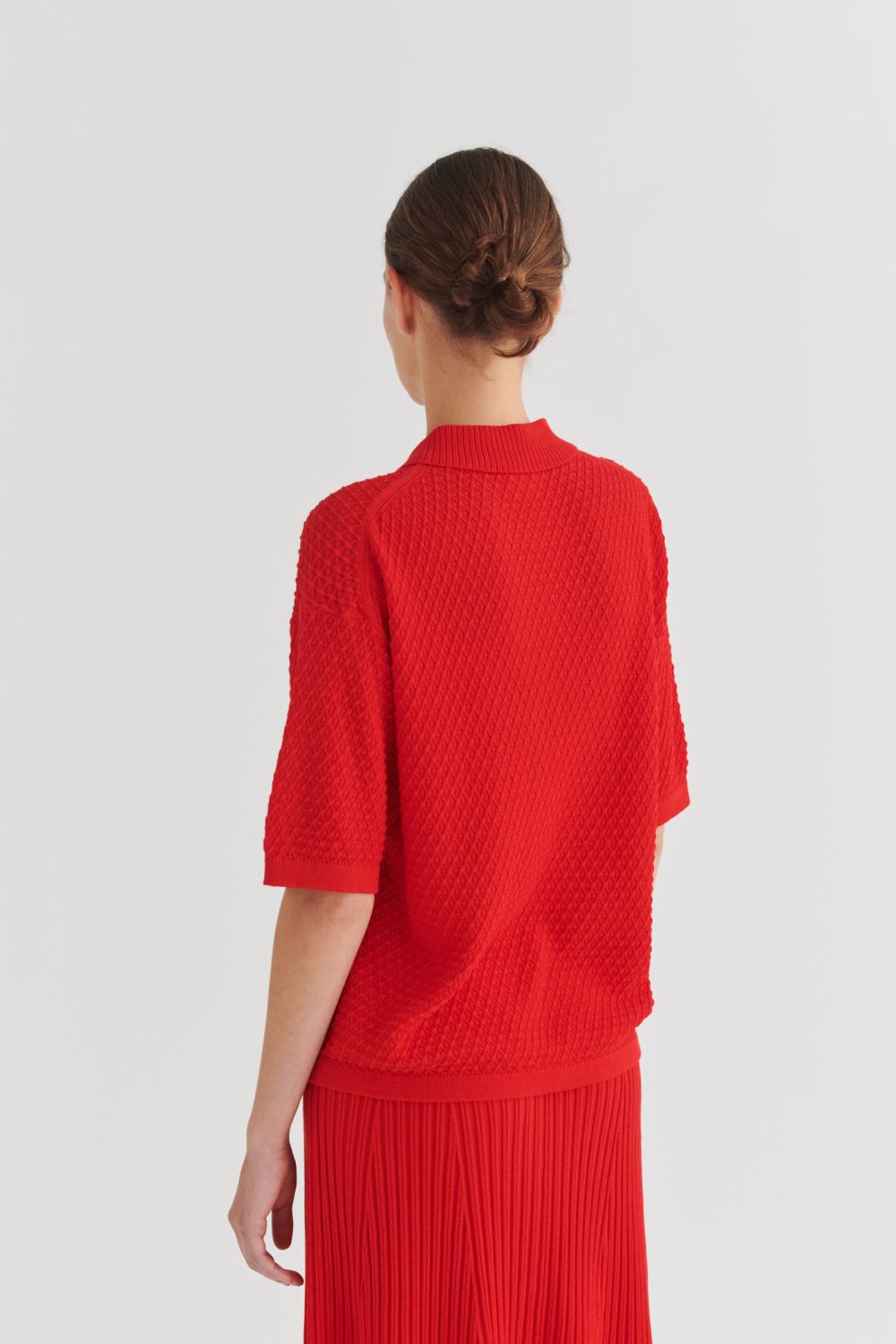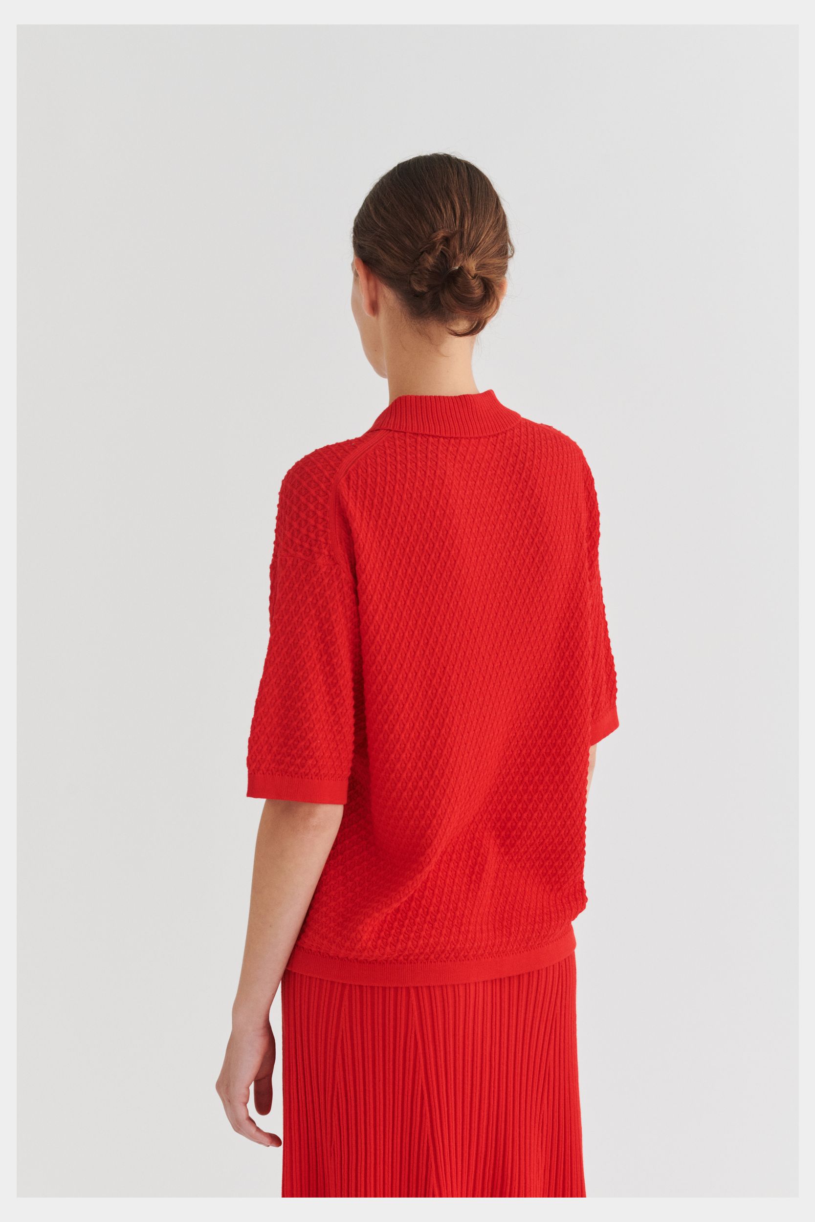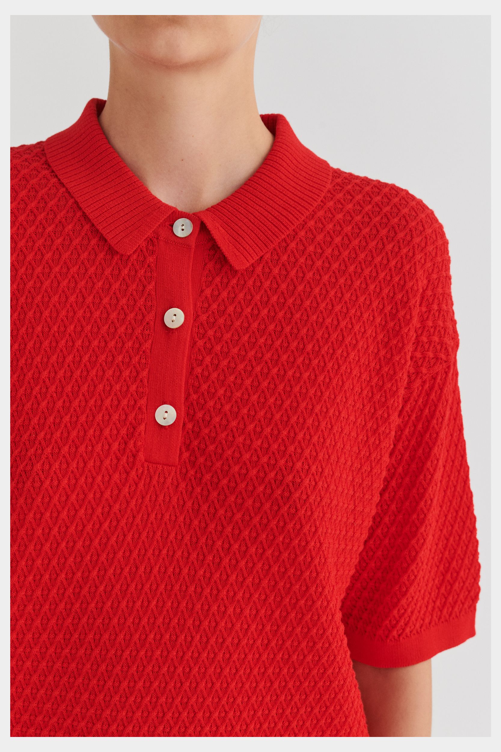 Denne kortærmede polo er strikket i en fast struktur og har en løs pasform. Den har ribstrikket krave, ombukkede kanter og stolpelukning med perlemorsknapper. Poloen er strikket i et økologisk high-twist bomuldsgarn, som er spundet hårdere end vores klassiske bomuld, og giver stylen et fastere, skarpere og mere formstabilt udtryk.