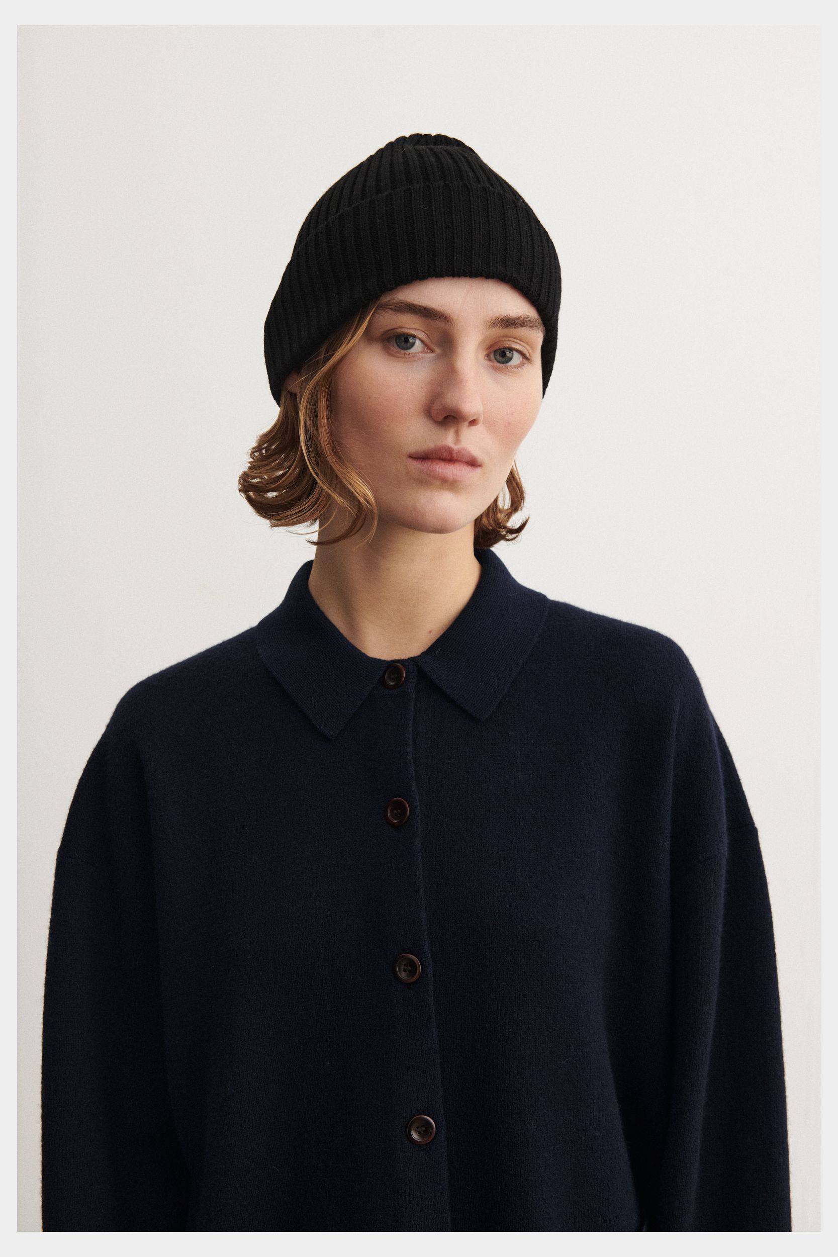 Denne klassiske hue i blød merinould er strikket i en fast ribstruktur med ombukket kant og er et must-have på kolde vinterdage. Den fås i ensfarvet og i en melange version. Vores merinould er BLUESIGN® og RWS-certificeret, fri for skadelig kemi og stammer fra får, der ikke er blevet udsat for mulesing.