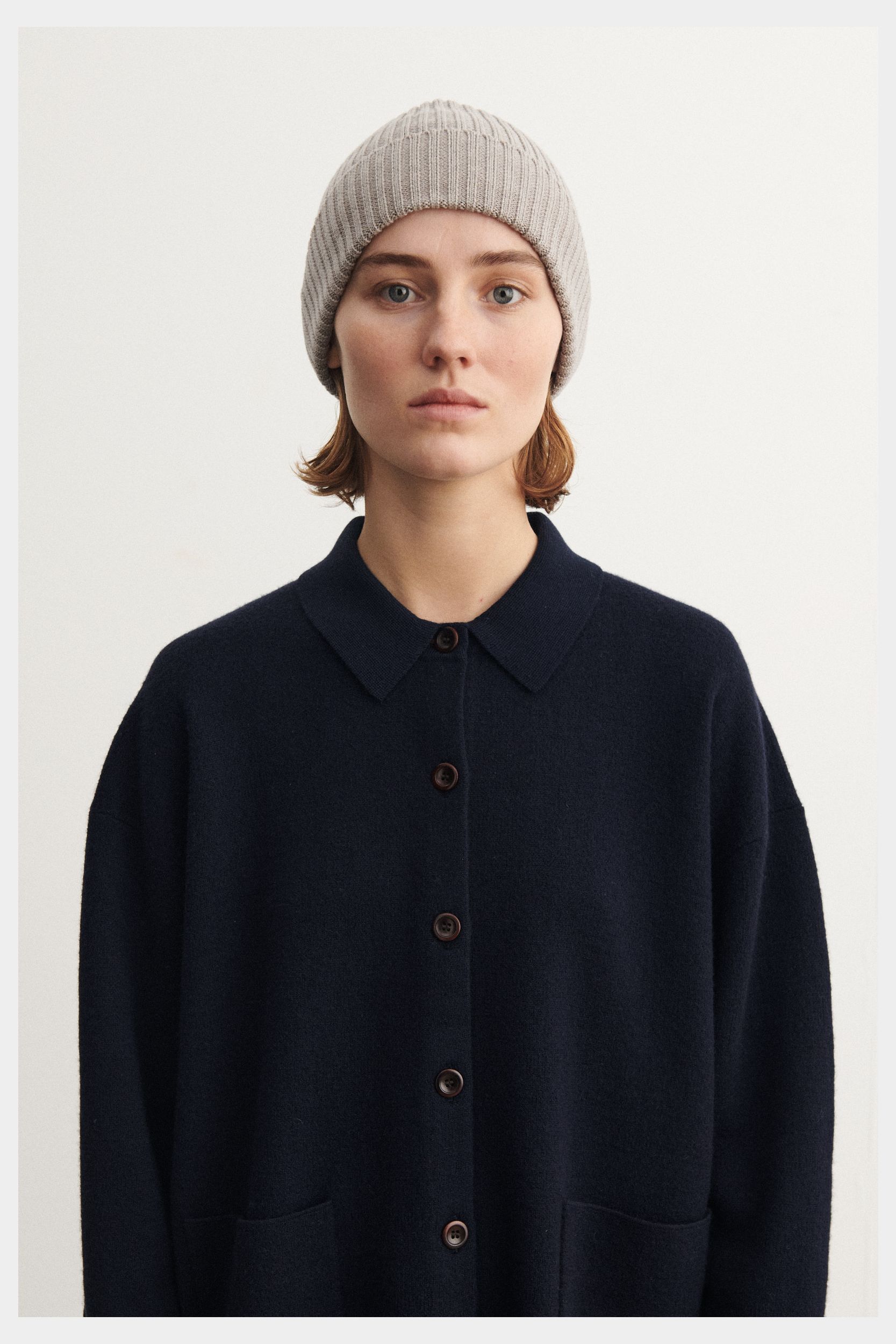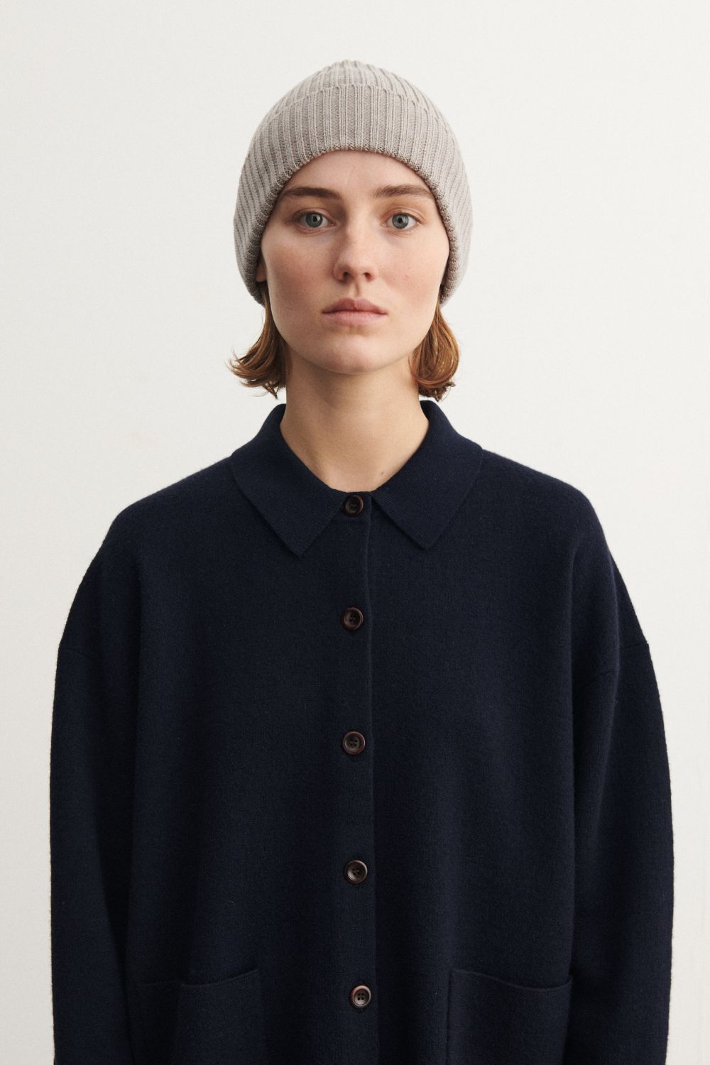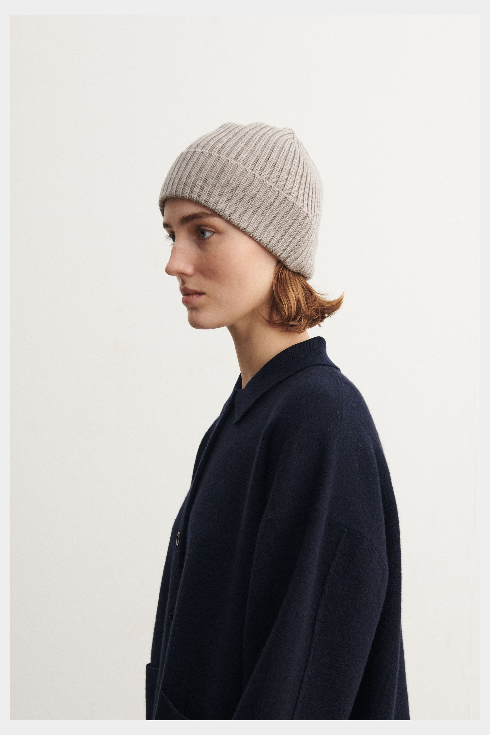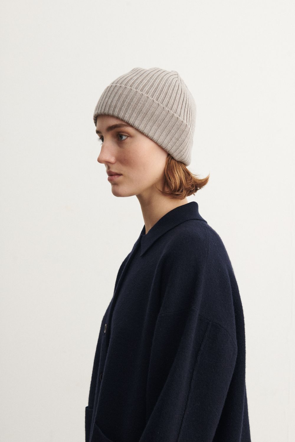 Denne klassiske hue i blød merinould er strikket i en fast ribstruktur med ombukket kant og er et must-have på kolde vinterdage. Den fås i ensfarvet og i en melange version. Vores merinould er BLUESIGN® og RWS-certificeret, fri for skadelig kemi og stammer fra får, der ikke er blevet udsat for mulesing.