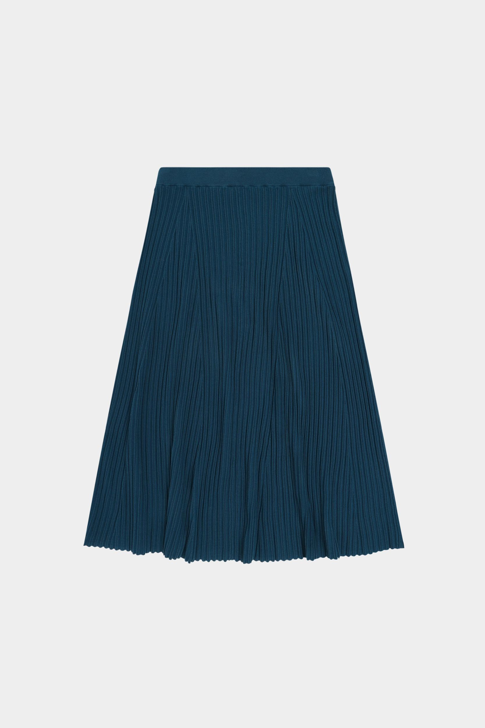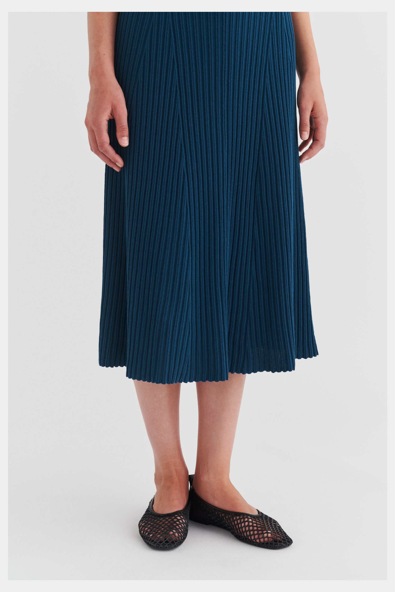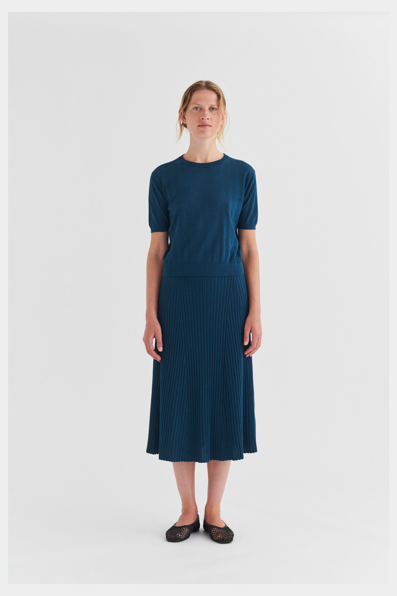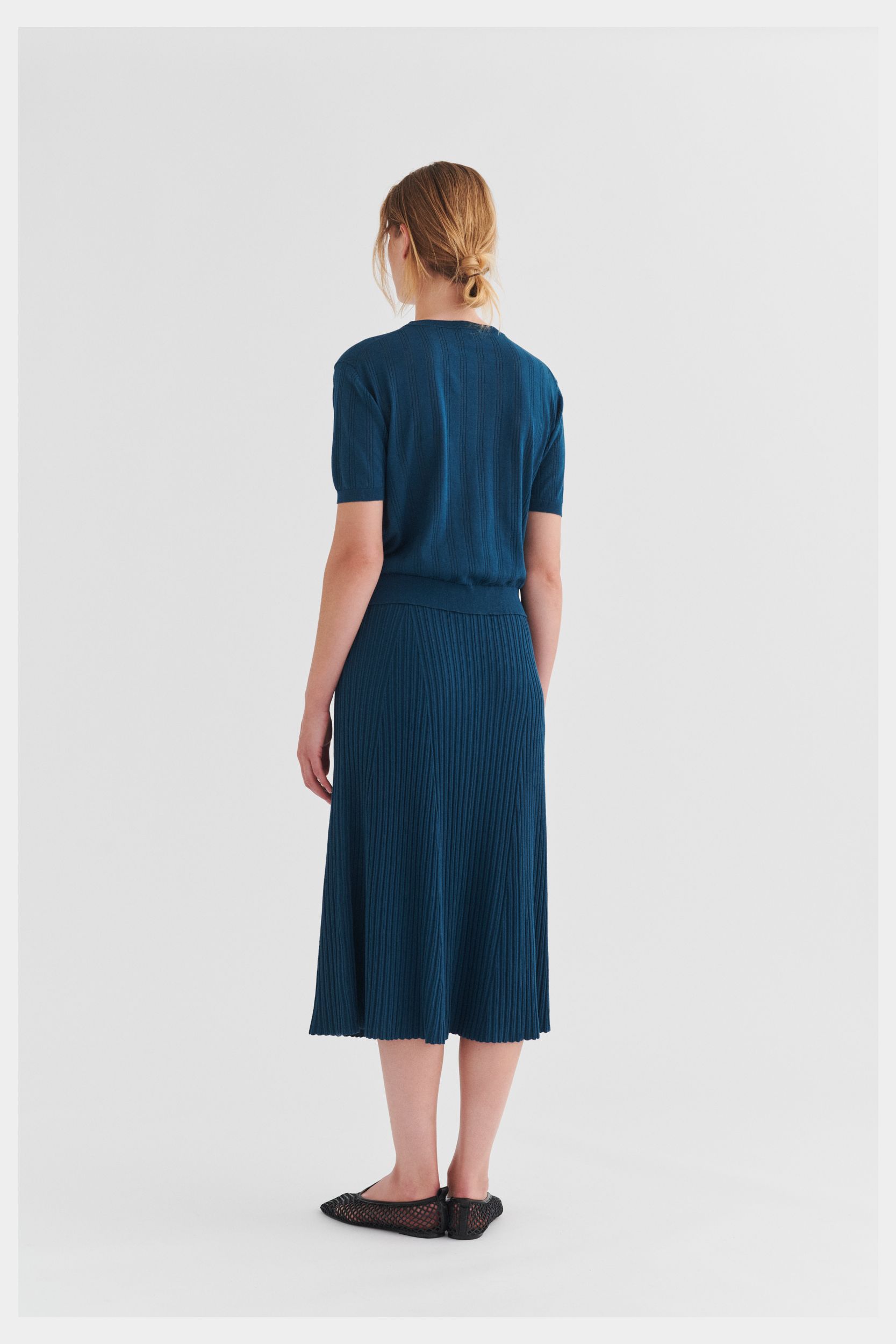 Denne knælange nederdel med let vidde er strikket i en fast ribstruktur med diskret finish forneden. Den har en bred elastikkant i taljen, som sikrer en fleksibel og komfortabel pasform. Nederdelen er strikket i et økologisk high-twist bomuldsgarn, som er spundet hårdere end vores klassiske bomuld, og giver stylen et fastere, skarpere og mere formstabilt udtryk.