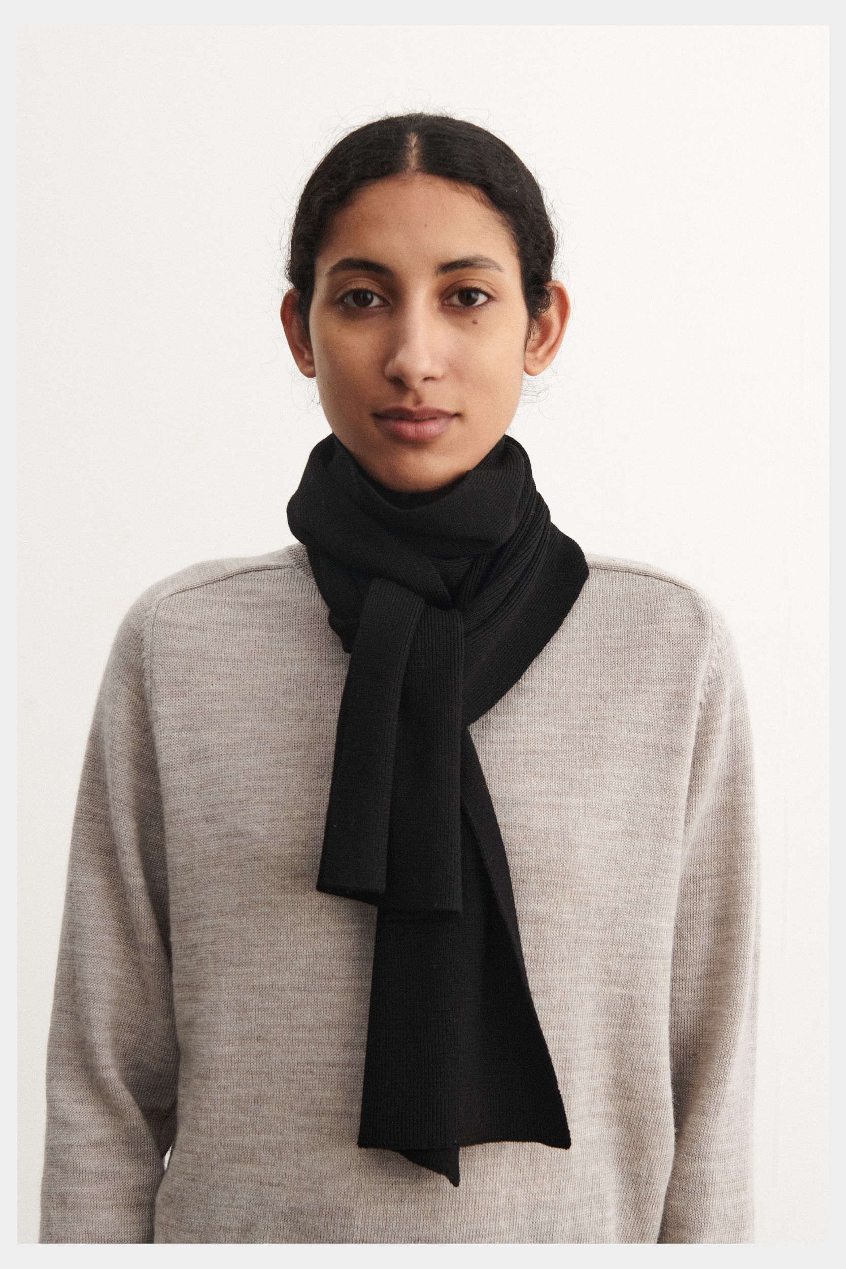 Dette halstørklæde i blød merinould er strikket i en fast 1x1 ribstruktur og er et must-have på kolde vinterdage. Tørklædet måler 25 cm x 160 cm. Vores merinould er BLUESIGN® og RWS-certificeret, fri for skadelig kemi og stammer fra får, der ikke er blevet udsat for mulesing.