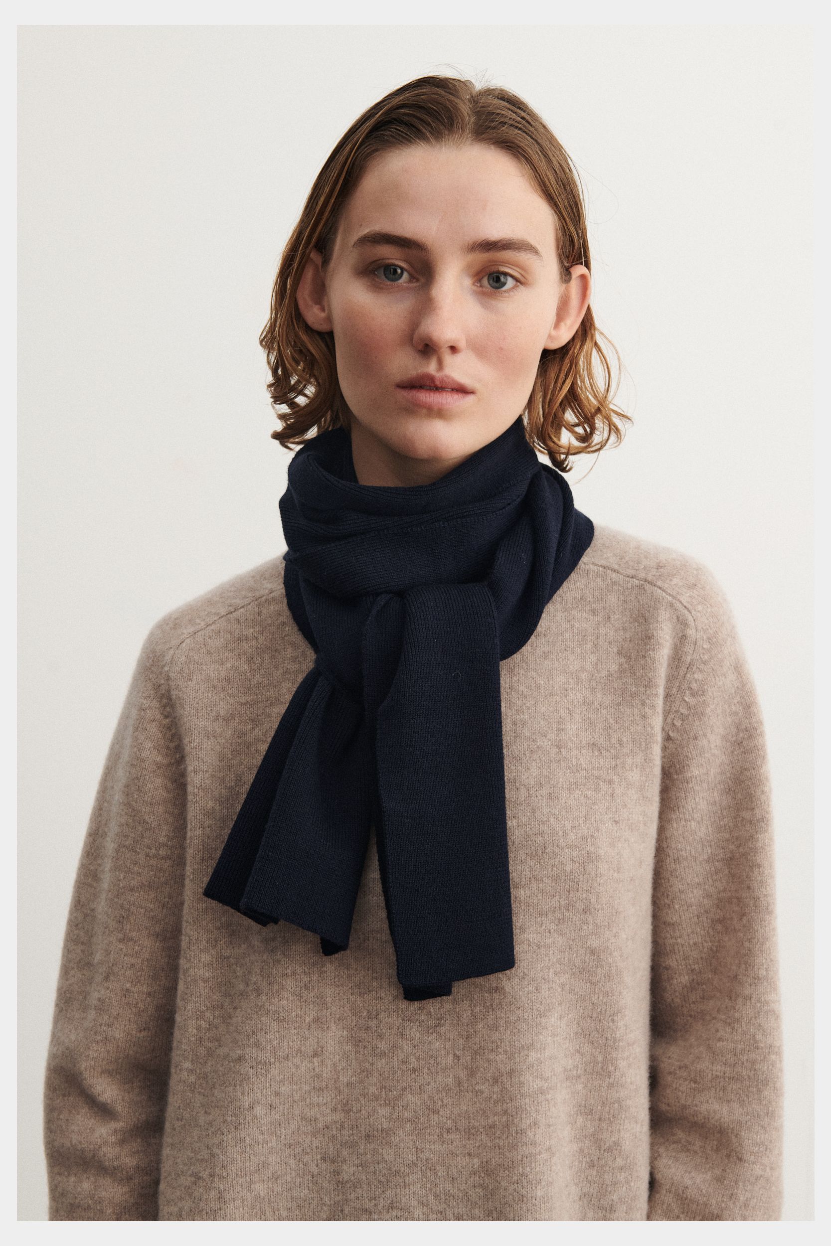 Dette halstørklæde i blød merinould er strikket i en fast 1x1 ribstruktur og er et must-have på kolde vinterdage. Tørklædet måler 25 cm x 160 cm. Vores merinould er BLUESIGN® og RWS-certificeret, fri for skadelig kemi og stammer fra får, der ikke er blevet udsat for mulesing.