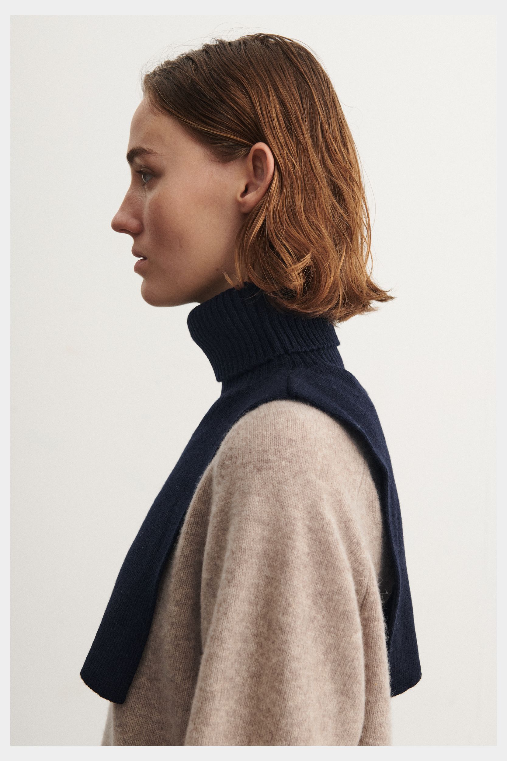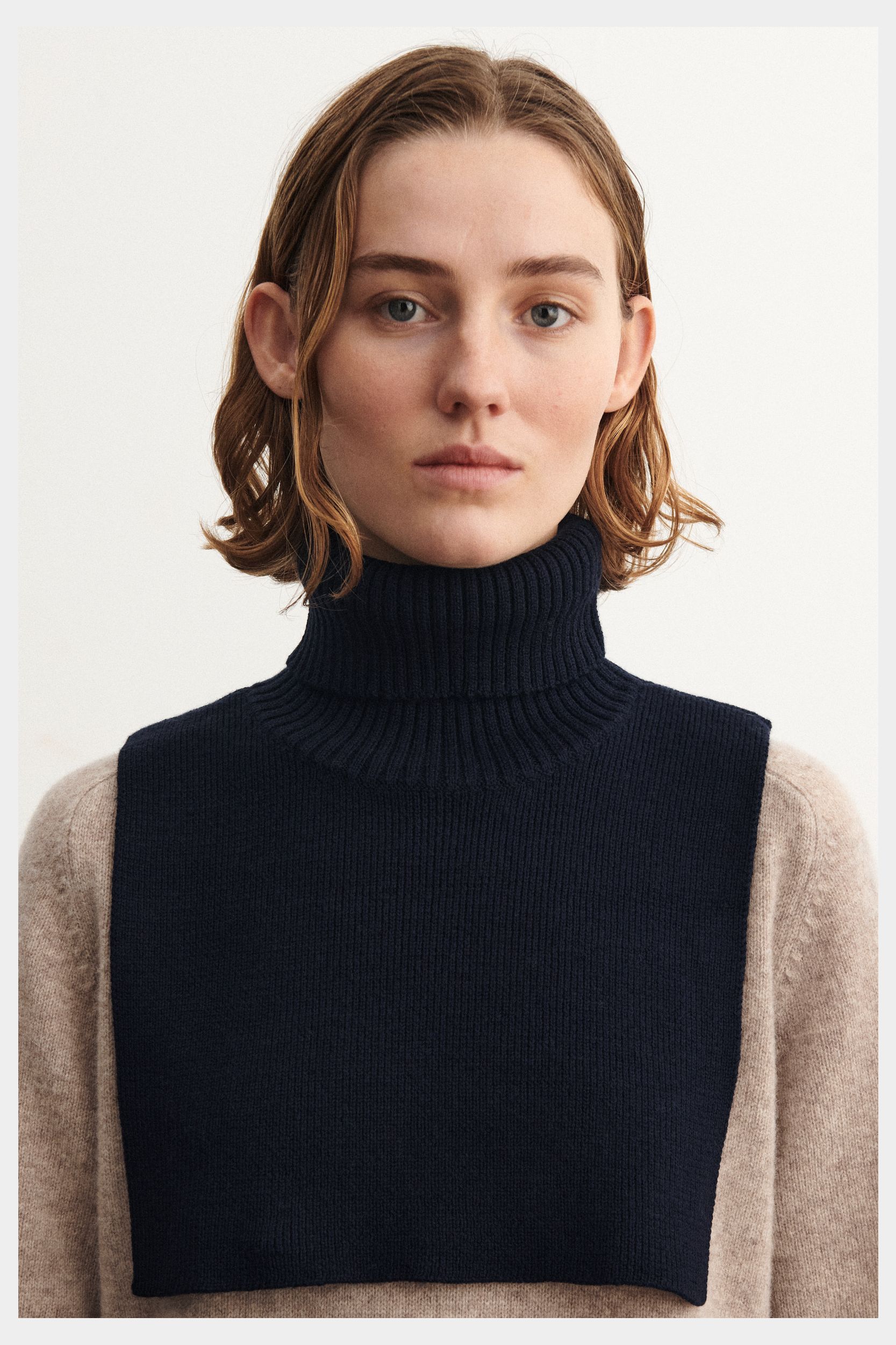 Denne halsedisse i blød merinould er strikket i en fast struktur med høj rullekrave i kraftig rib. Brug den over en sweater eller som et ekstra lag under frakken, når det er koldt. Vores merinould er BLUESIGN® og RWS-certificeret, fri for skadelig kemi og stammer fra får, der ikke er blevet udsat for mulesing.