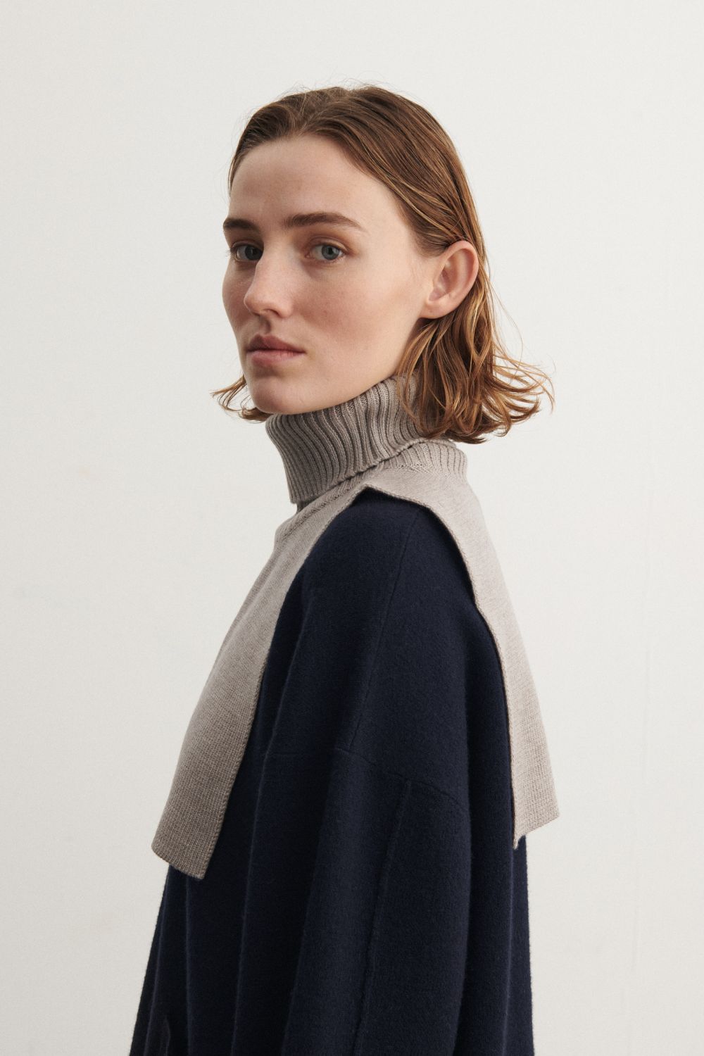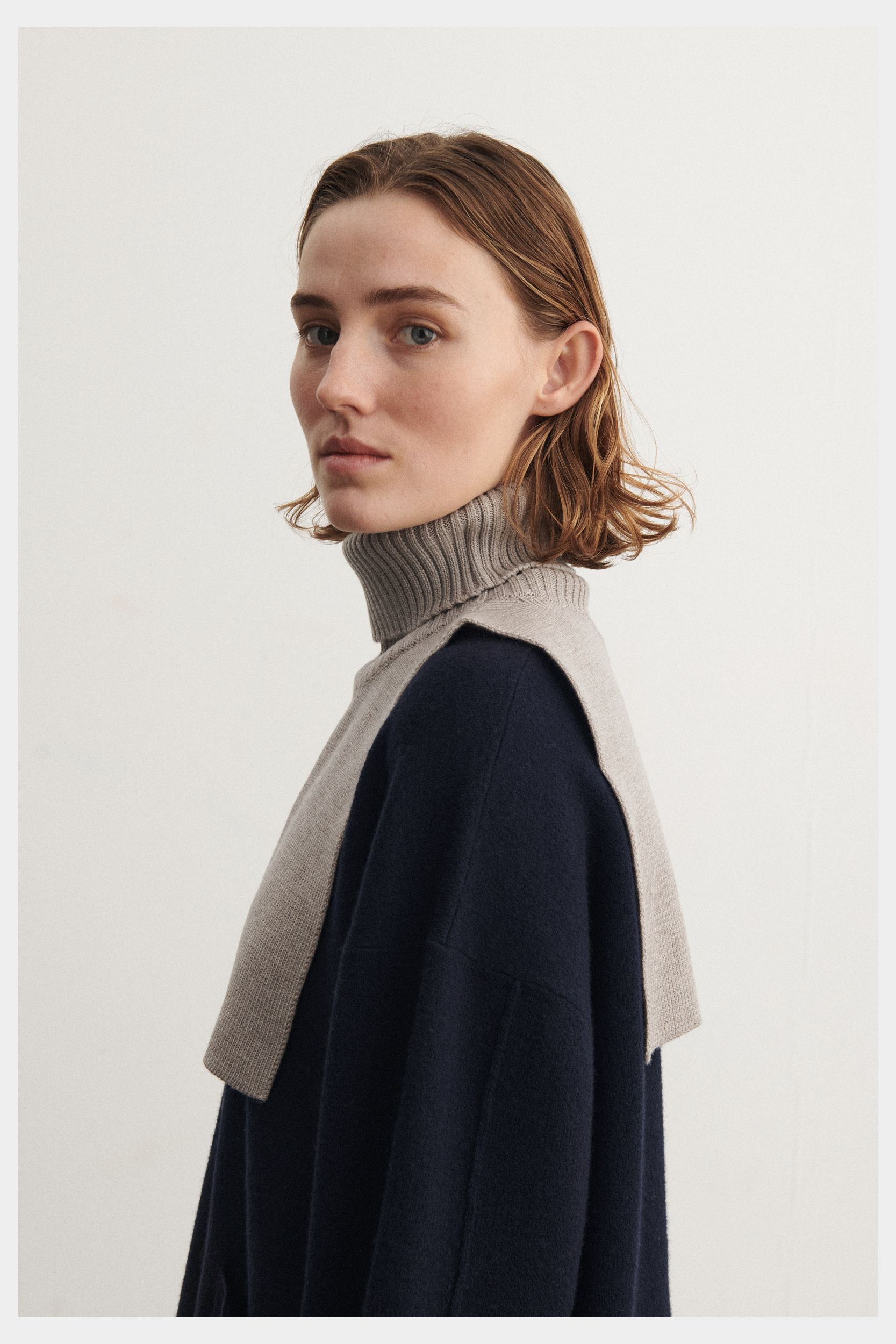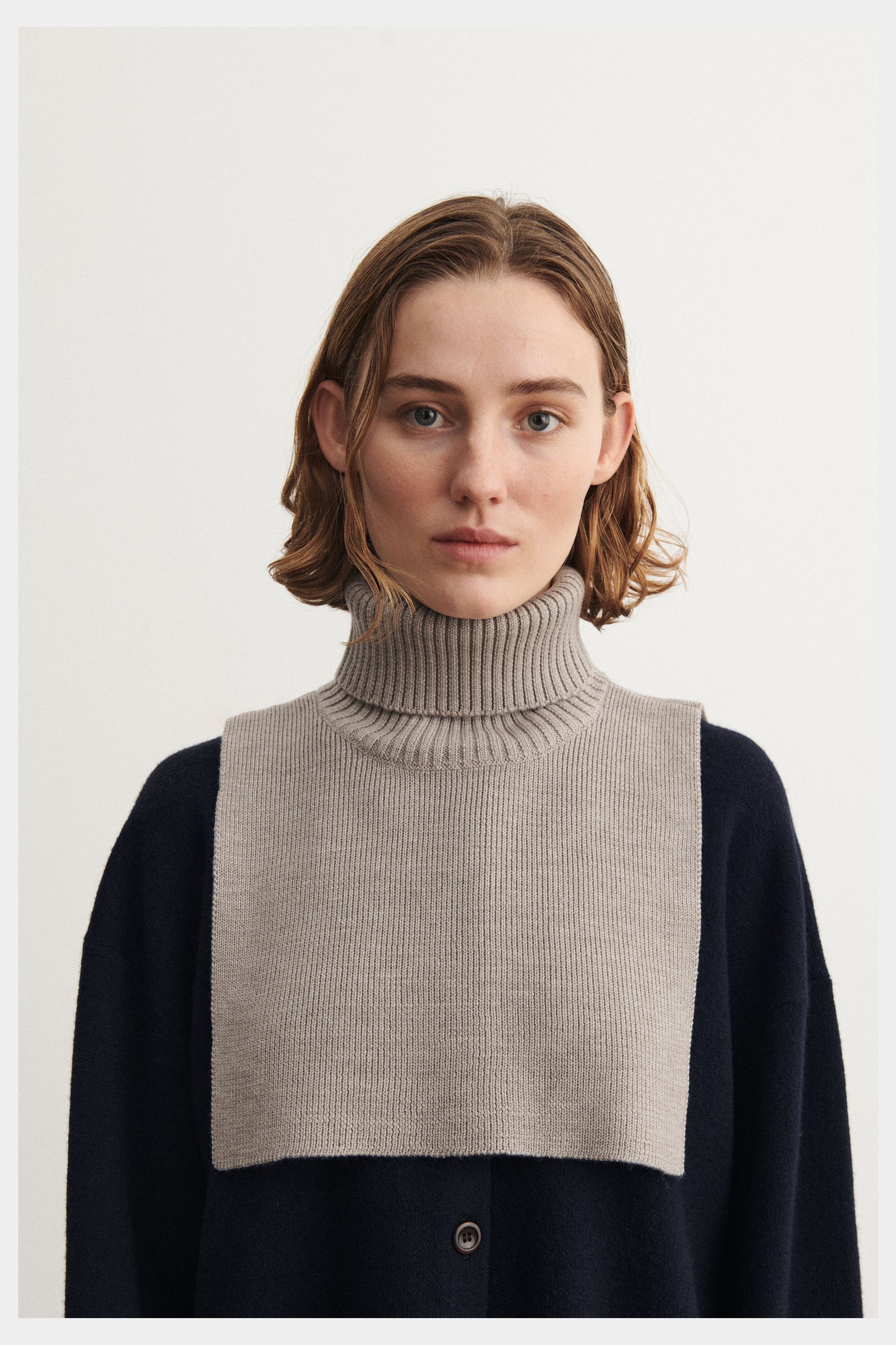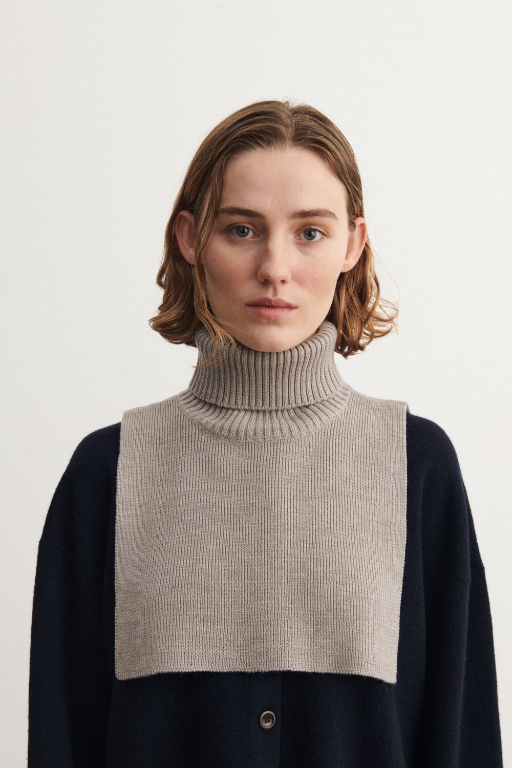 Denne halsedisse i blød merinould er strikket i en fast struktur med høj rullekrave i kraftig rib. Brug den over en sweater eller som et ekstra lag under frakken, når det er koldt. Vores merinould er BLUESIGN® og RWS-certificeret, fri for skadelig kemi og stammer fra får, der ikke er blevet udsat for mulesing.