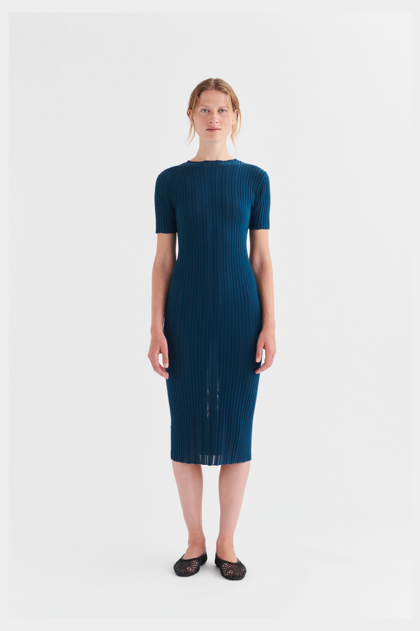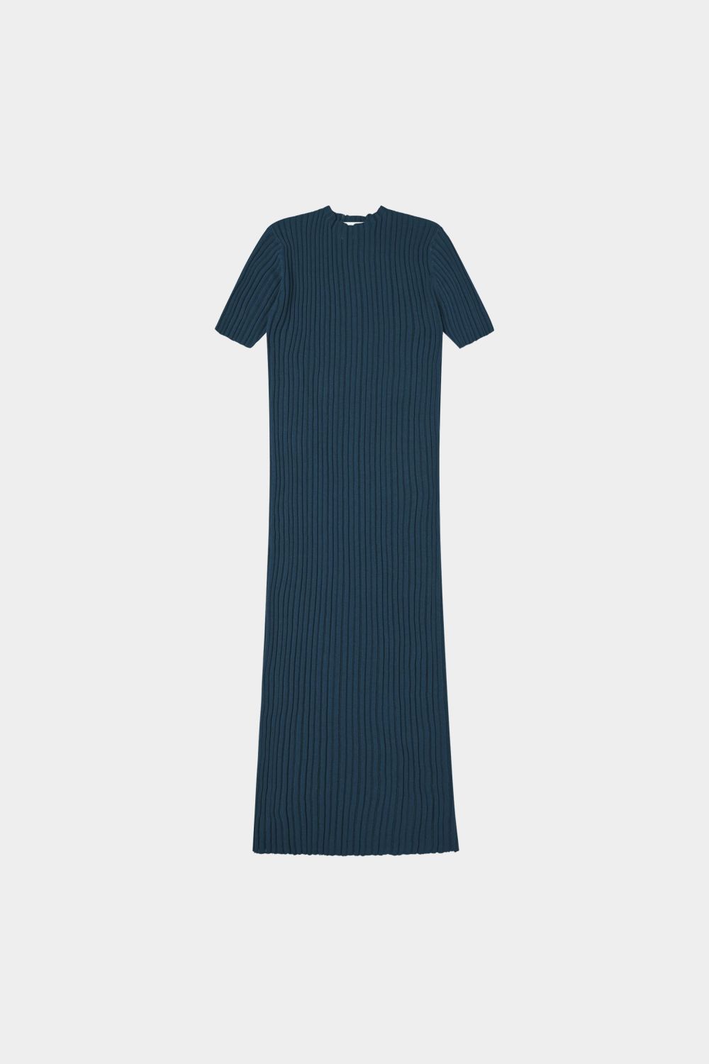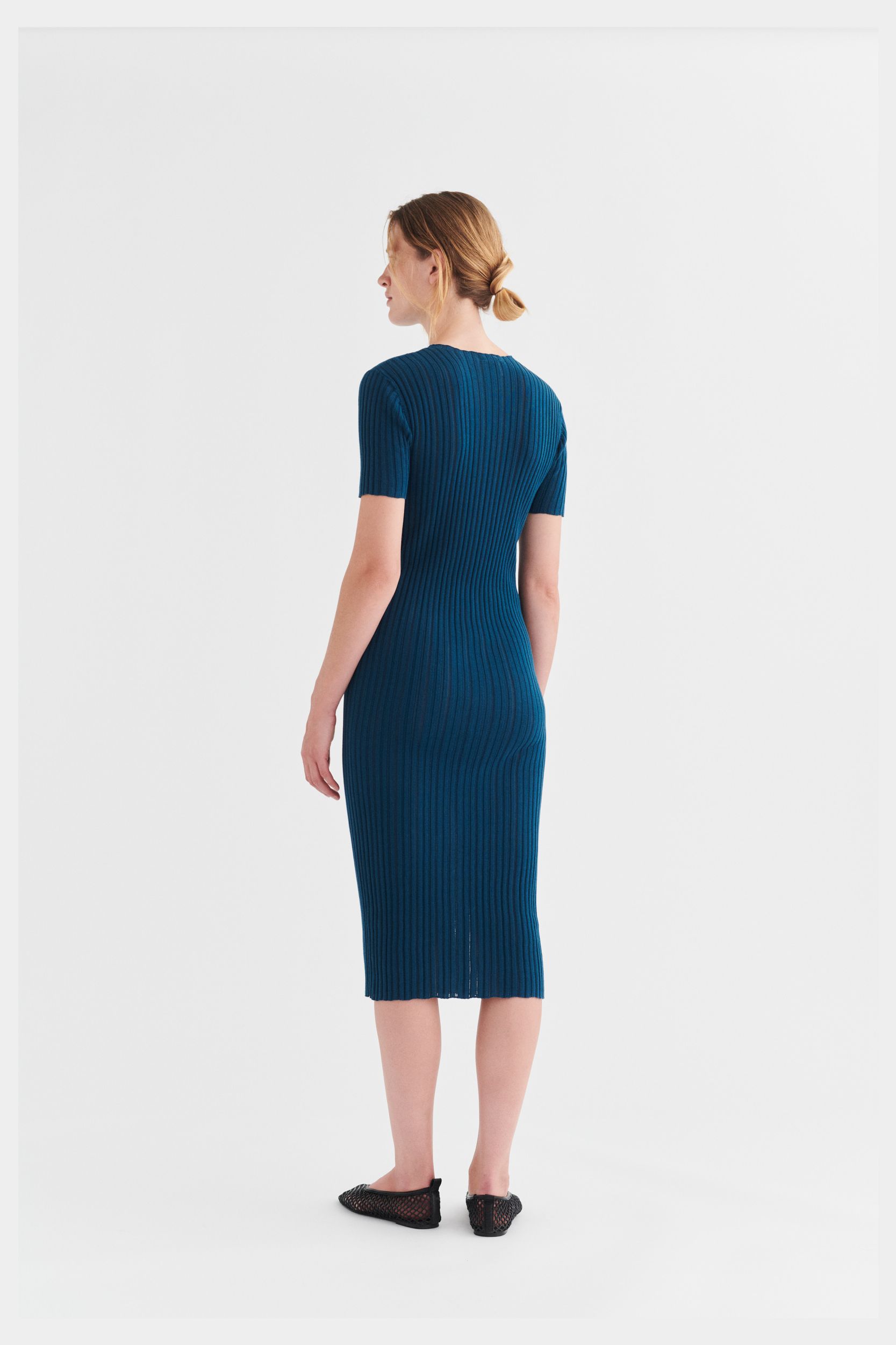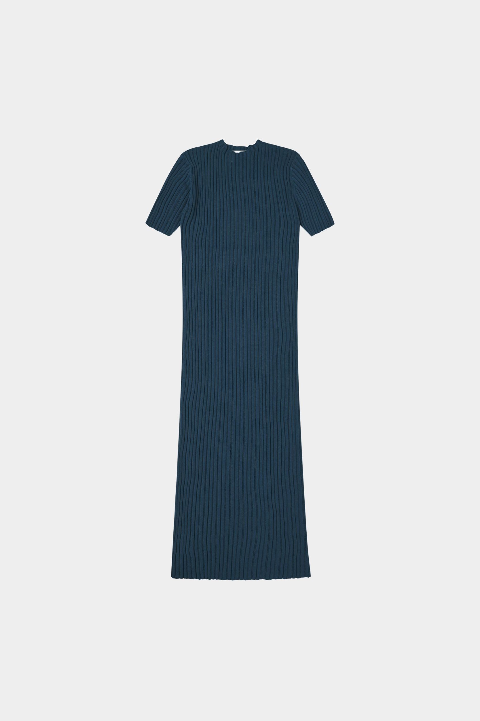 Denne kortærmede kjole er strikket i en fin pointelle ribstruktur og har en lige pasform. Den er detaljeret med høj hals, diskret finish på ærmerne og forneden og en længde til lige under knæet. Kjolen er strikket i et økologisk high-twist bomuldsgarn, som er spundet hårdere end vores klassiske bomuld, og giver stylen et fastere, skarpere og mere formstabilt udtryk.