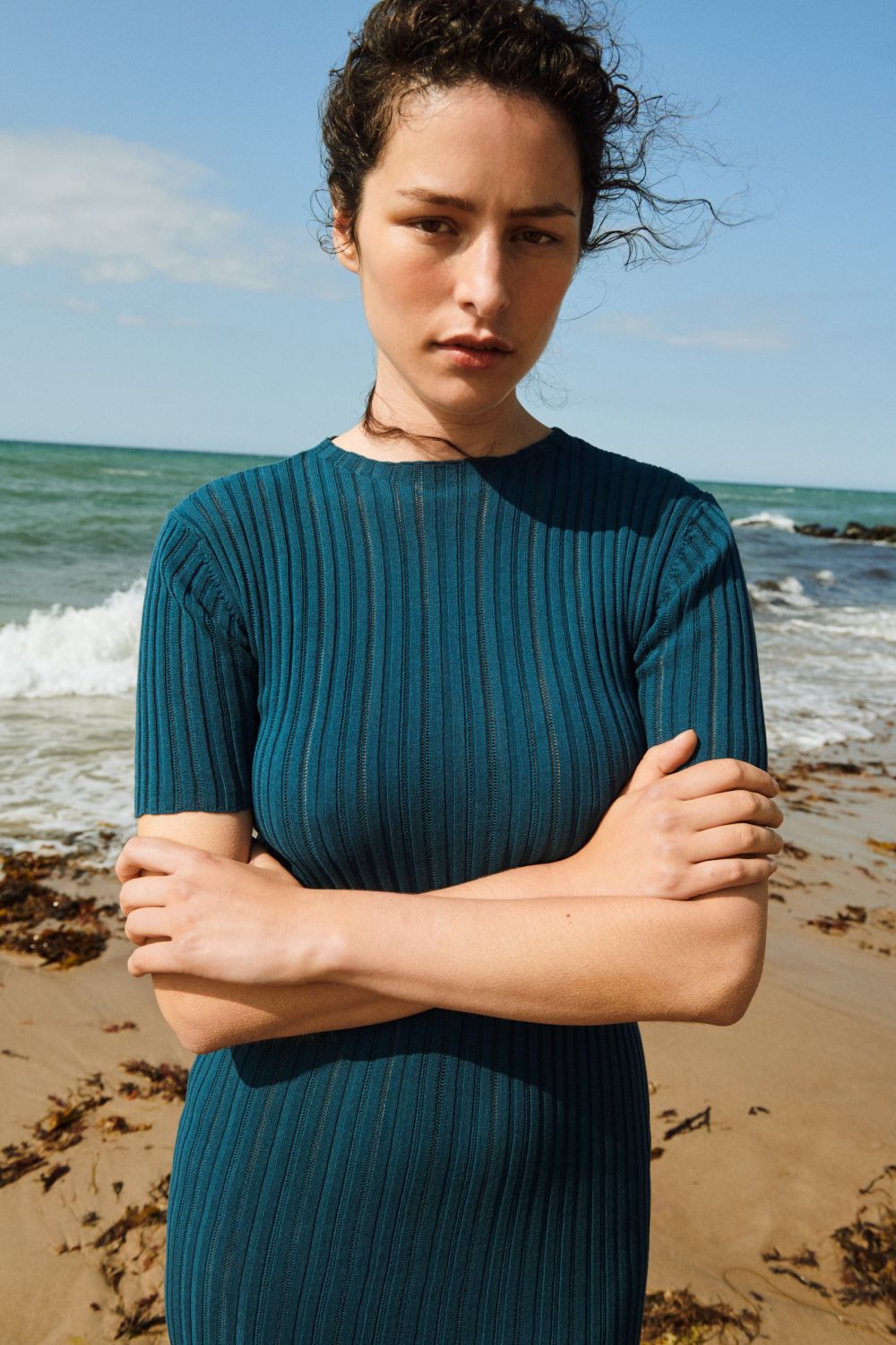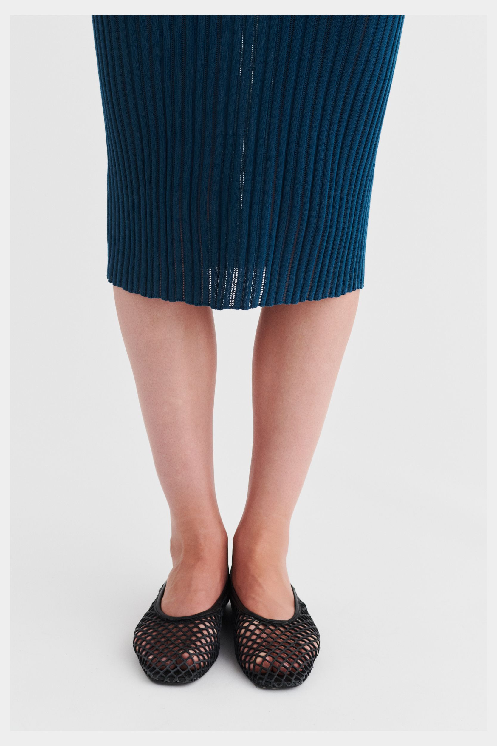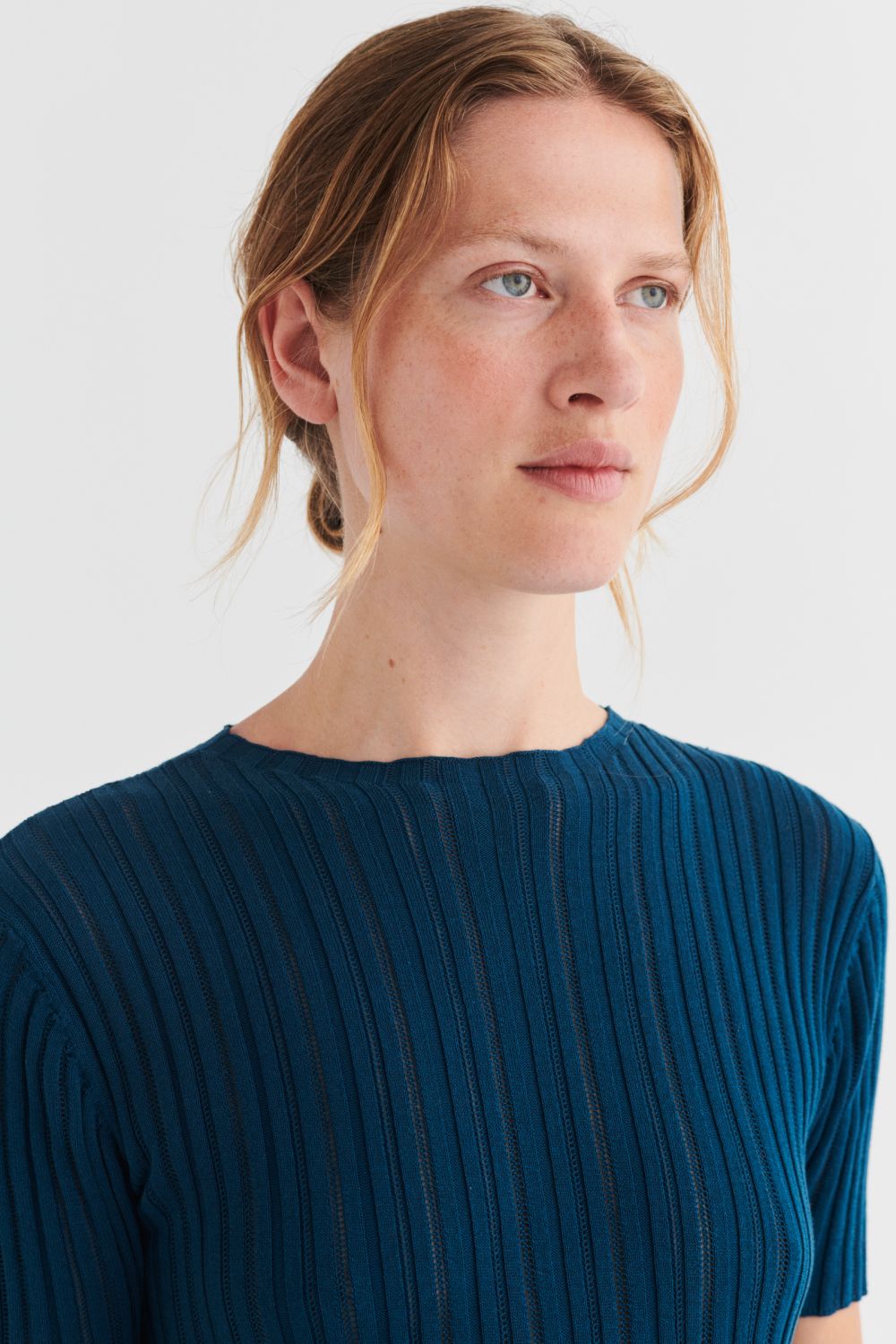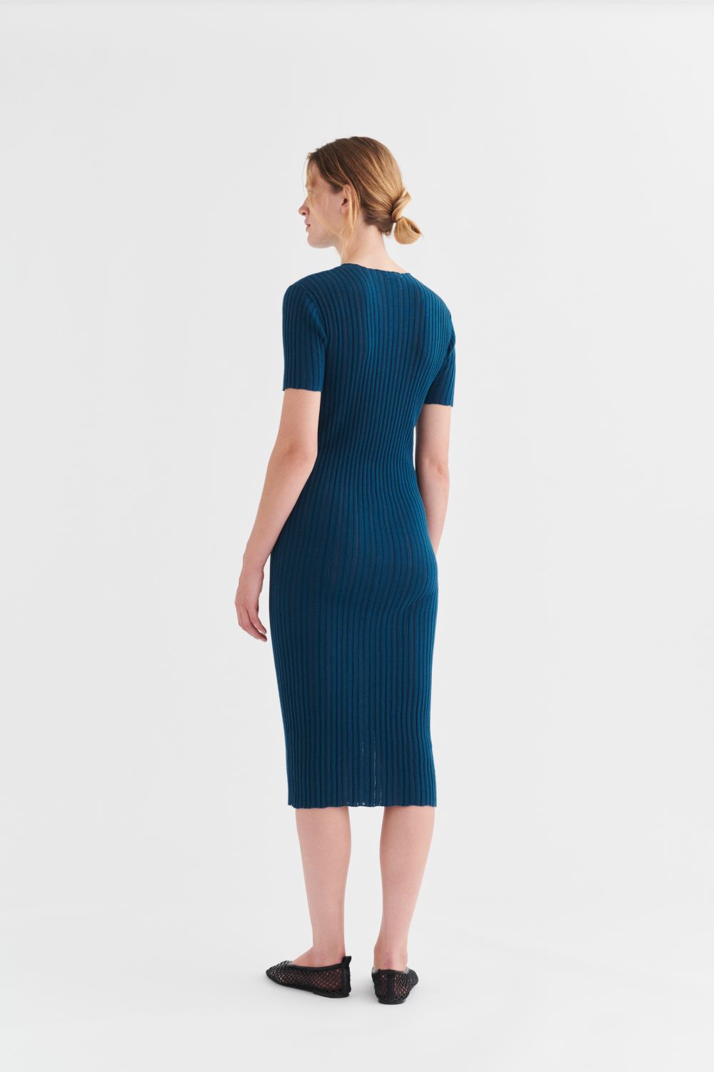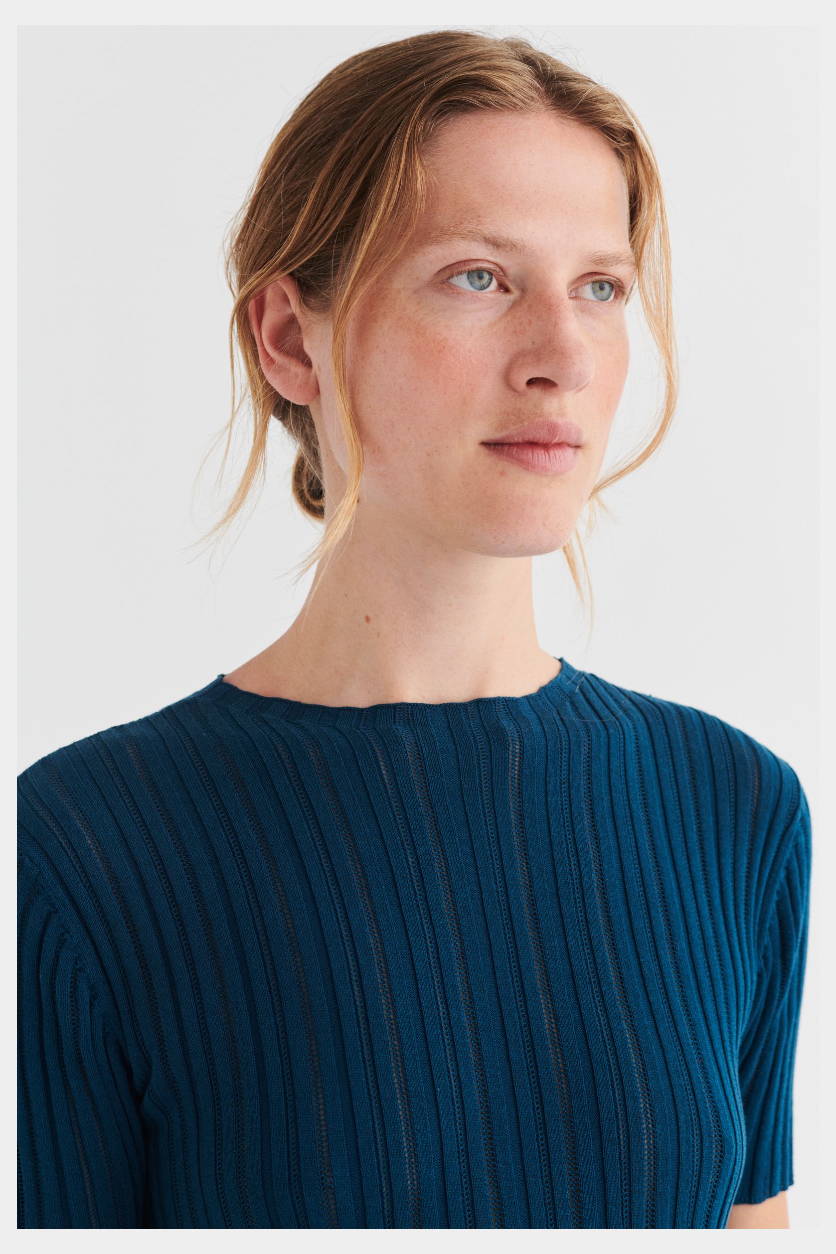 Denne kortærmede kjole er strikket i en fin pointelle ribstruktur og har en lige pasform. Den er detaljeret med høj hals, diskret finish på ærmerne og forneden og en længde til lige under knæet. Kjolen er strikket i et økologisk high-twist bomuldsgarn, som er spundet hårdere end vores klassiske bomuld, og giver stylen et fastere, skarpere og mere formstabilt udtryk.
