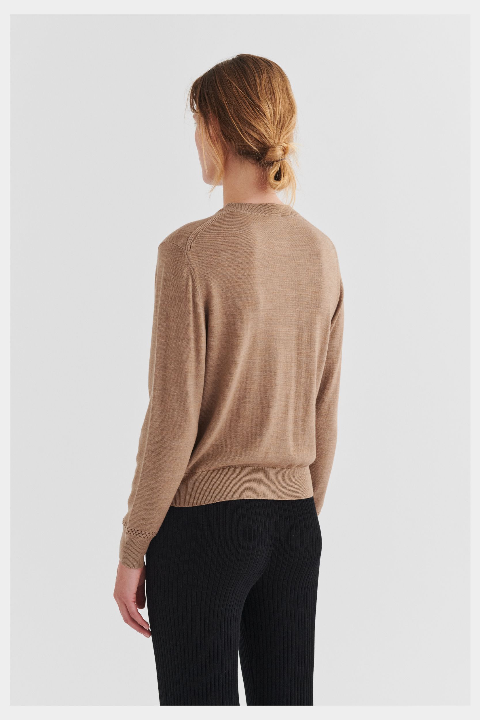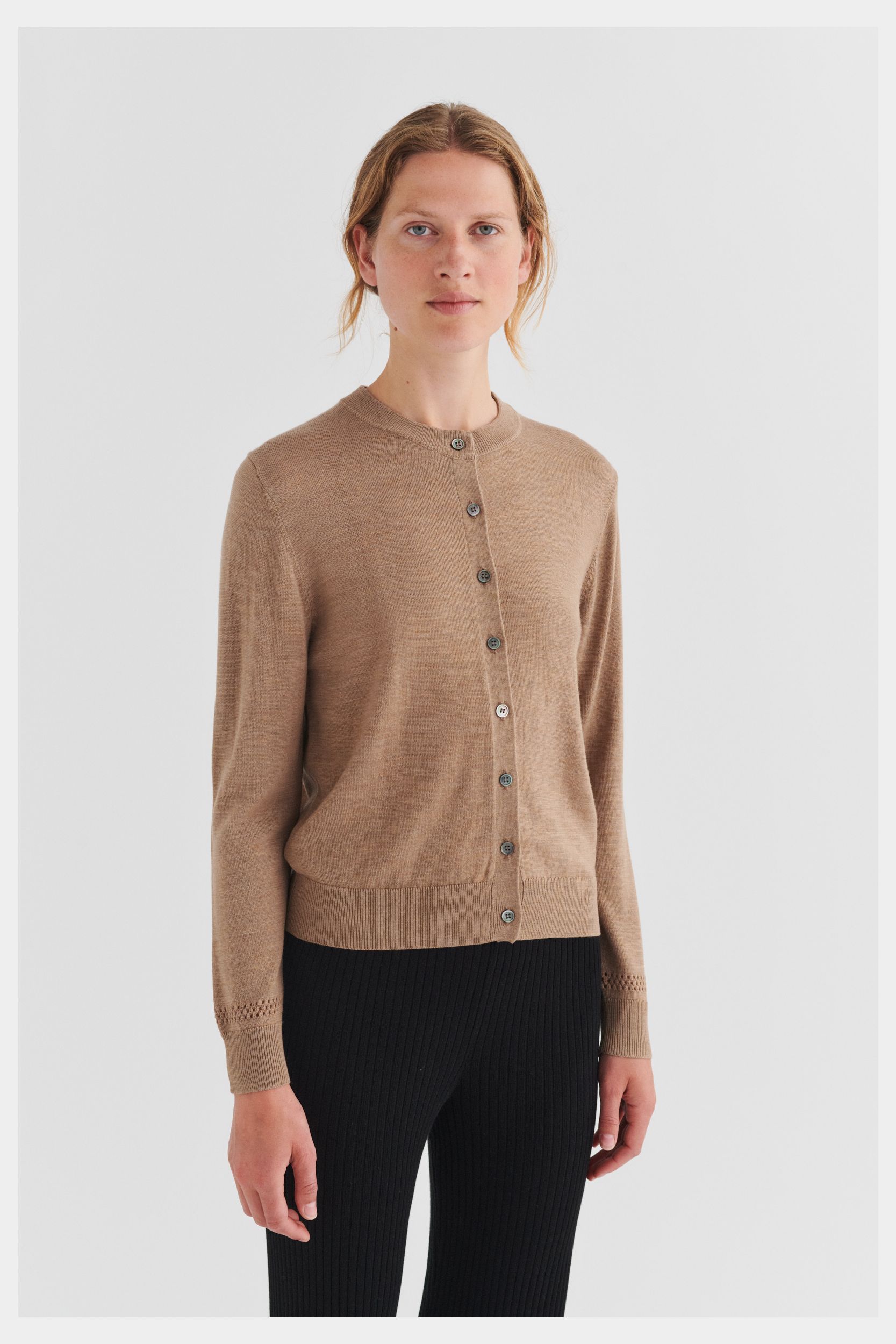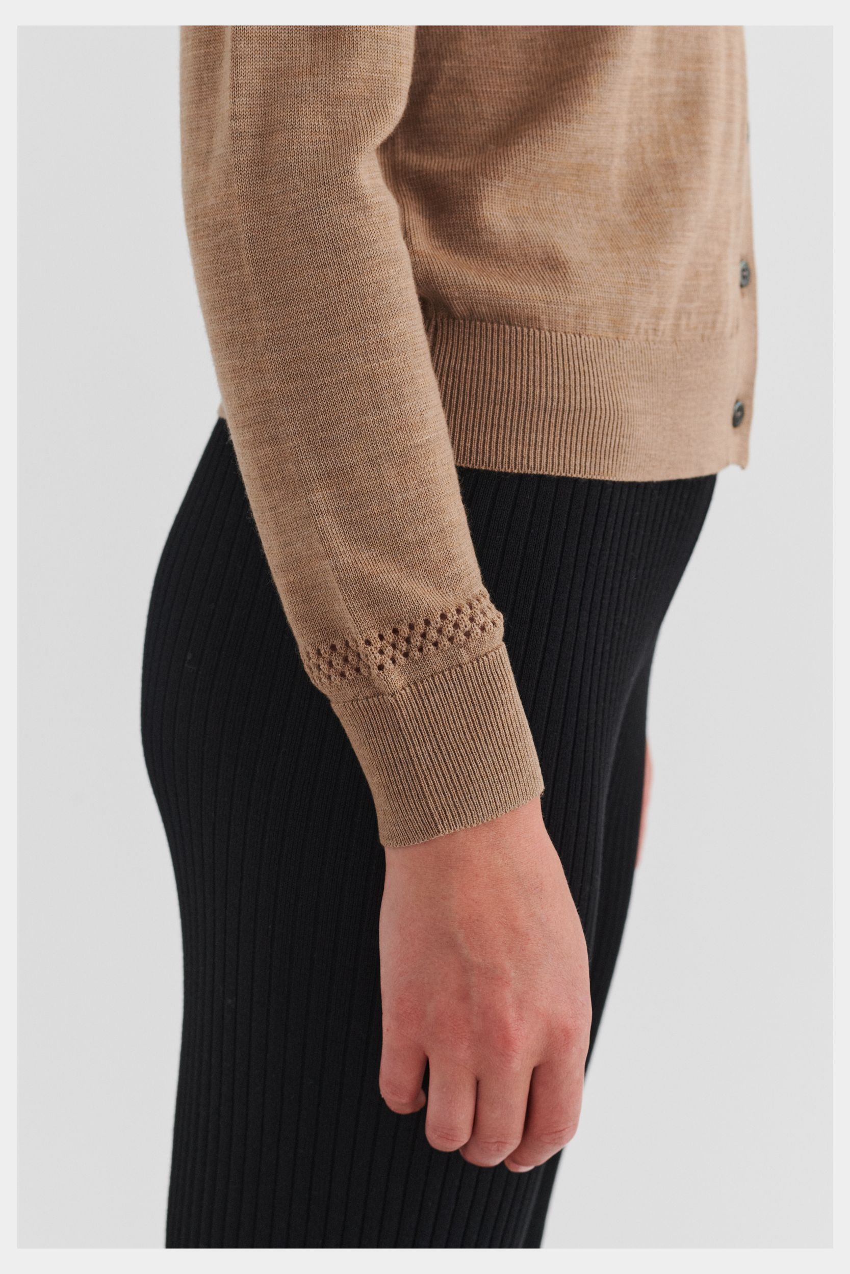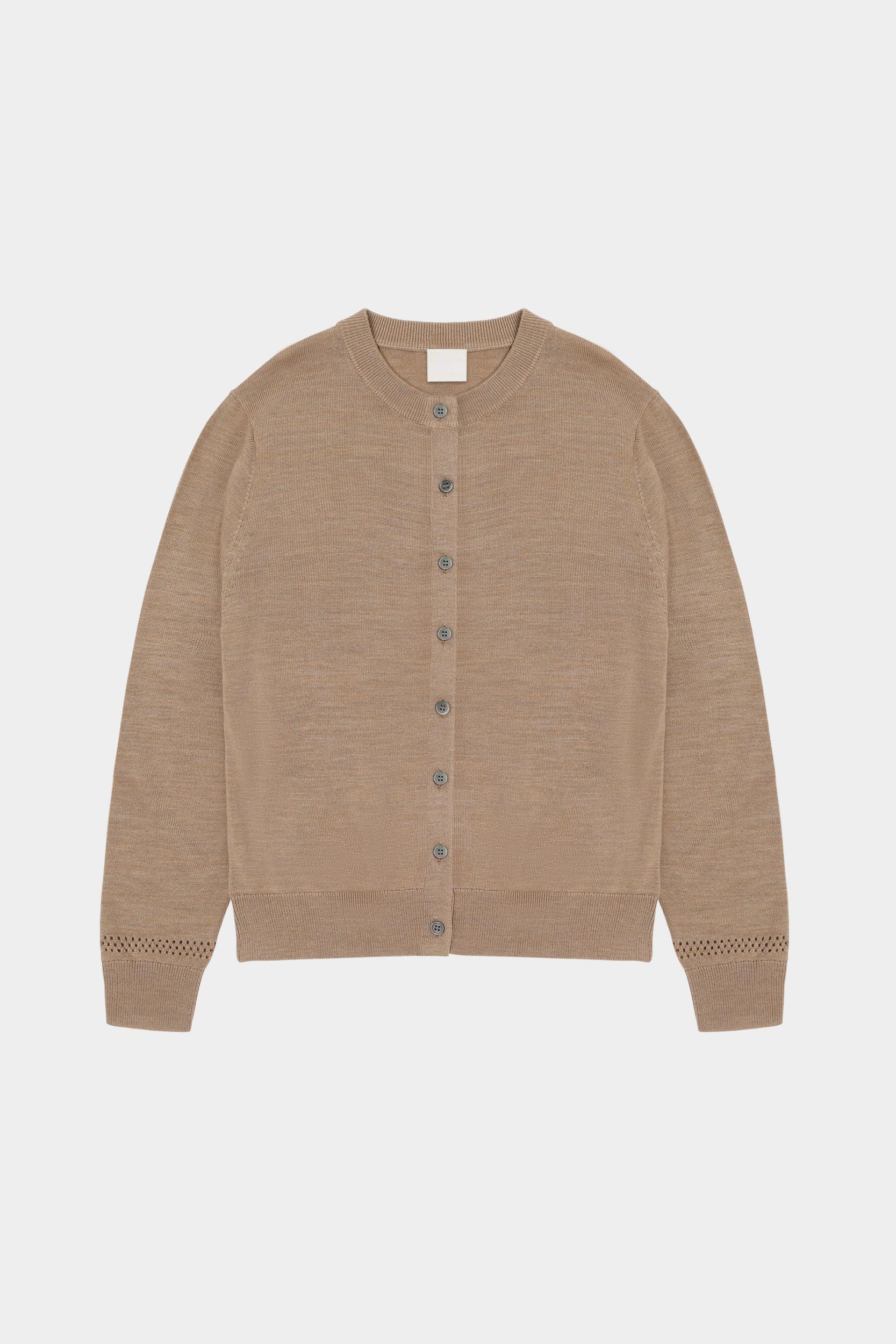 Denne cardigan i ren merinould er strikket i klassisk single jersey med en dekorativ pointelledetalje på den nederste del af ærmerne. Cardiganen er designet med rund hals, ribkanter ved ærmer og forneden og en almindelig pasform. Den har knaplukning foran med perlemorsknapper. Vores merinould er BLUESIGN®- og RWS-certificeret, fri for skadelige kemi og stammer fra får, der ikke har været udsat for mulesing.