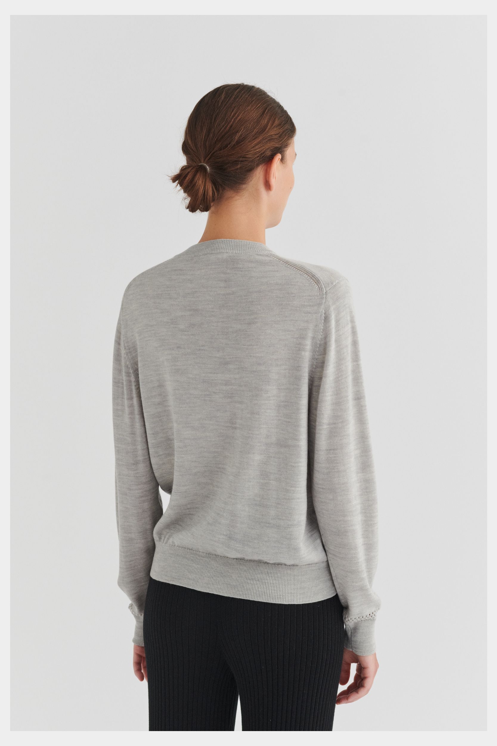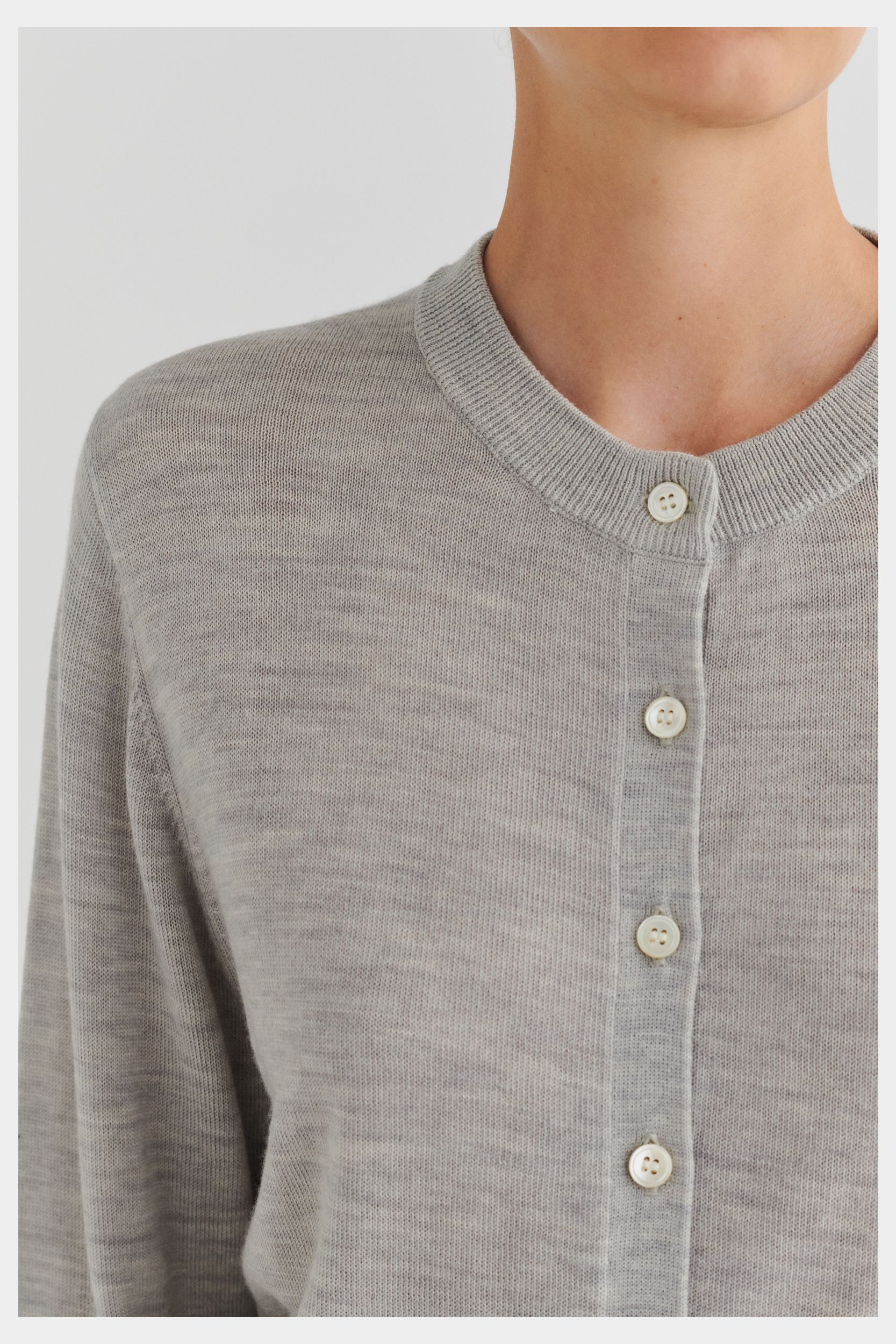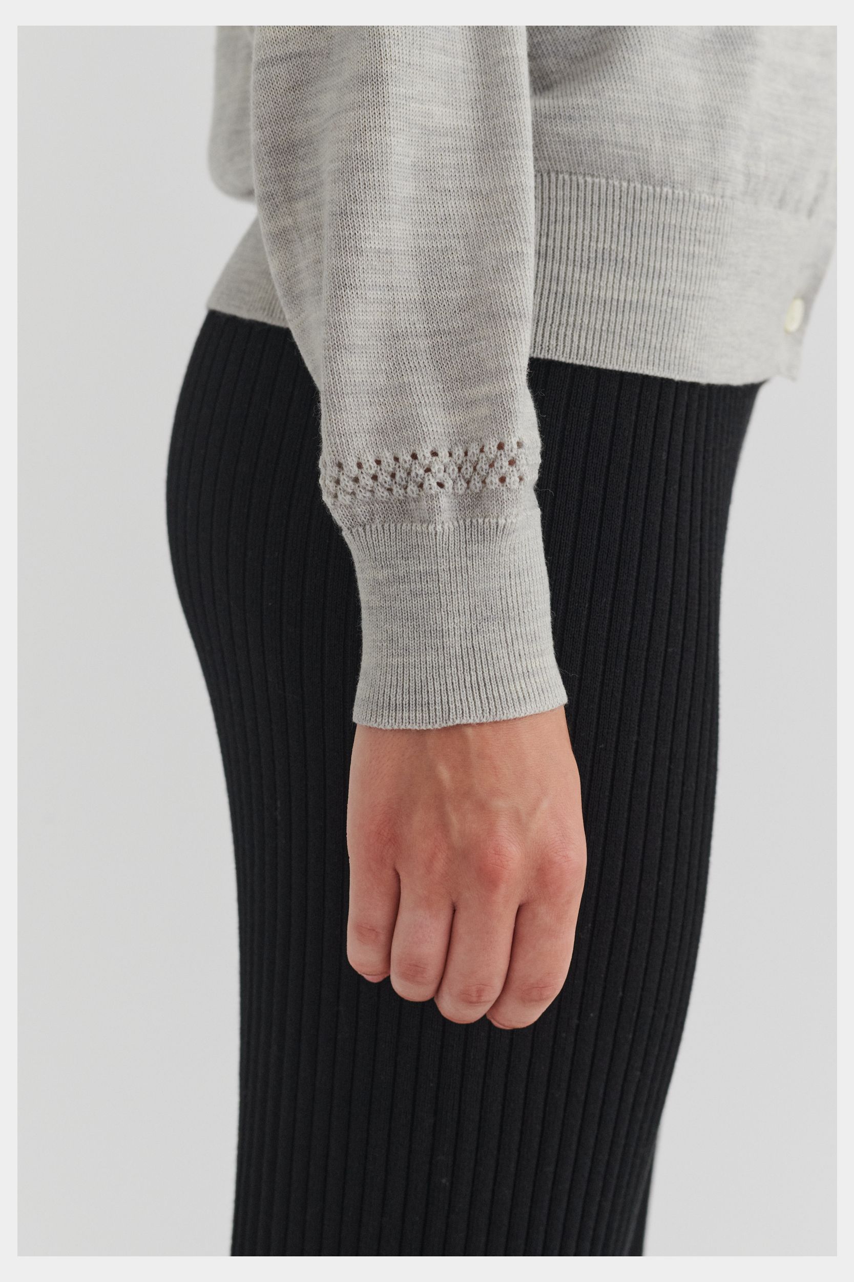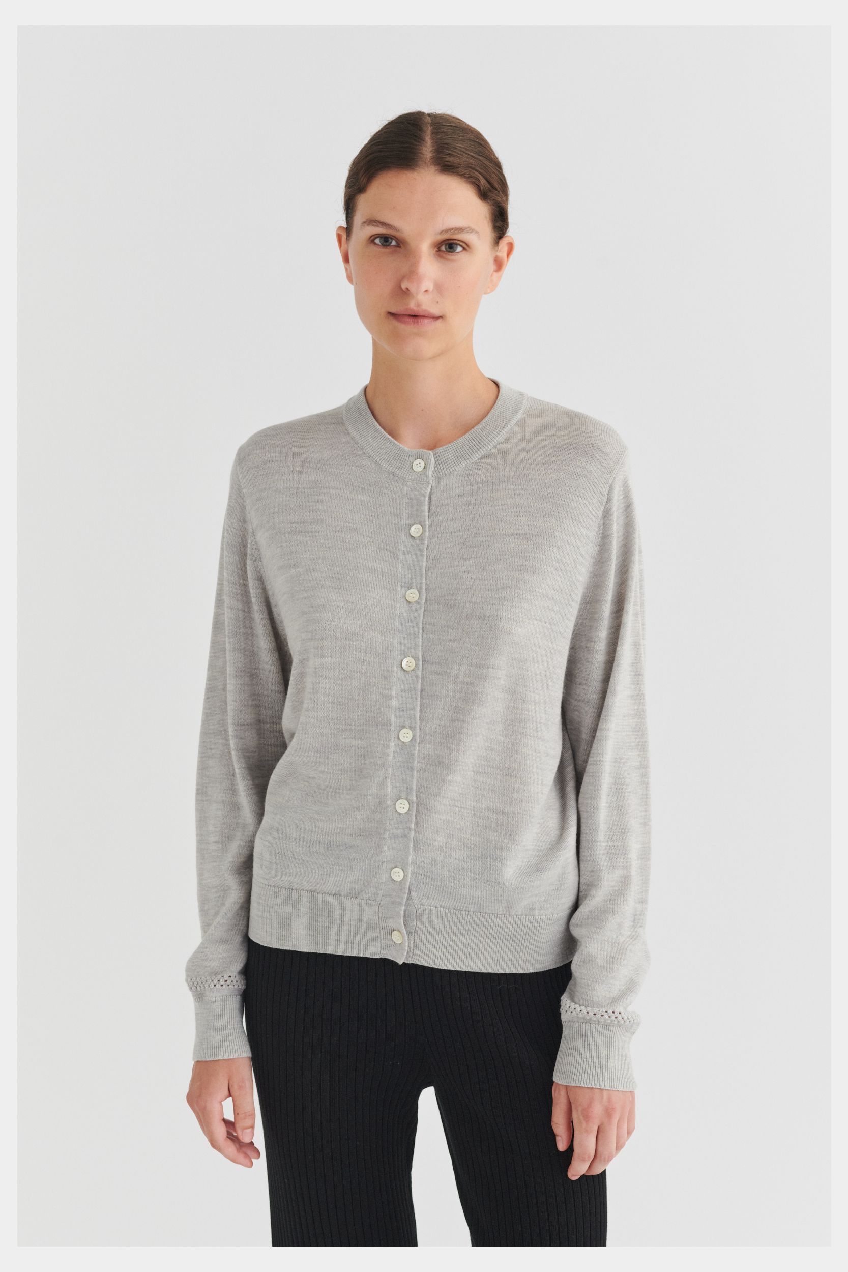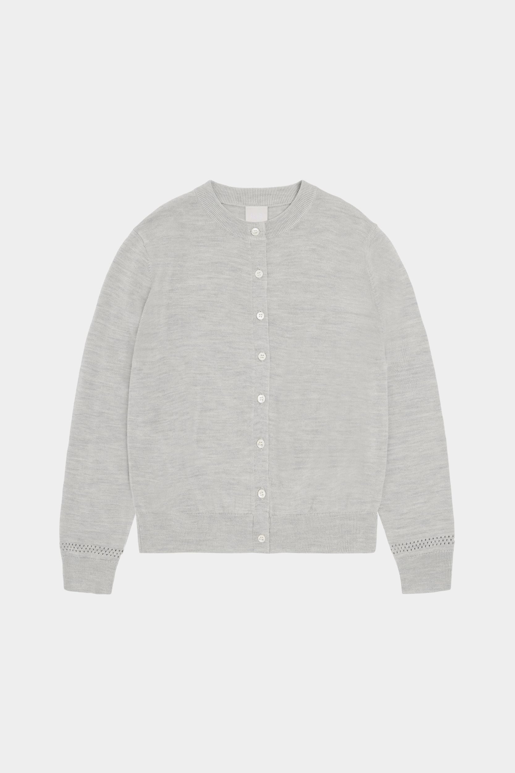 Denne cardigan i ren merinould er strikket i klassisk single jersey med en dekorativ pointelledetalje på den nederste del af ærmerne. Cardiganen er designet med rund hals, ribkanter ved ærmer og forneden og en almindelig pasform. Den har knaplukning foran med perlemorsknapper. Vores merinould er BLUESIGN®- og RWS-certificeret, fri for skadelige kemi og stammer fra får, der ikke har været udsat for mulesing.