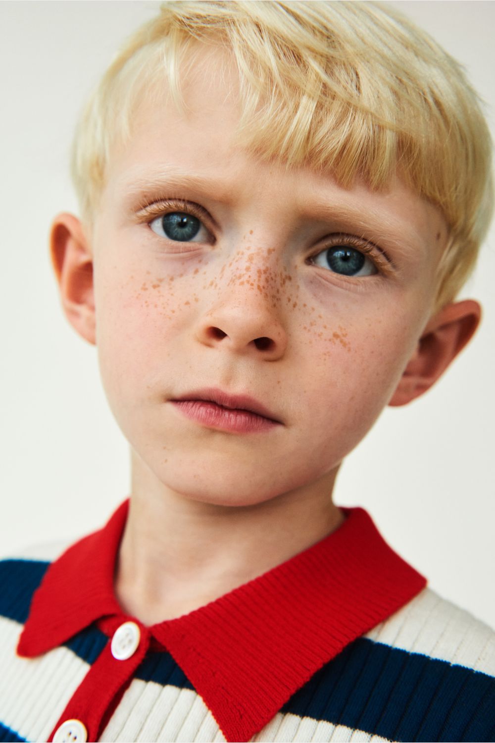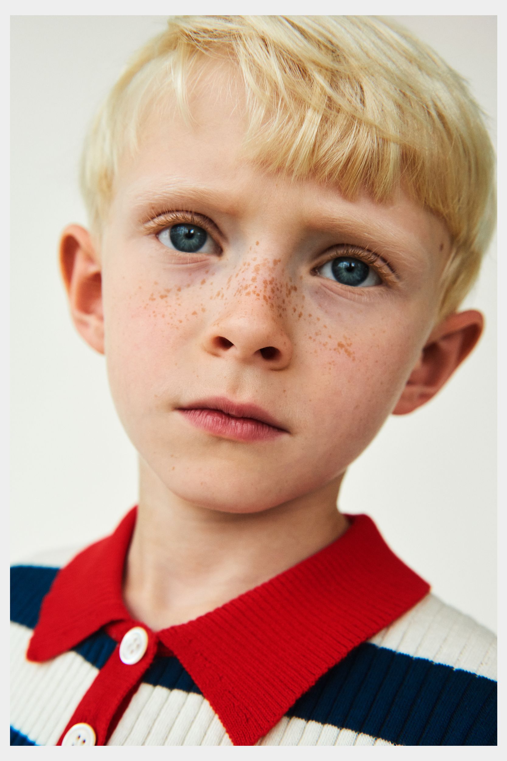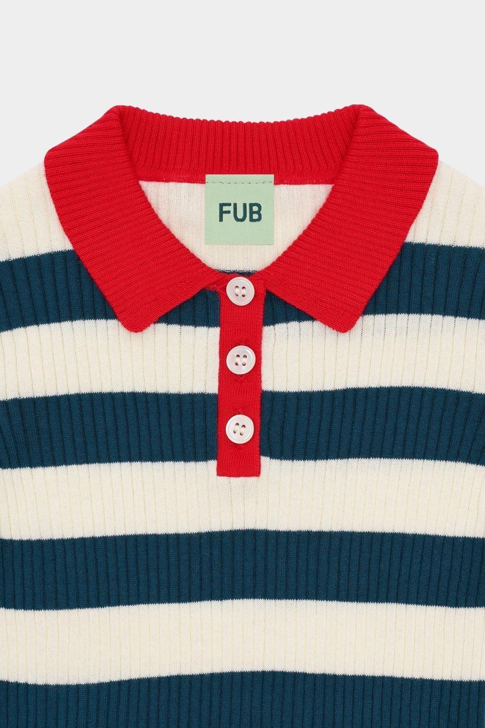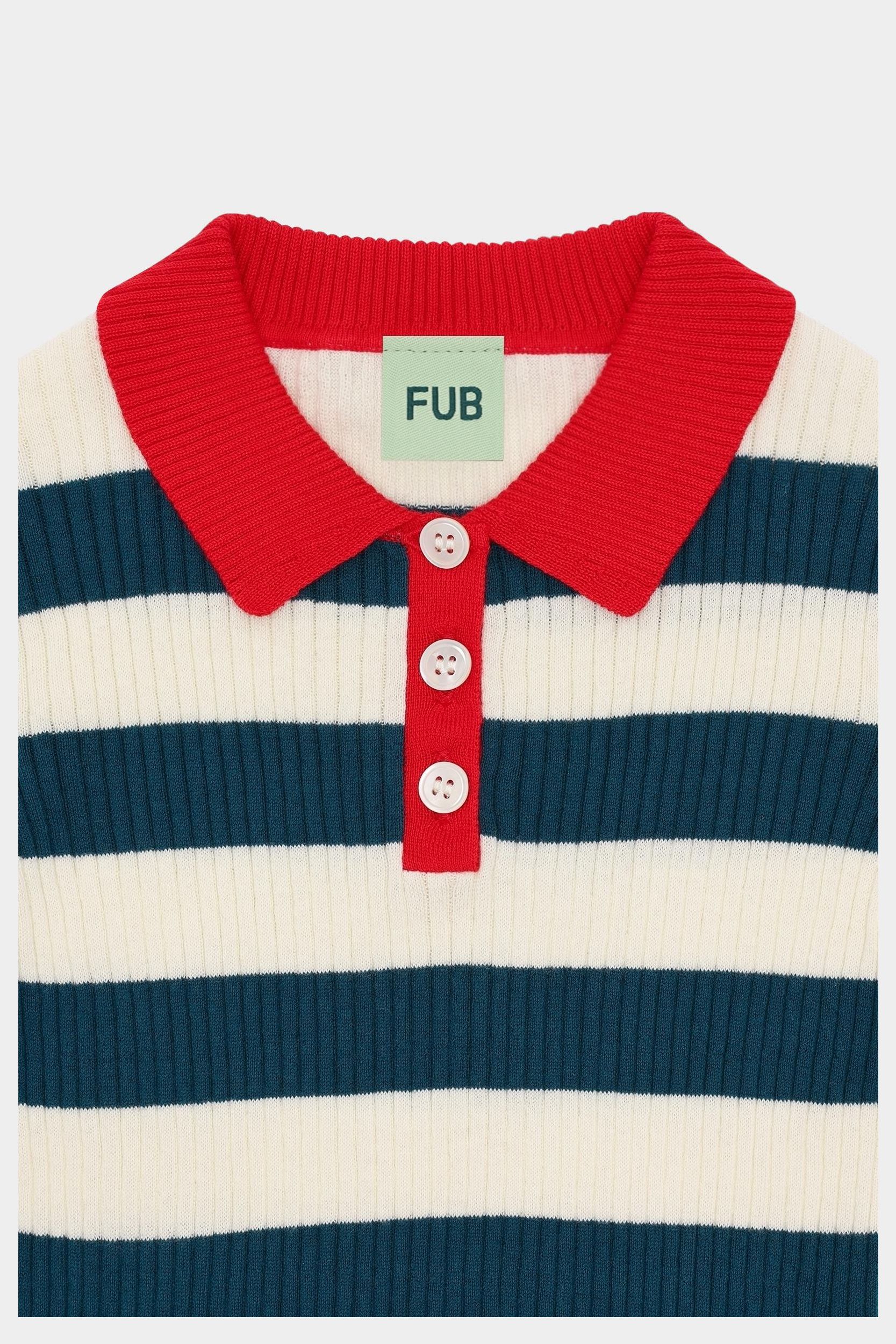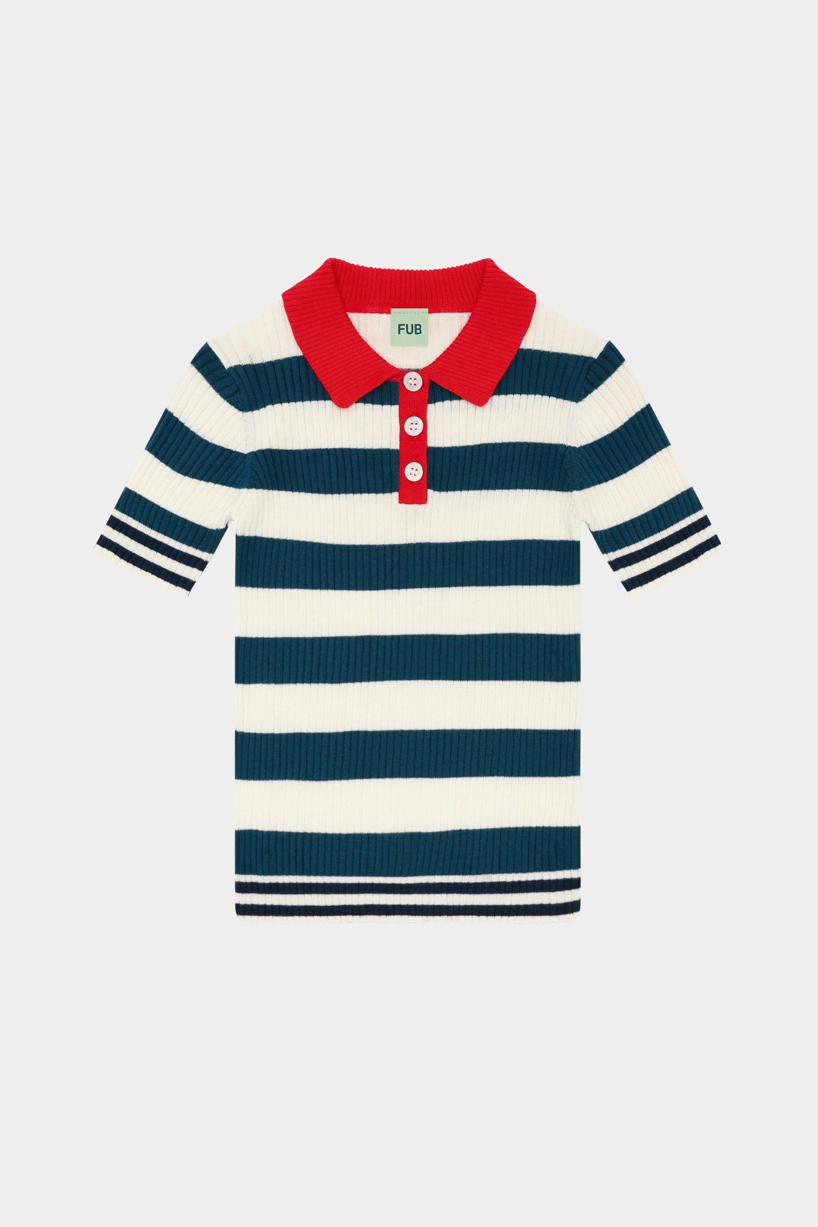 Denne kortærmede polo er strikket med brede striber og har en lille kontrastfarvet krave, frontlukning med perlemorsknapper og ribstrikkede kanter med smalle striber. Poloen har en lige, smal pasform og er lavet af økologisk bomuld.