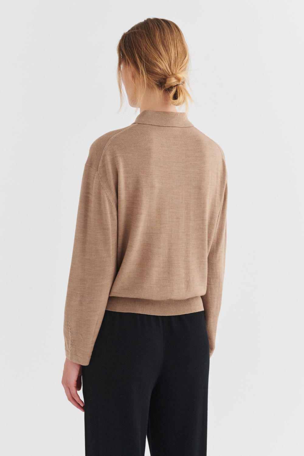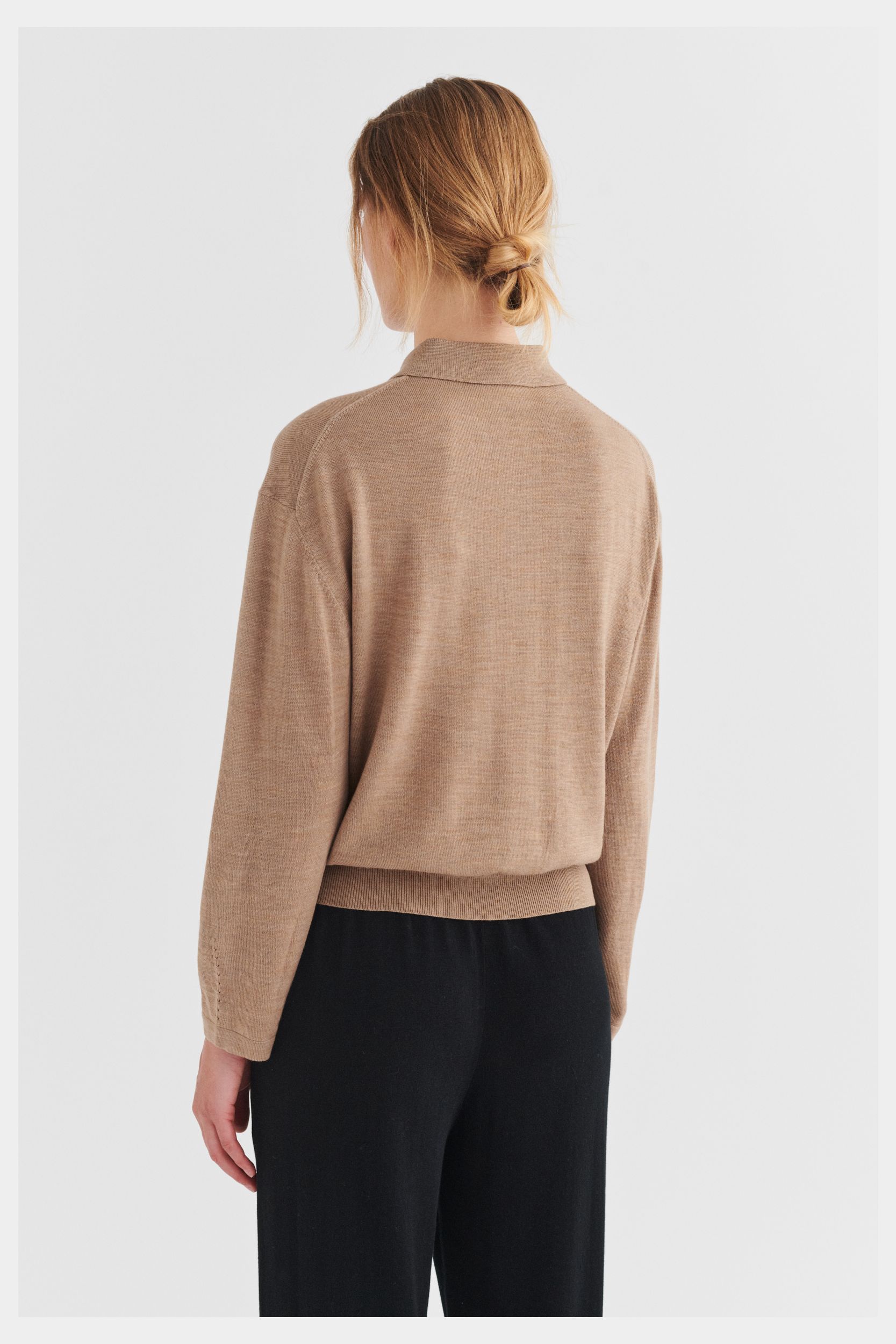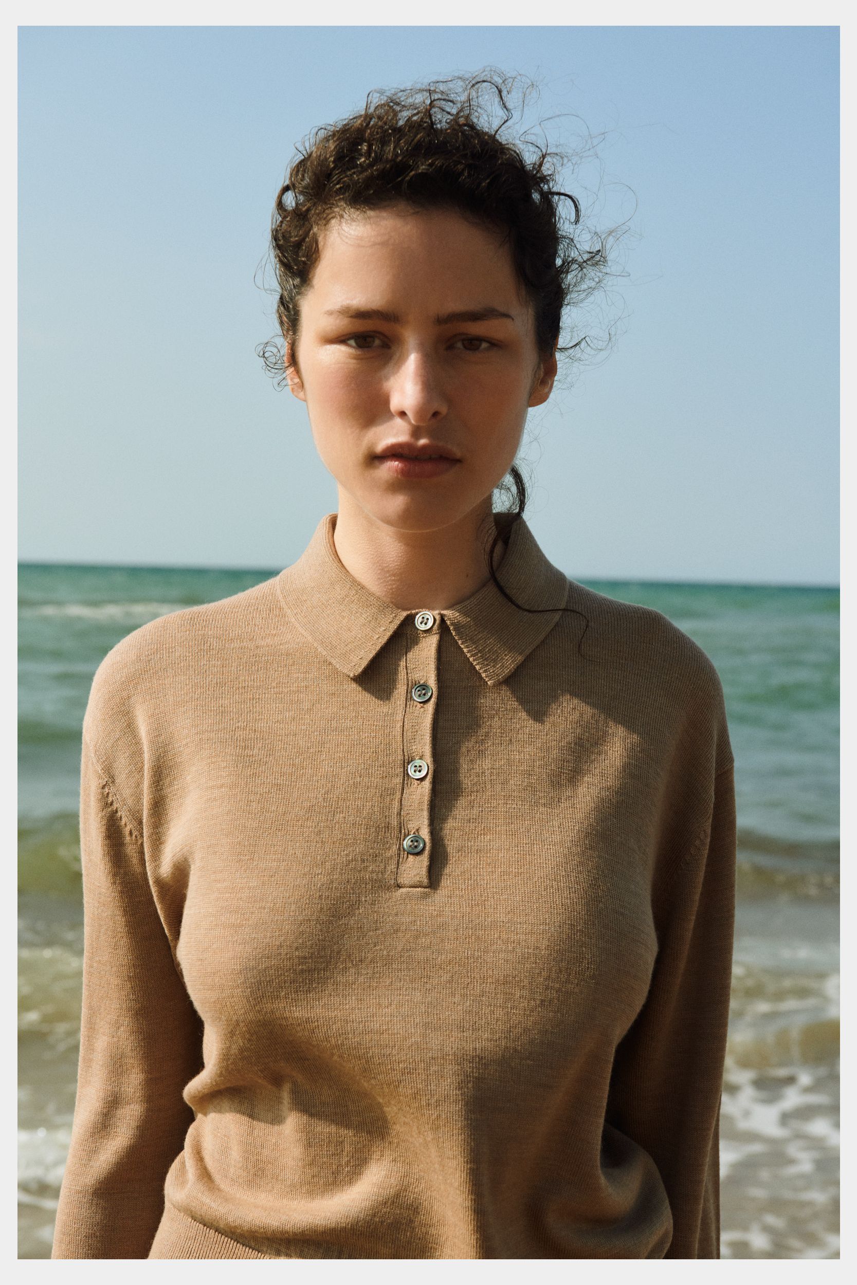 Denne langærmede polo i ren merinuld er designet med ombukkede ærmekanter, klassisk skjortekrave og en let løs pasform. Den er strikket i enkel single jersey og har knaplukning foran med perlemorsknapper, pointelledetaljer på den nederste del af ærmerne samt ribkant forneden. Vores merinould er BLUESIGN®- og RWS-certificeret, fri for skadelige kemi og stammer fra får, der ikke har været udsat for mulesing.