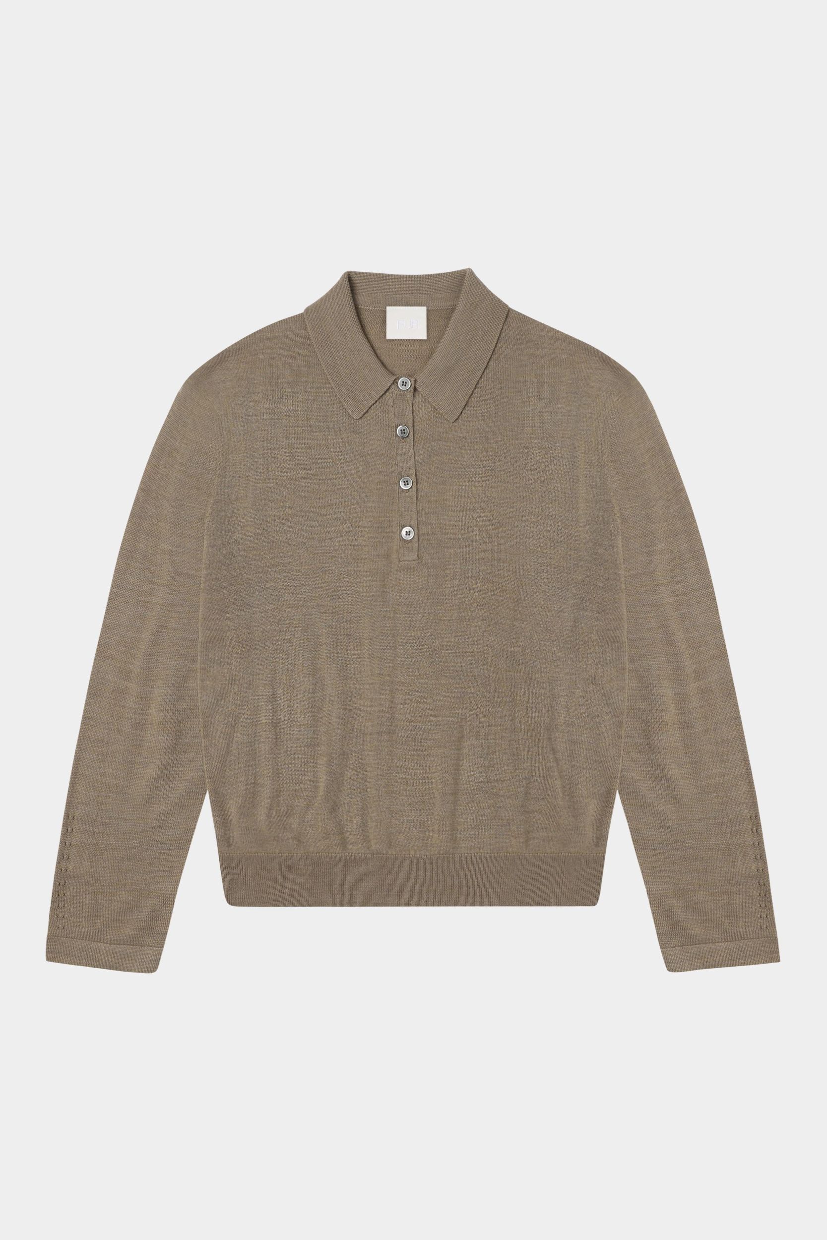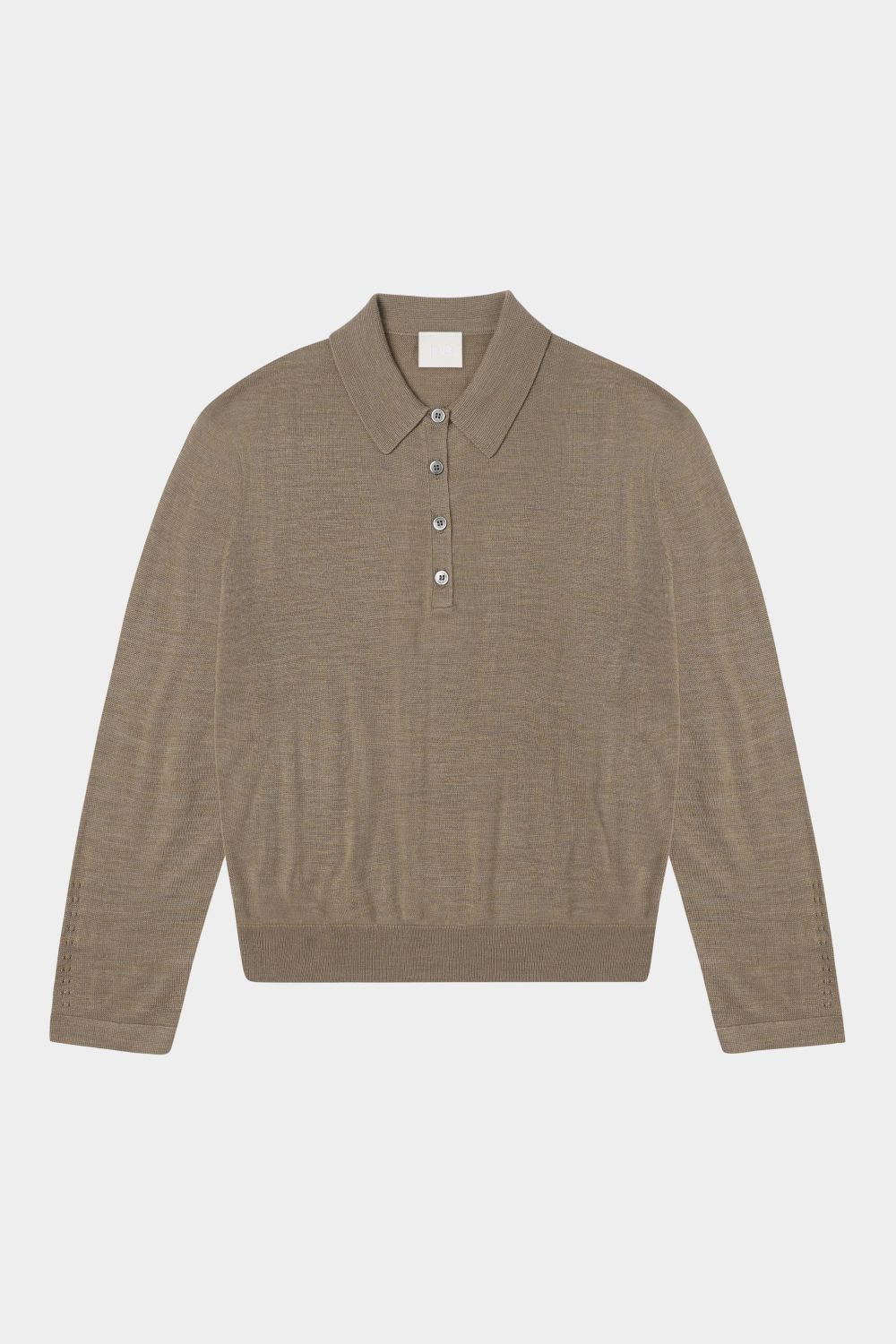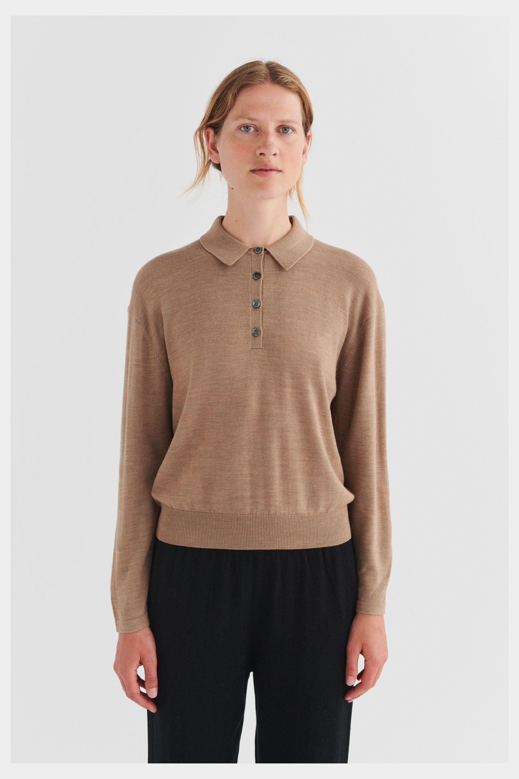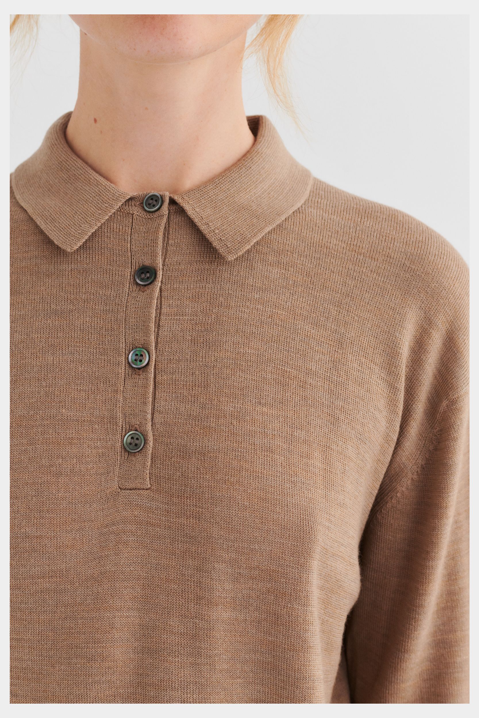 Denne langærmede polo i ren merinuld er designet med ombukkede ærmekanter, klassisk skjortekrave og en let løs pasform. Den er strikket i enkel single jersey og har knaplukning foran med perlemorsknapper, pointelledetaljer på den nederste del af ærmerne samt ribkant forneden. Vores merinould er BLUESIGN®- og RWS-certificeret, fri for skadelige kemi og stammer fra får, der ikke har været udsat for mulesing.