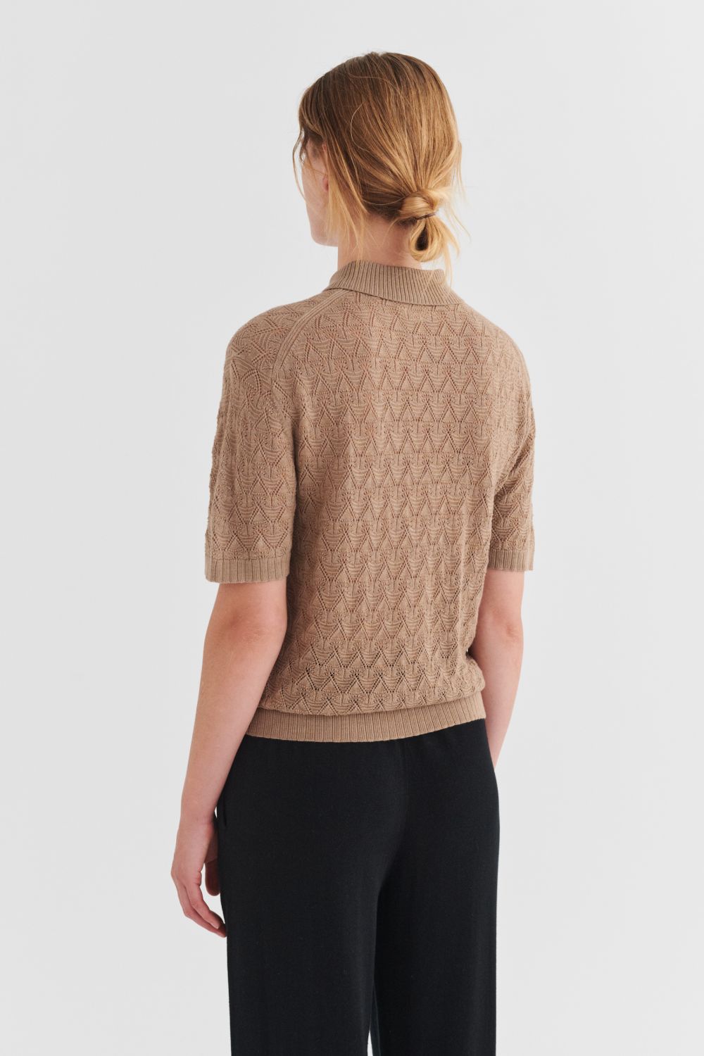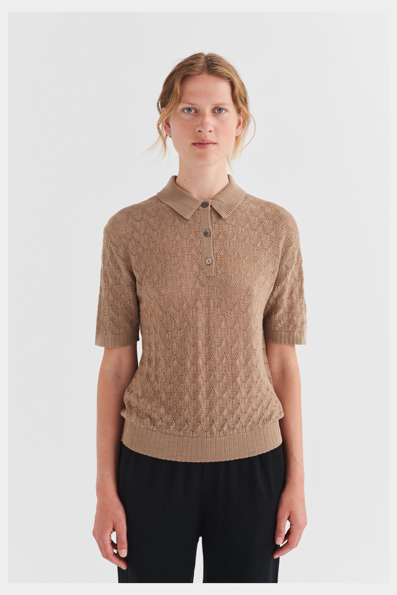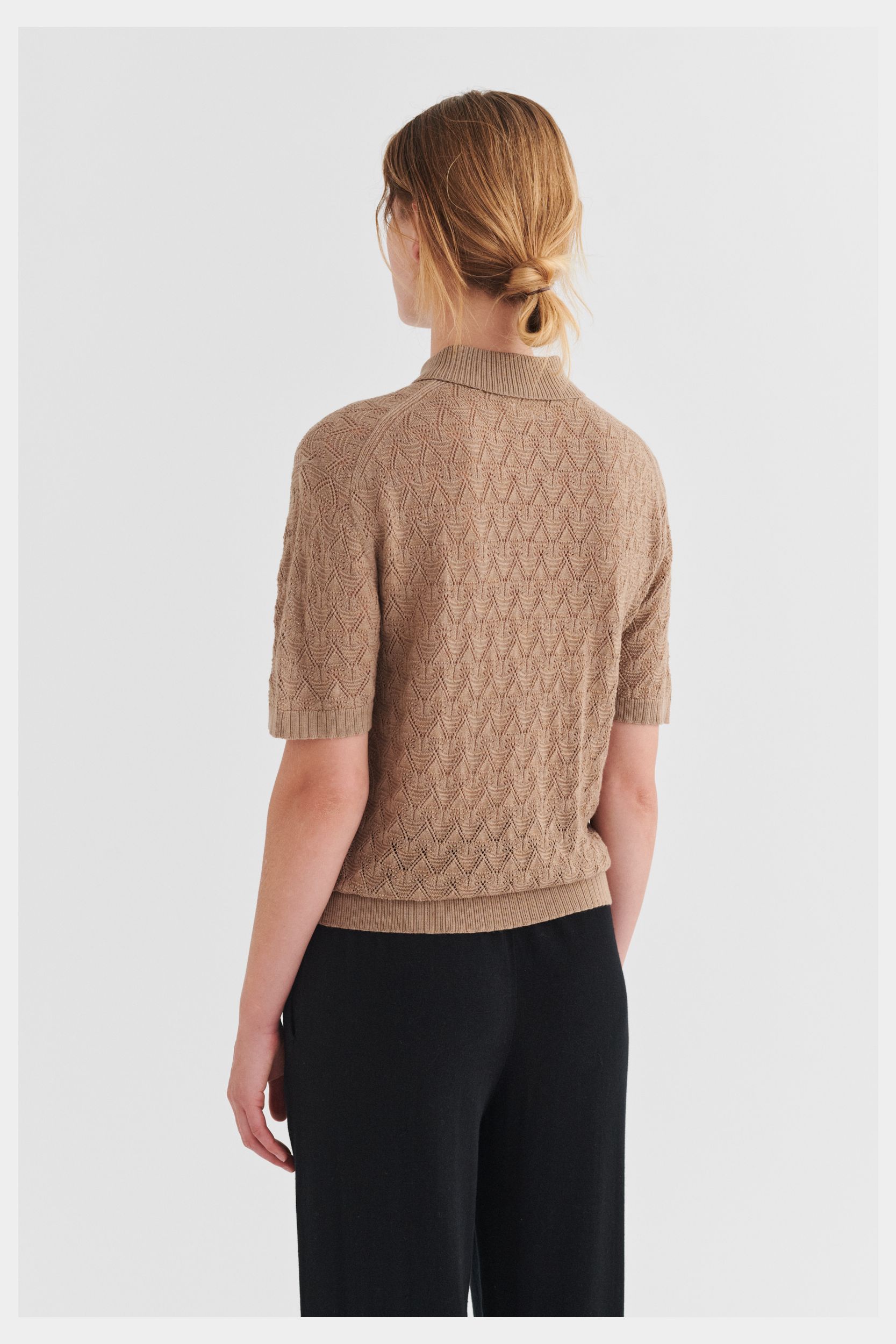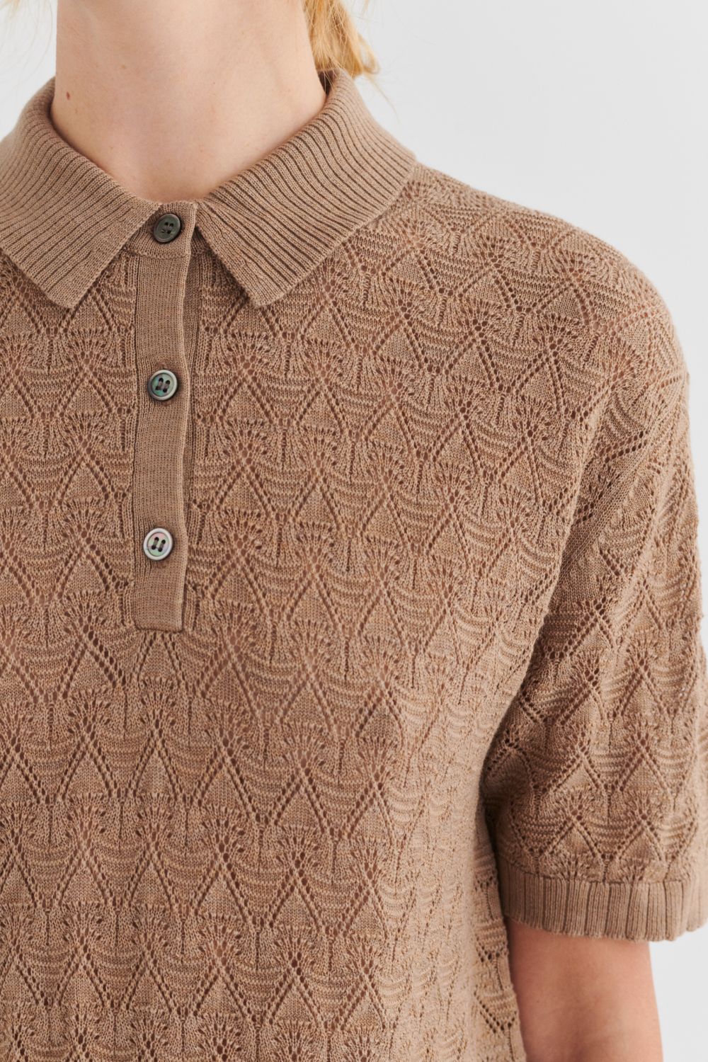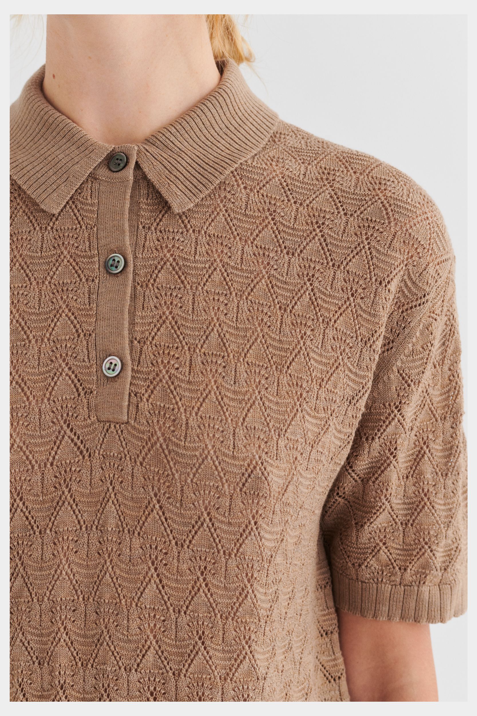Denne polo i ren merinould er designet med lavt skulderpunkt, ribstrikket skjortekrave og en let løs pasform. Den er strikket i et dekorativt mønster og har knaplukning foran med perlemorsknapper samt ribdetaljer ved ærmeafslutning og forneden. Vores merinould er BLUESIGN®- og RWS-certificeret, fri for skadelige kemi og stammer fra får, der ikke har været udsat for mulesing.