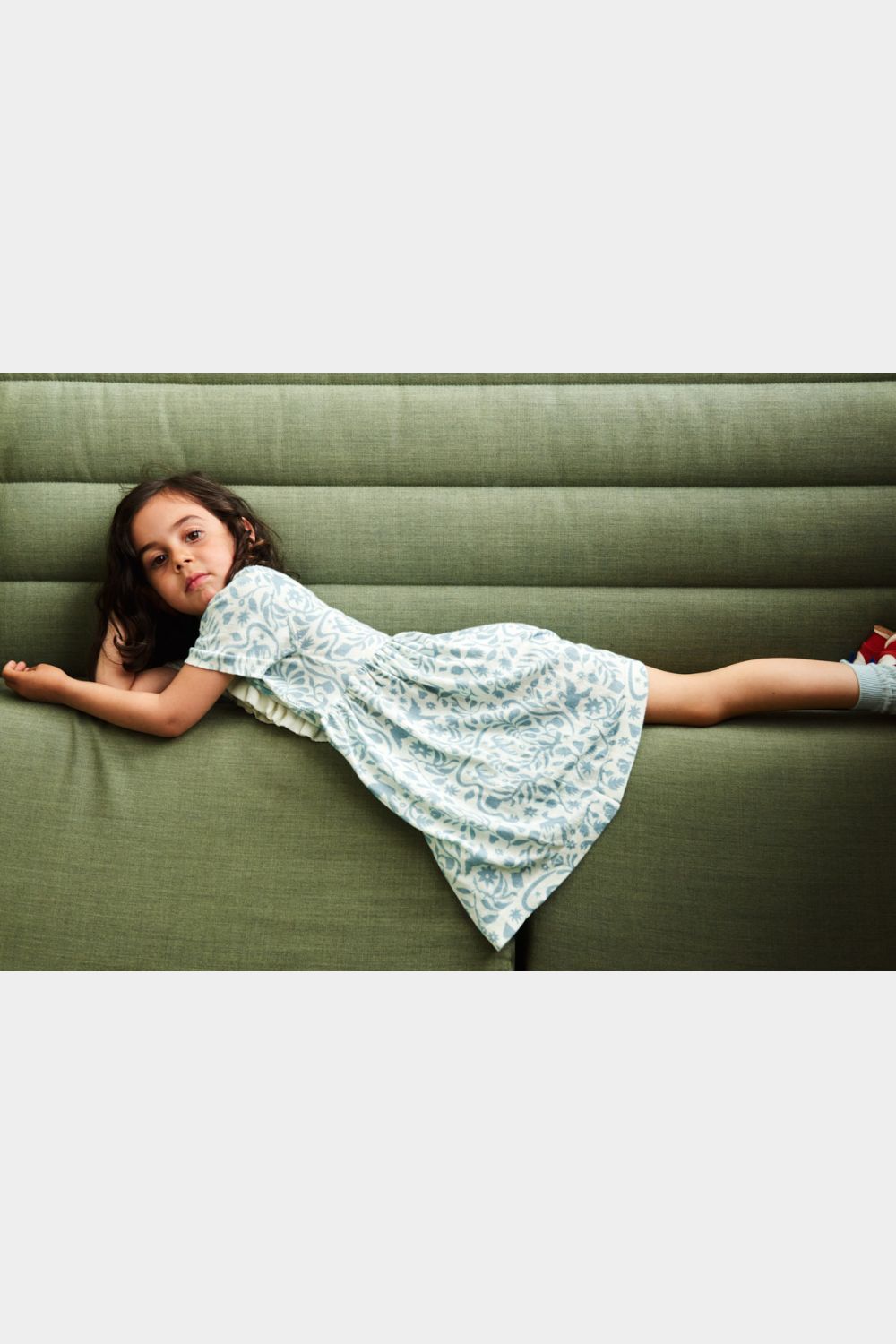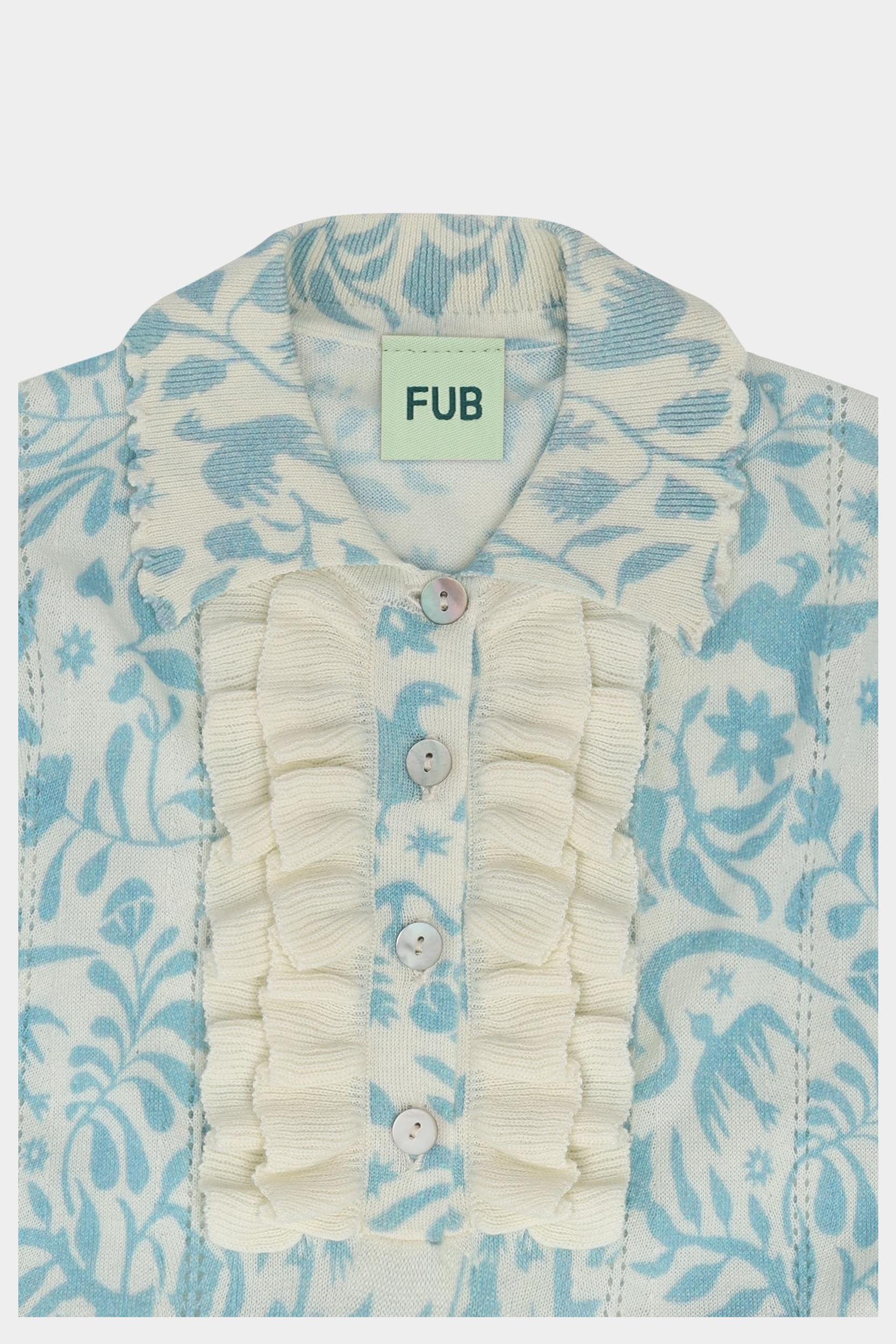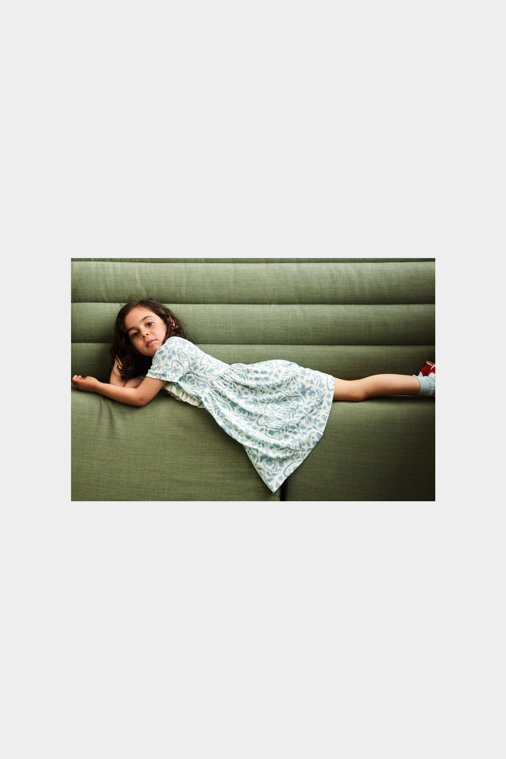 Denne knælange kjole med korte ærmer er strikket i soft single jersey med print. Kjolen har en lille krave med blondekant, knaplukning foran med perlemorsknapper og flæsedetaljer ved stolpelukningen. Kjolen har en løs pasform med bløde rynk ved taljen, som giver skørtet volumen. Kjolen fås i blomsterprint og et print, der er inspireret af traditionelt mexicansk broderi og er lavet af økologisk bomuld.