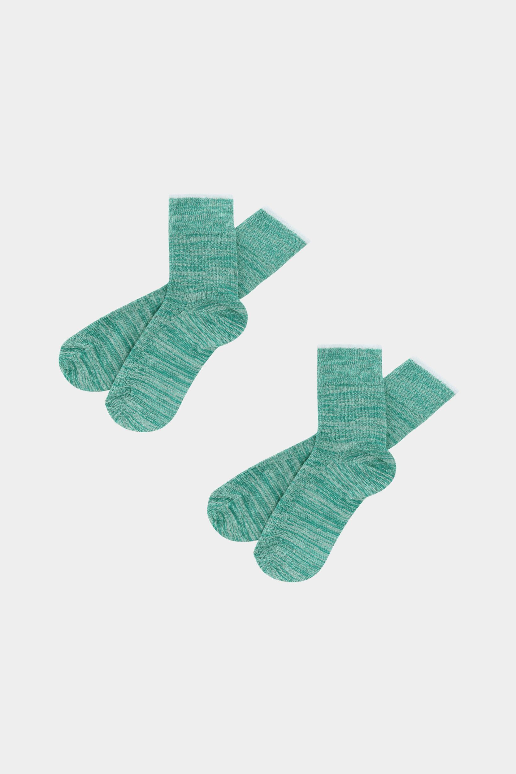 Strømperne er lavet af økologisk bomuldsgarn mikset med elastan for at sikre holdbarhed og god pasform. De er strikket i en tofarvet melange struktur med kontrastfarvet kant i toppen og har forstærkning ved tå og hæl.