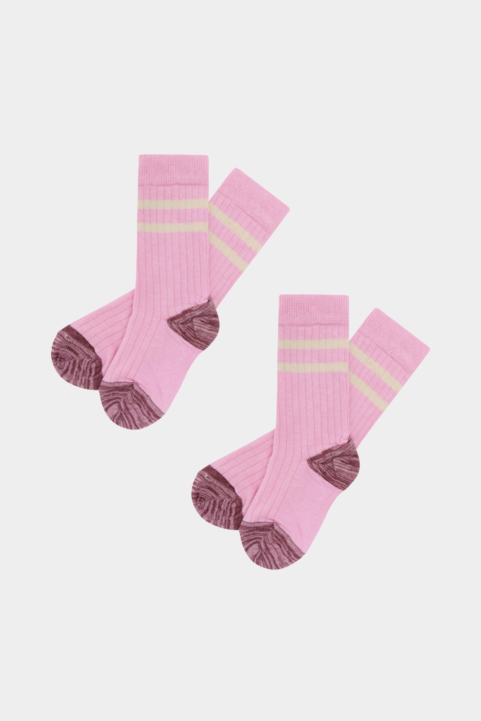 Strømperne er lavet af økologisk bomuldsgarn mikset med elastan for at sikre holdbarhed og god pasform. De er strikket i en klassisk ribstruktur med striper foroven og melangefarvet hæl og tå. Strømperne har forstærkning ved tå og hæl samt en fast dobbeltkant foroven for ekstra komfort.