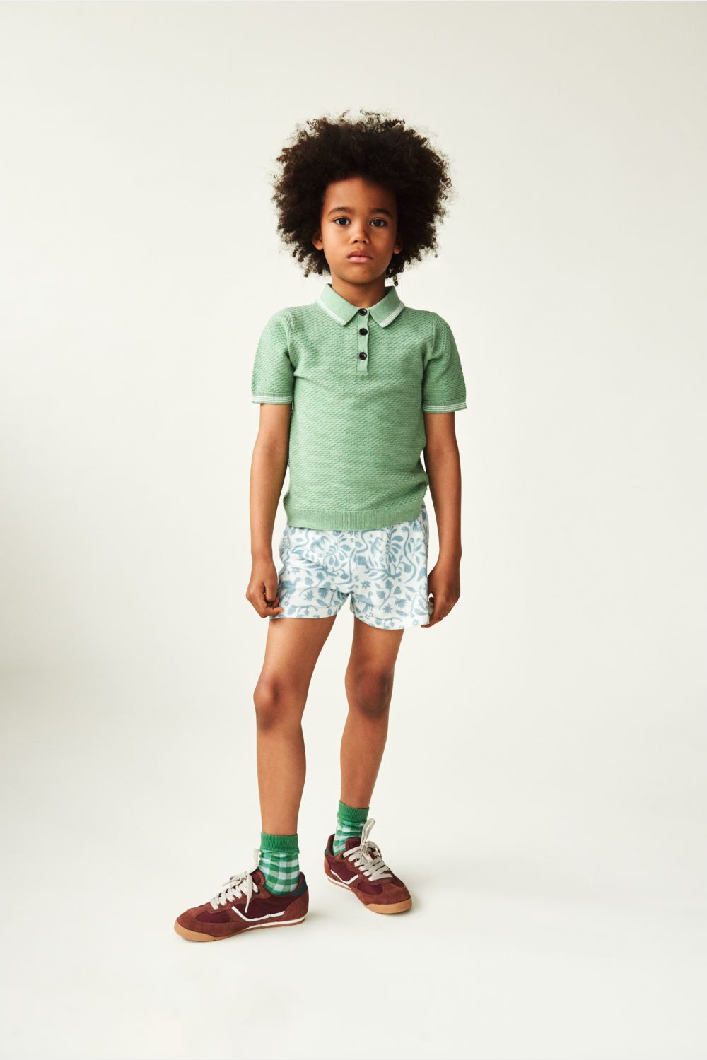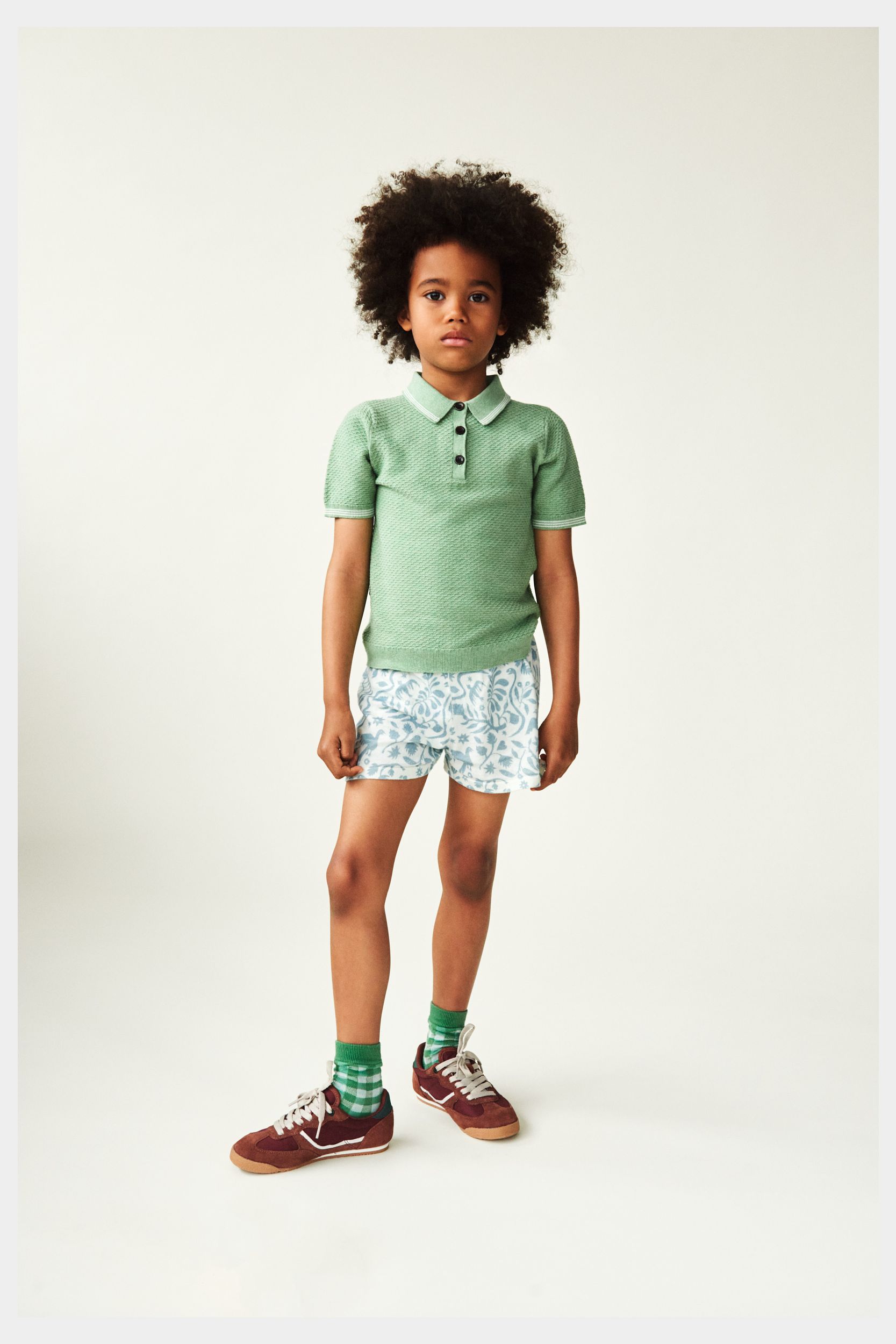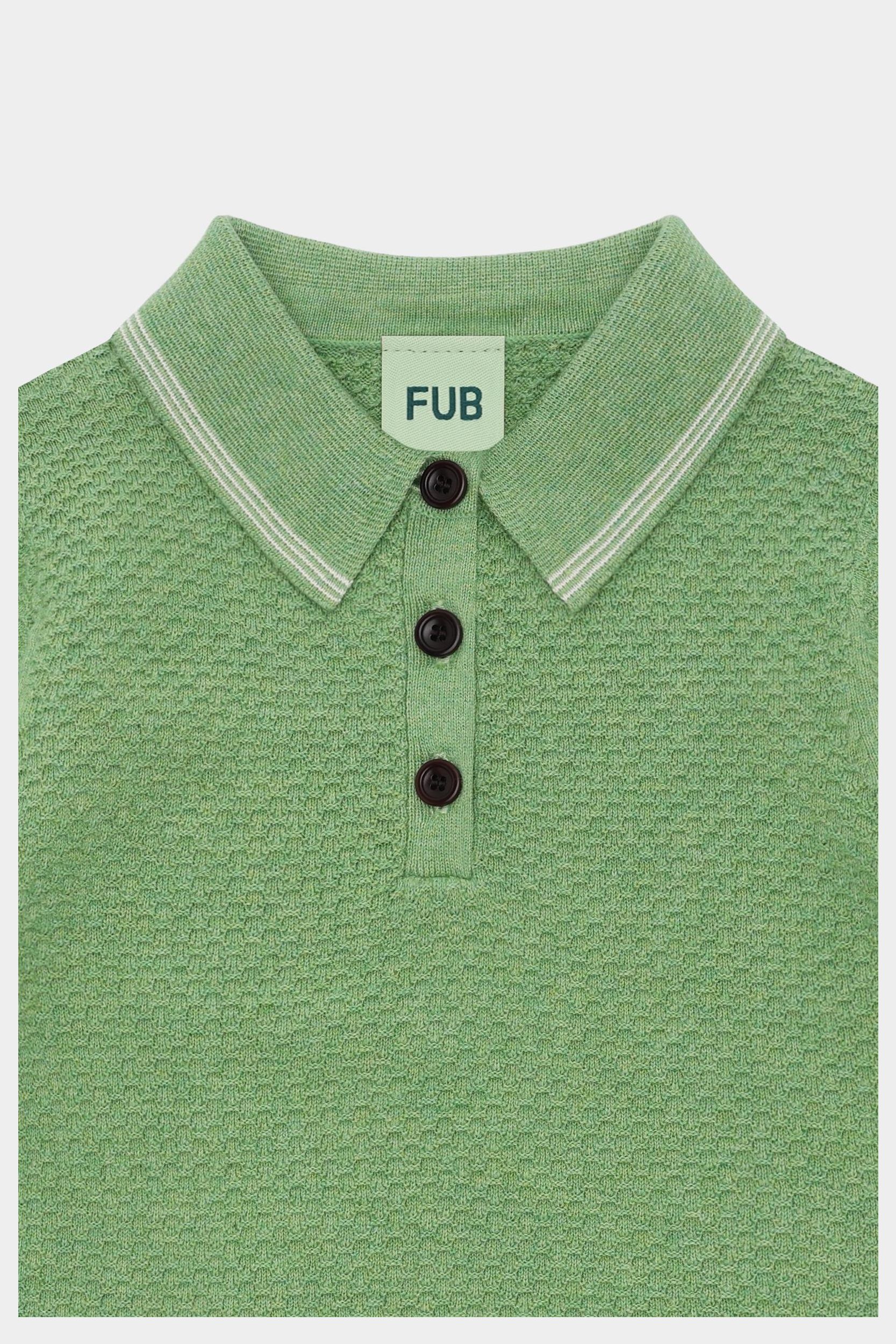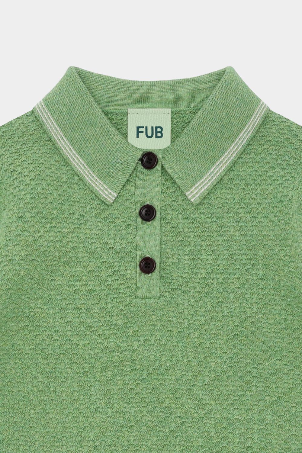 Denne kortærmede polo er strikket i en grafisk piquestruktur. Den har krave med kontrastfarvede striber, frontlukning med knapper af corozonød og stribede ribkanter. Poloen har en almindelig pasform og er lavet af økologisk bomuld.