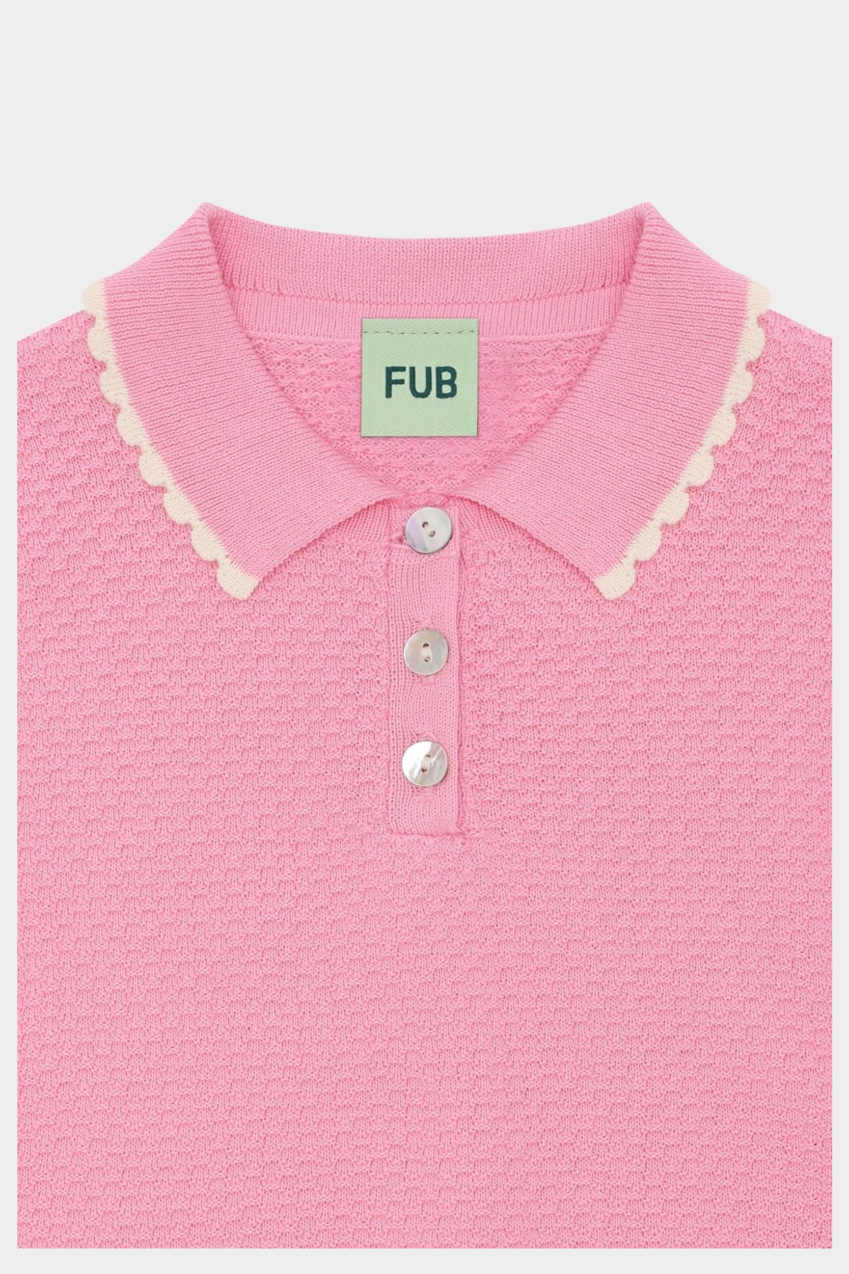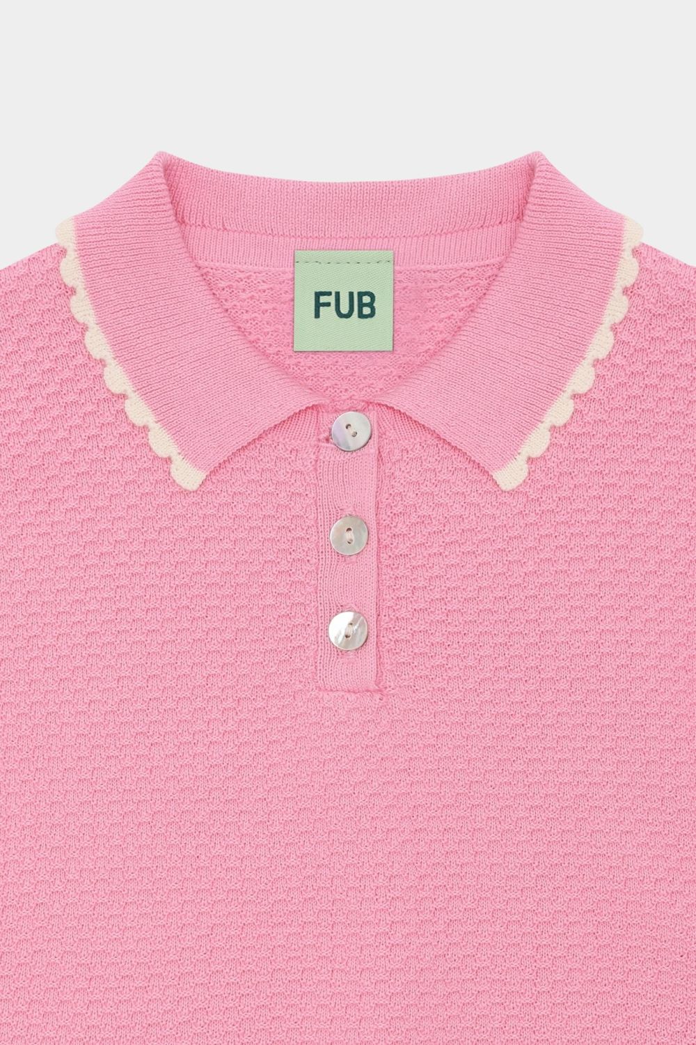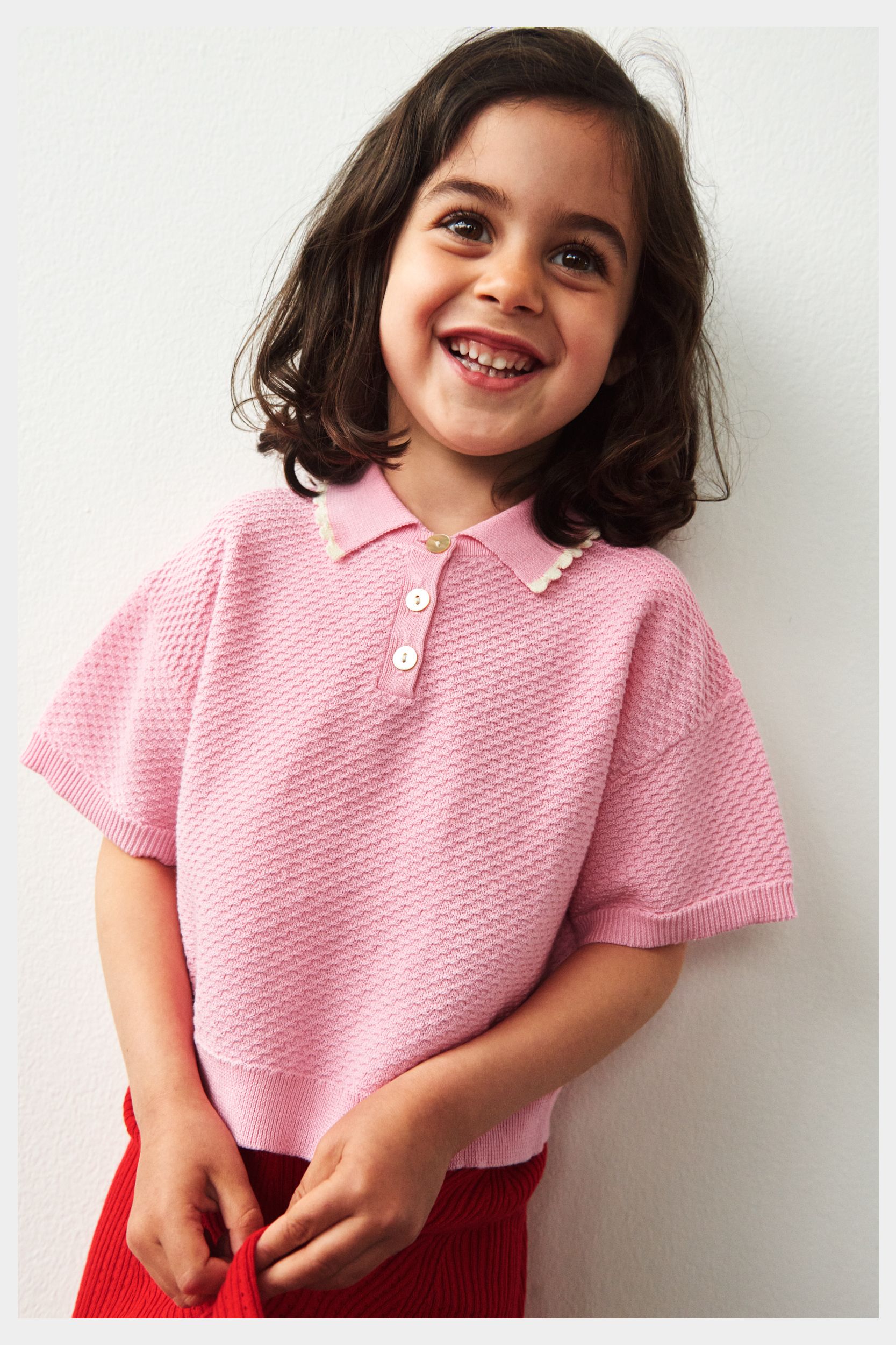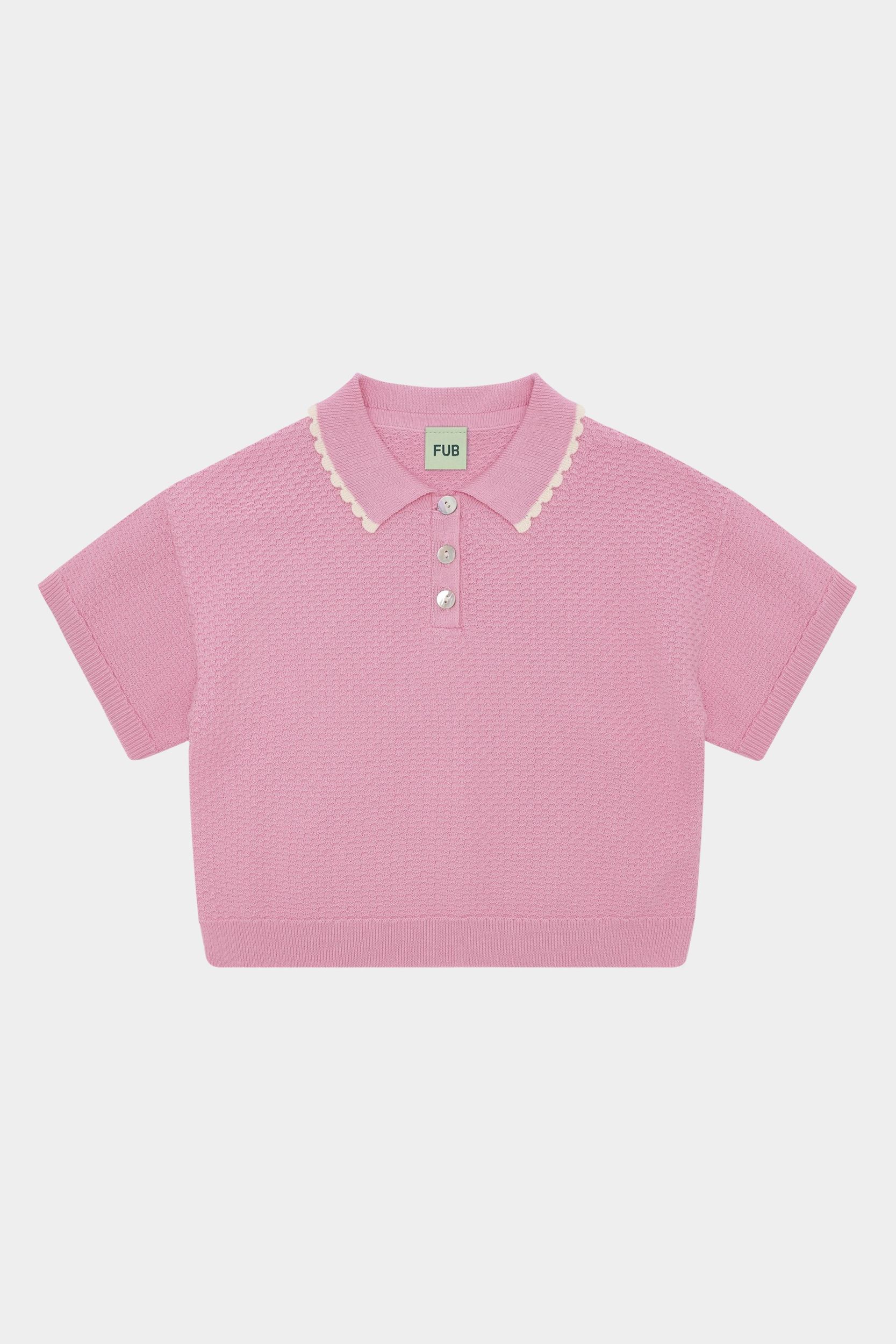 Denne kortærmede polo er strikket i en grafisk piquestruktur. Den er designet med en ribstrikket krave med kontrastfarvet blondekant, frontlukning med perlemorsknapper og ribstrikkede kanter. Poloen er let cropped og oversize i pasformen og er lavet af økologisk bomuld.