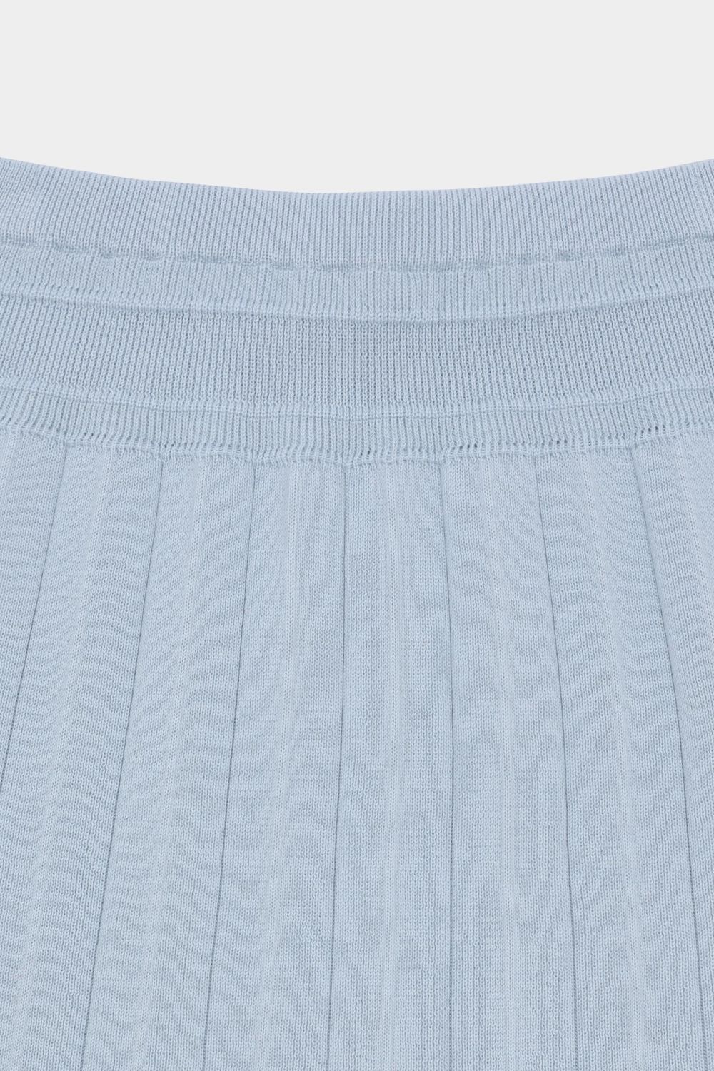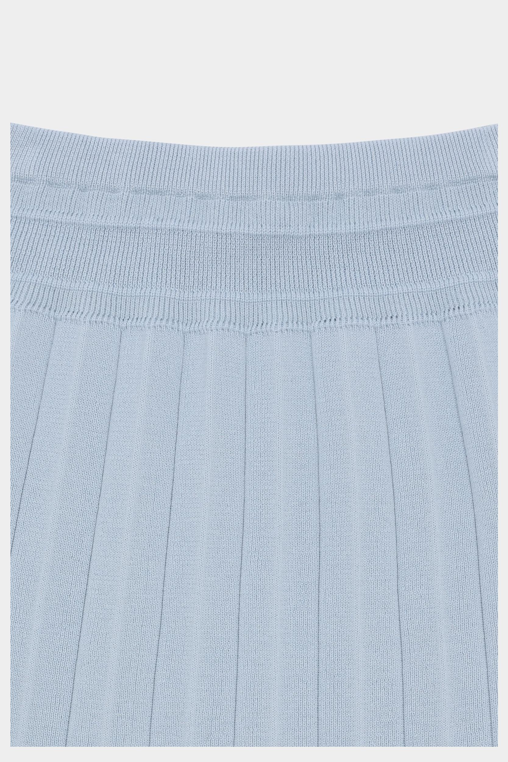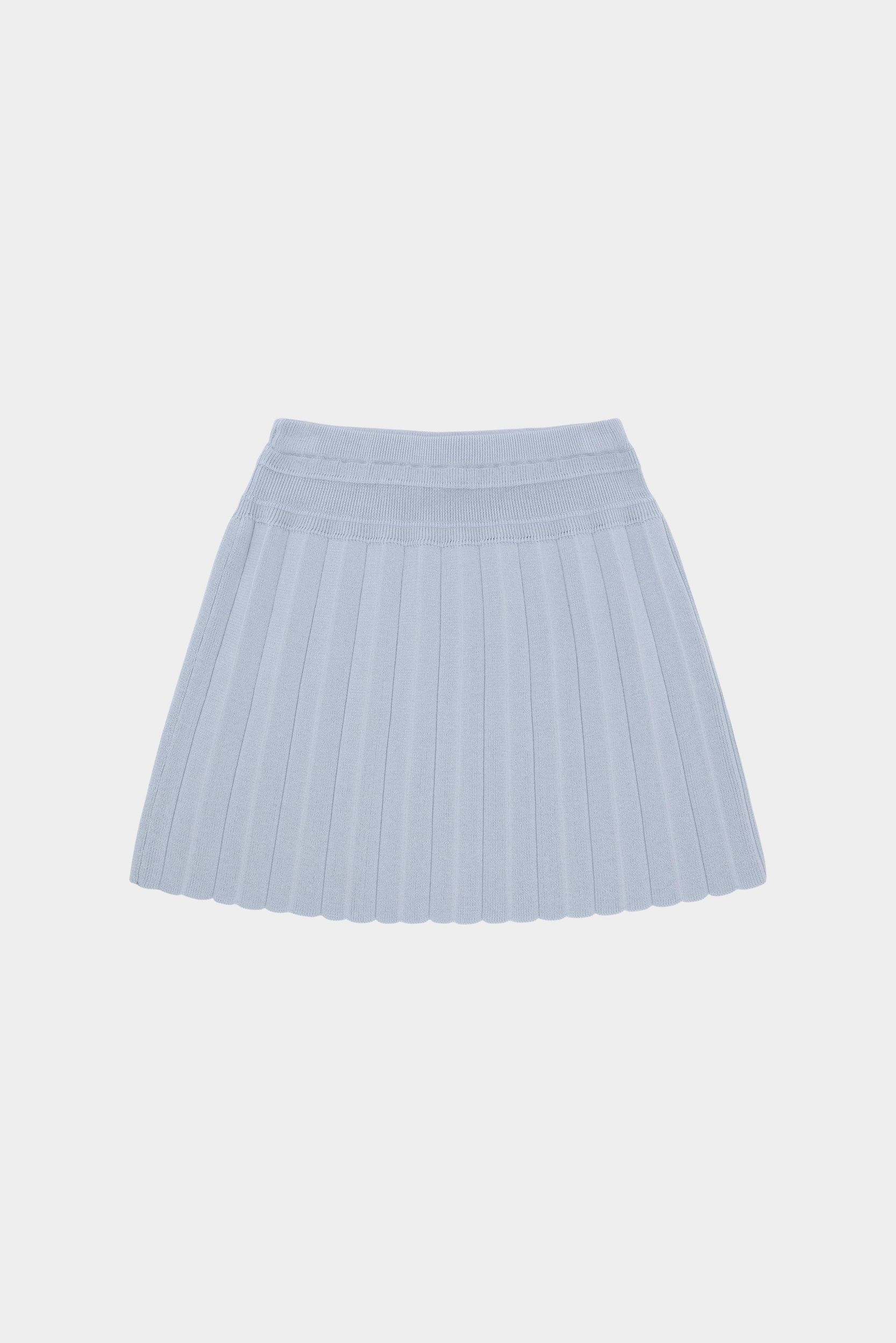 Denne knælange nederdel er strikket i en blød lægstruktur med et bredt ribstrikket panel foroven. Nederdelen har elastikkant i taljen, som sikrer en komfortabel pasform og er lavet af økologisk bomuld.