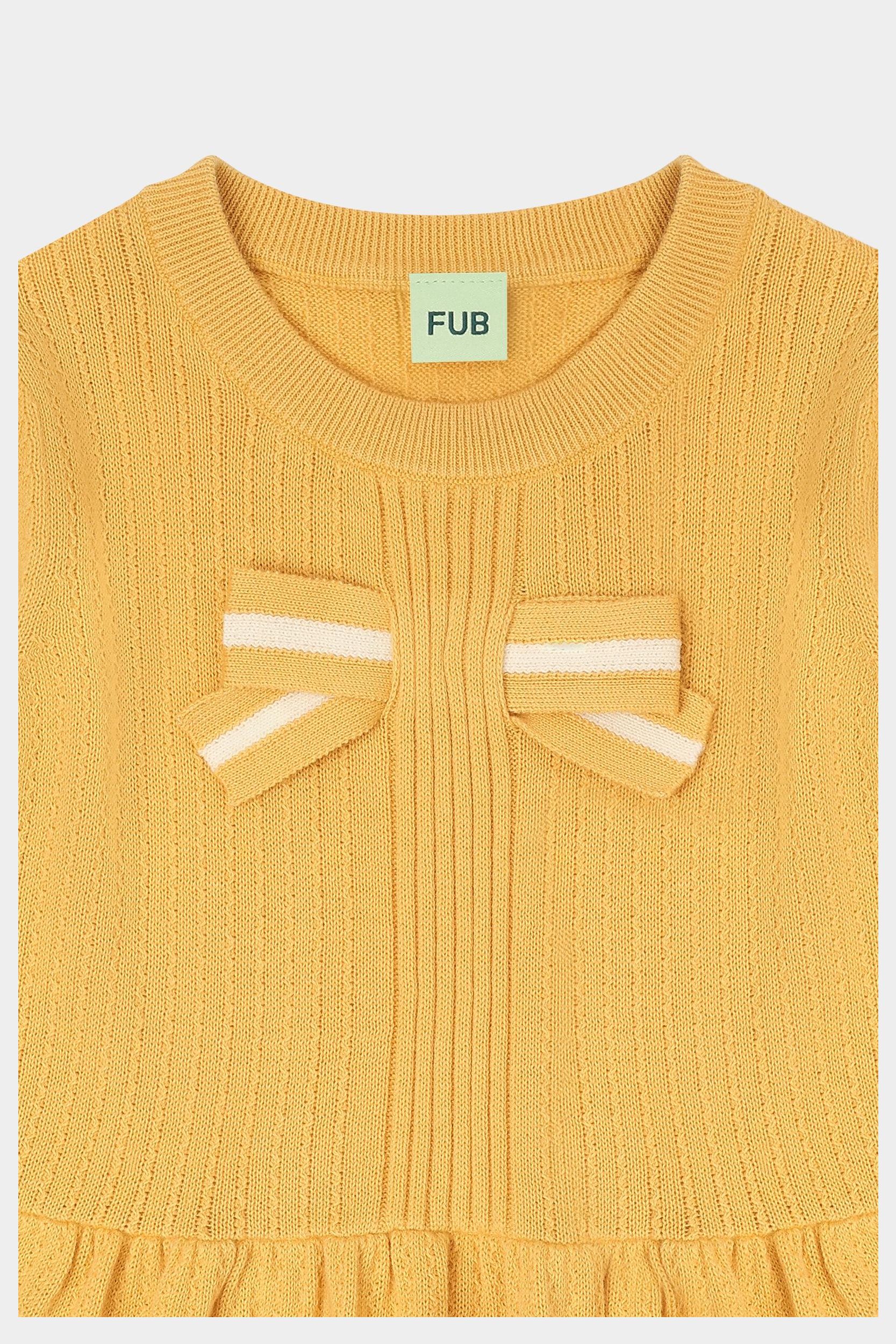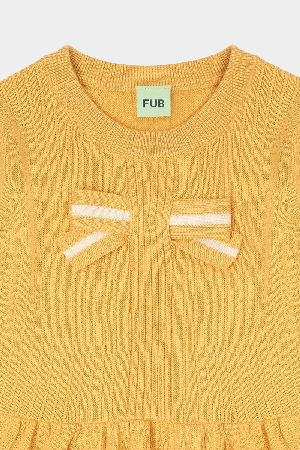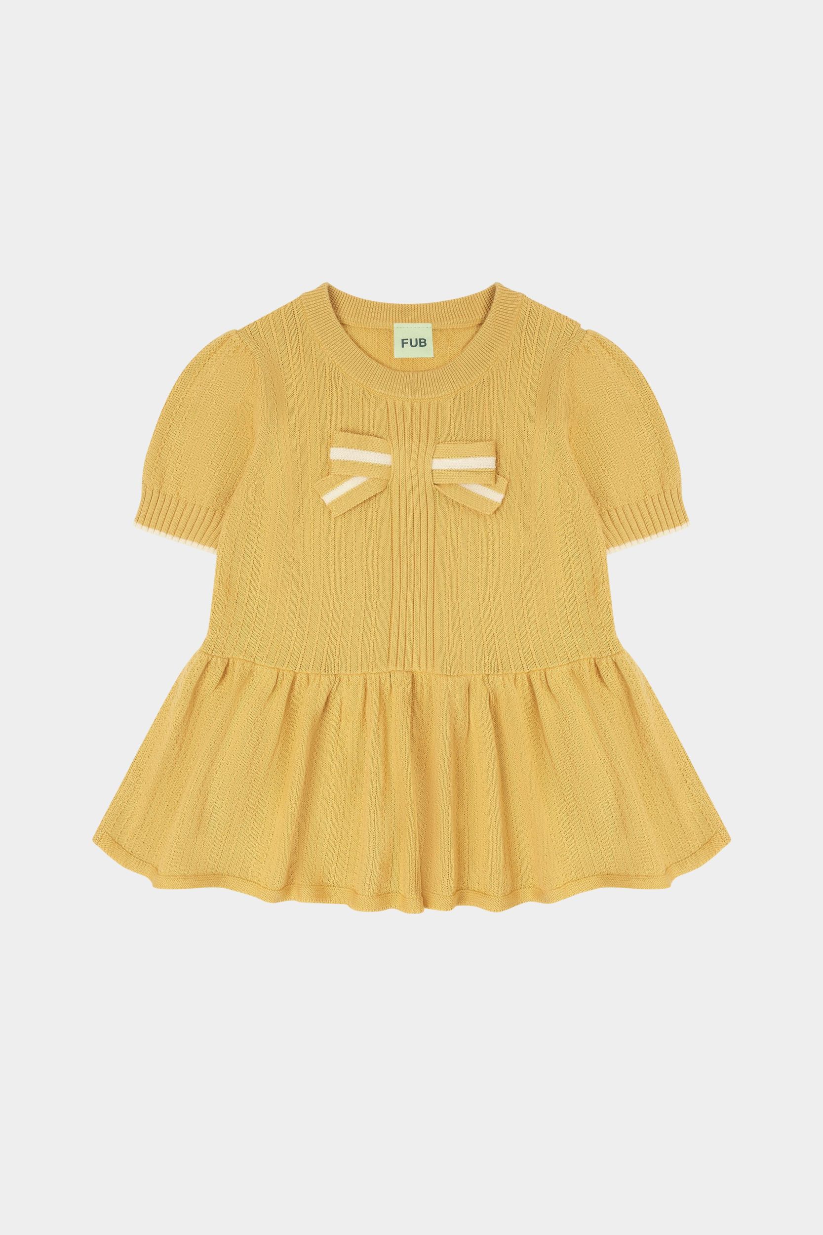 Denne kortærmede top er strikket i en dekorativ struktur og har små bløde læg i taljen, der giver volumen til den nederste del af toppen. Den har en stor stribet sløjfe foran og er designet med pufærmer, ribstrikket halskant og kontrastfarvet strib på ærmekanterne. Den er lavet af økologisk bomuld.