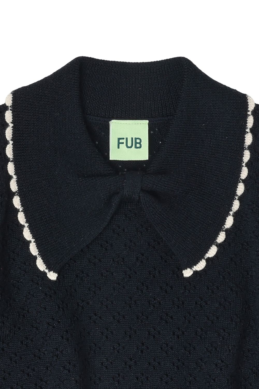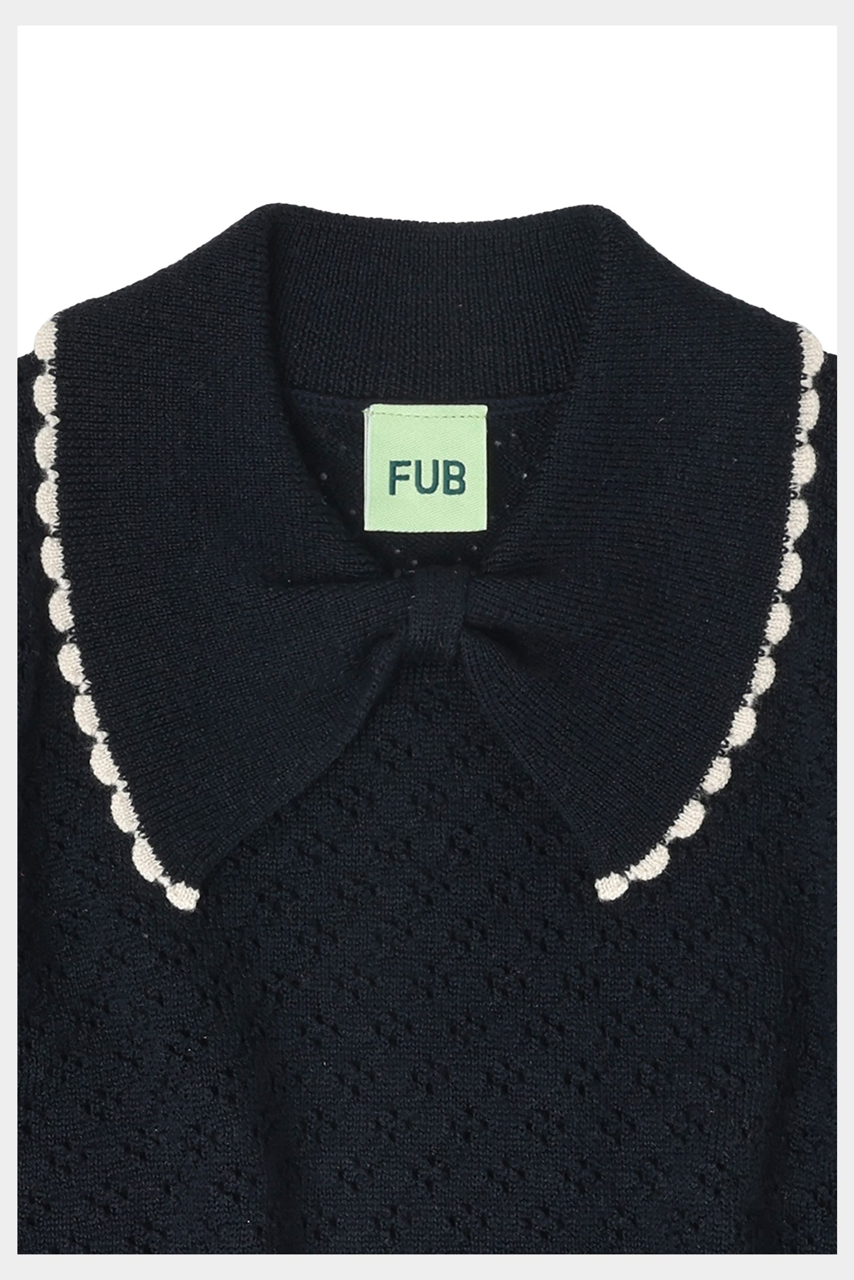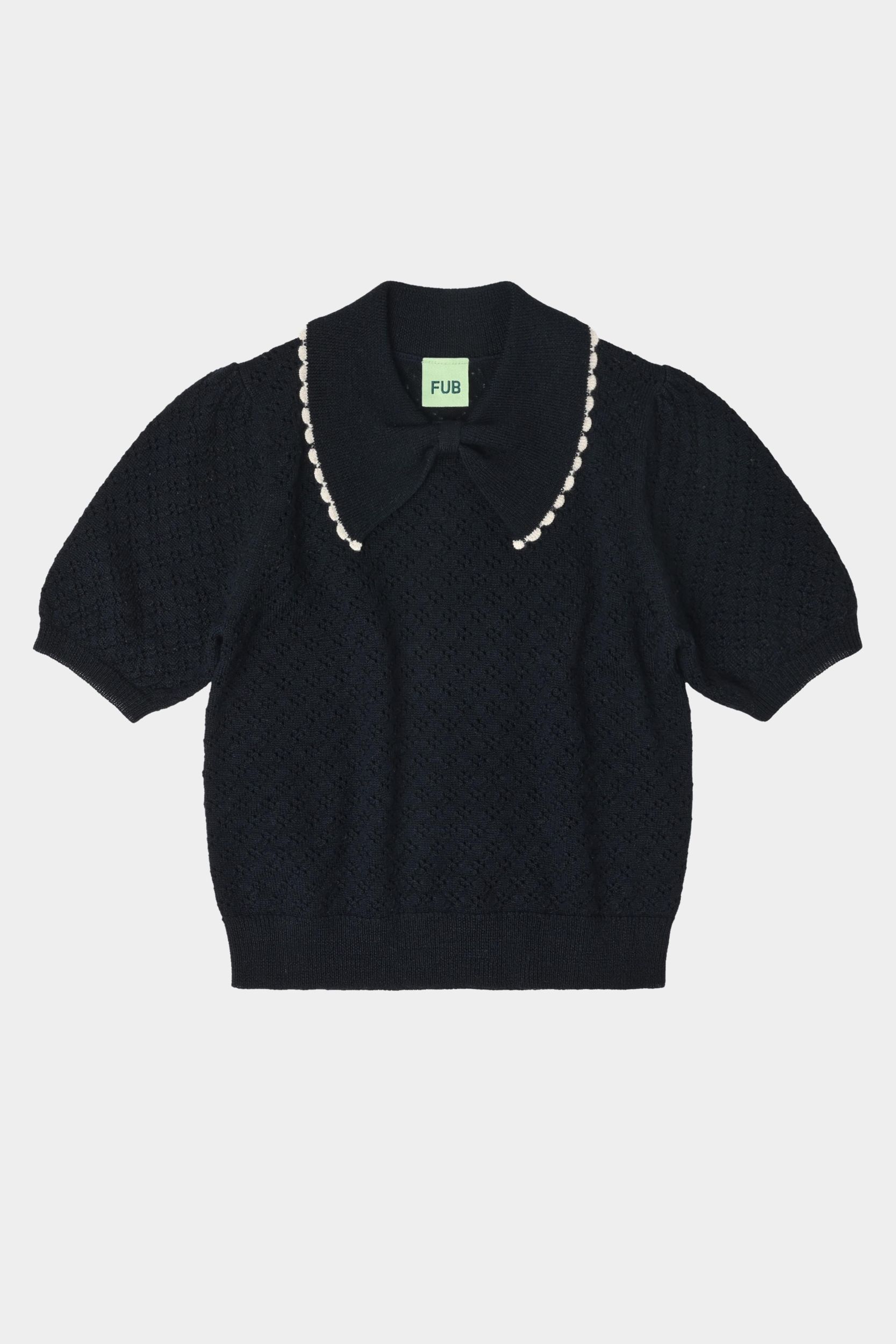 Denne kortærmede polo er strikket i en grafisk pointellestruktur og lavet af ekstra fin merinould. Den har en almindelig pasform, sløjfekrave med kontrastfarvet blondekant og ribkanter. Vores merinould er BLUESIGN® og RWS certificeret, fri for skadelig kemi og stammer fra får, der ikke har været udsat for mulesing.