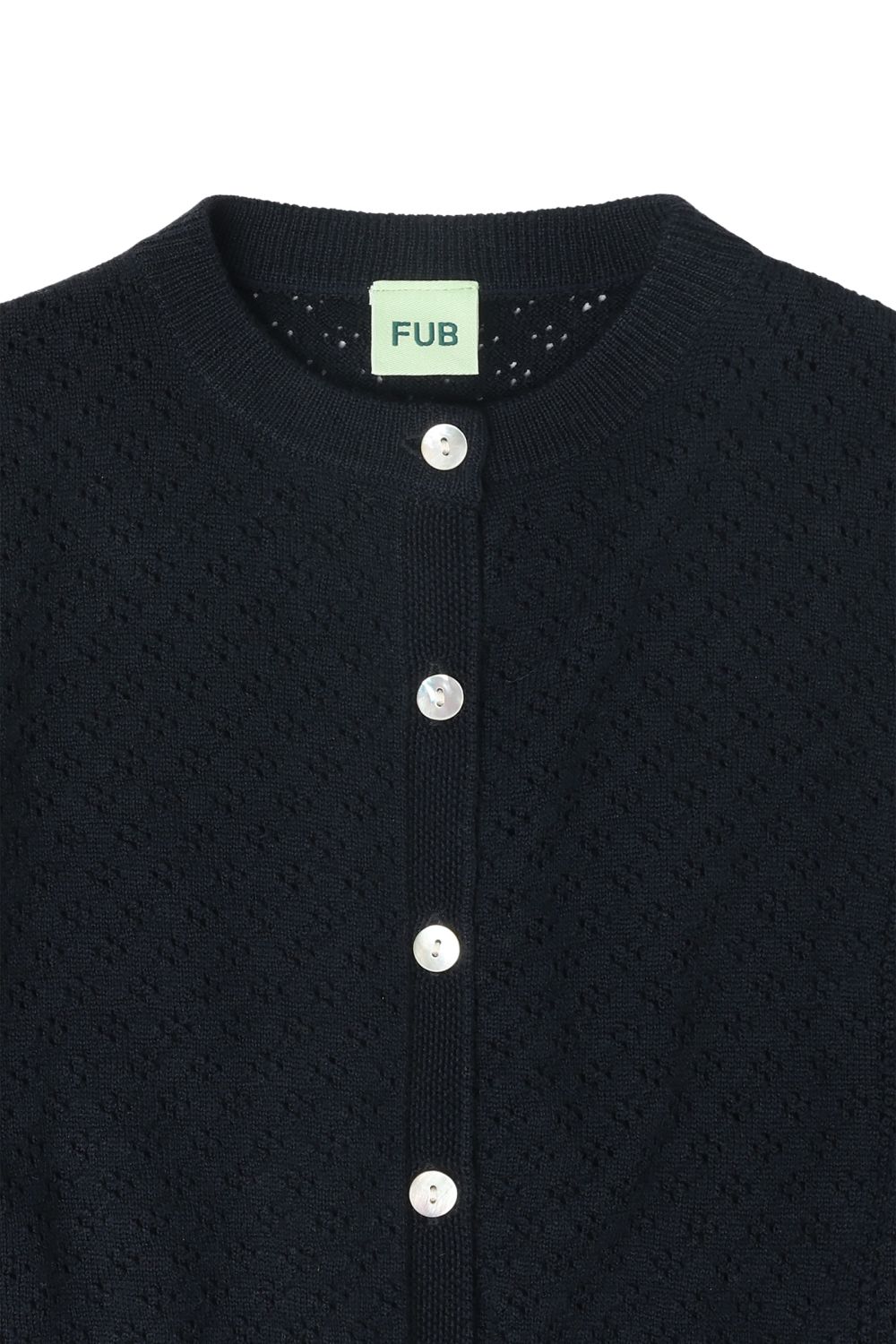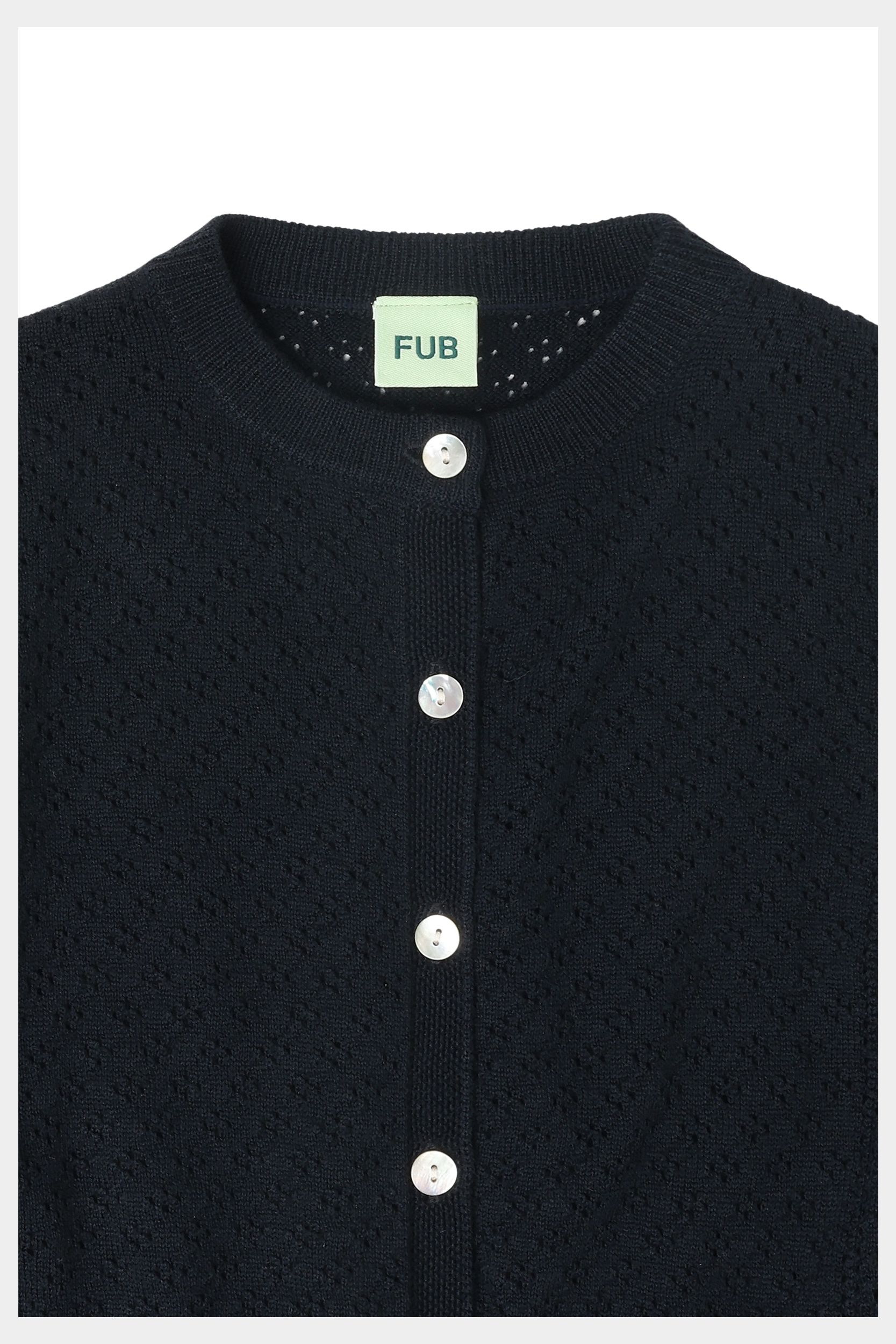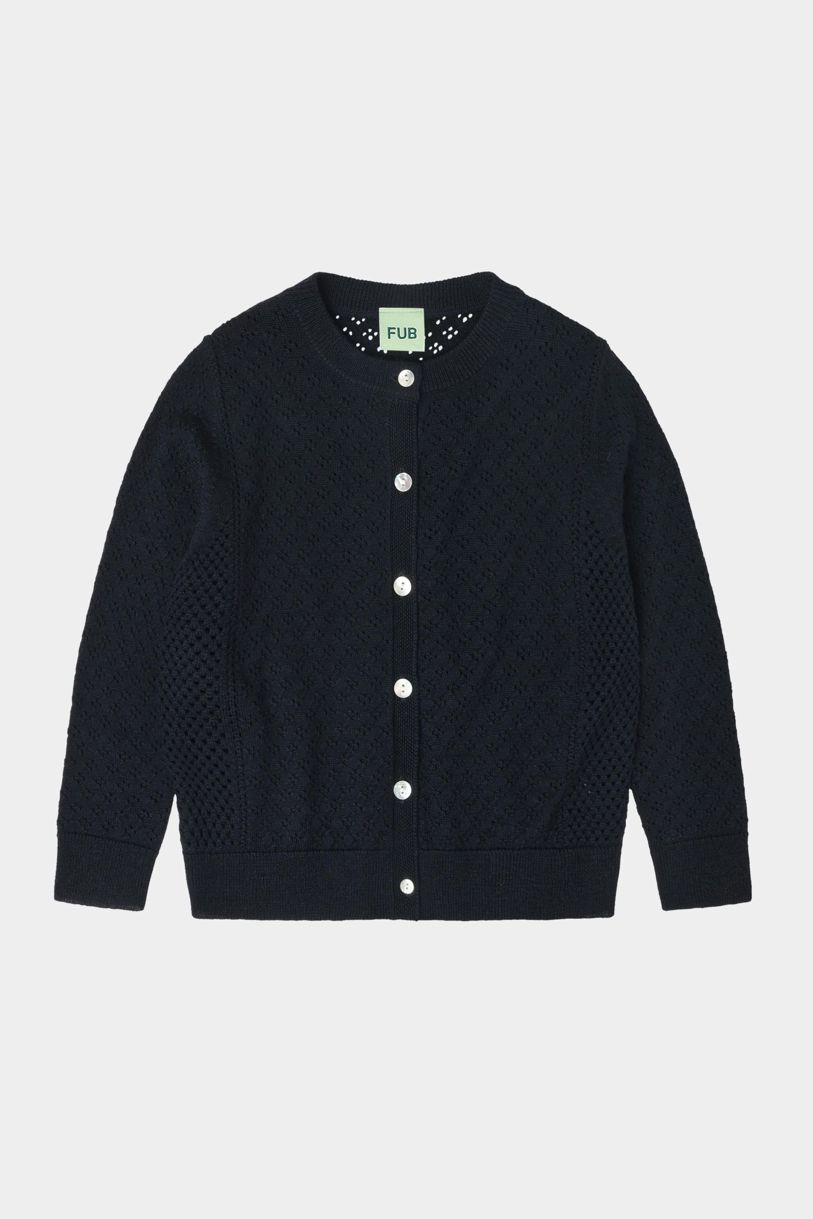 Denne cardigan er strikket i et grafisk pointellemønster med dekorative pointellepaneler i siderne. Den har lange ærmer, frontlukning med perlemorsknapper og ribstrikkede detaljer ved ærmeafslutningerne og sømkanten. Cardiganen har en almindelig pasform og er lavet af ekstra fin merinould. Vores merinould er BLUESIGN® og RWS certificeret, fri for skadelig kemi og stammer fra får, der ikke har været udsat for mulesing.