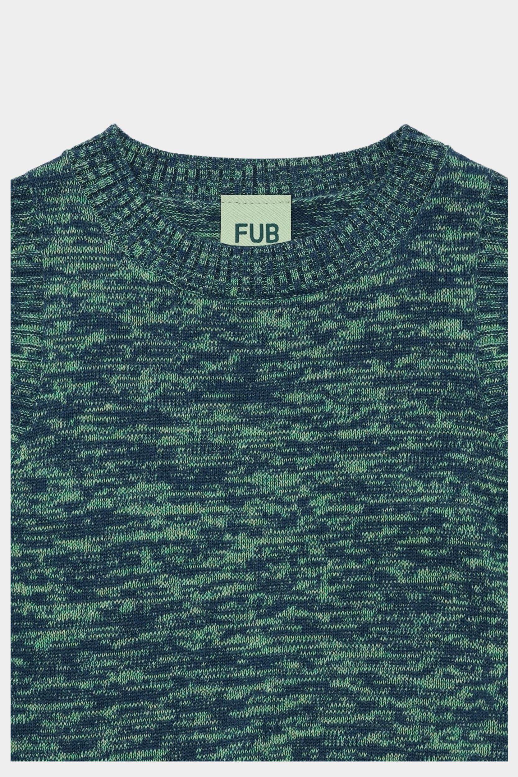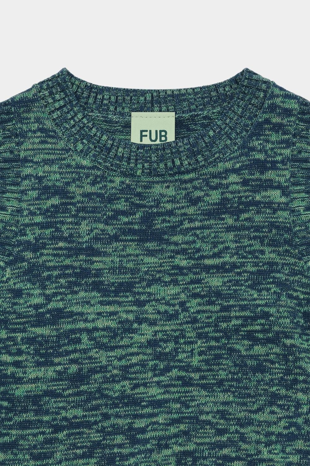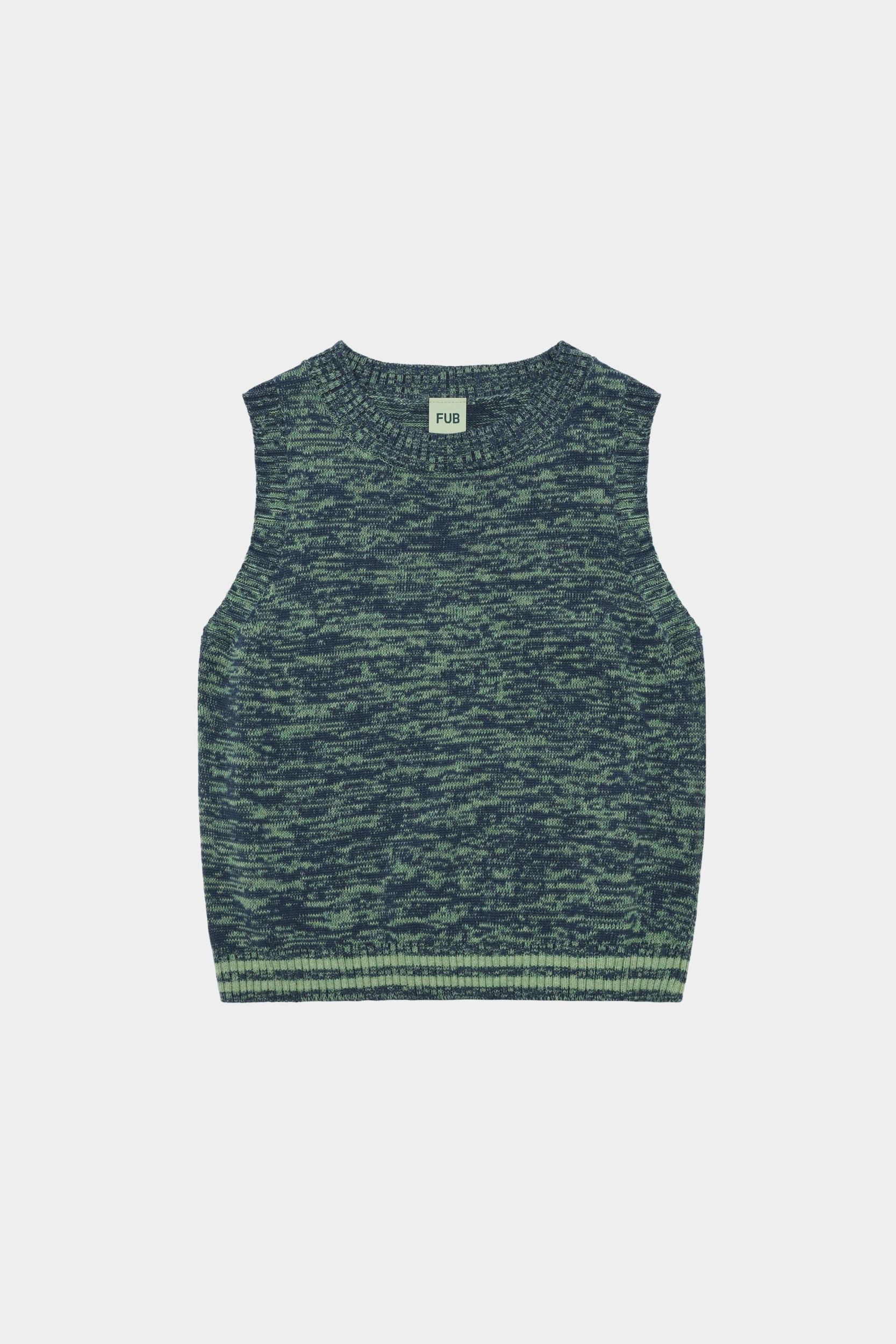 Denne vest er strikket i en tofarvet melangestruktur. Den har en almindelig pasform med rund hals og ribkanter med kontrastfarvede striber. Den er lavet af økologisk bomuld og kan både bruges alene som en top eller med en bluse indenunder.