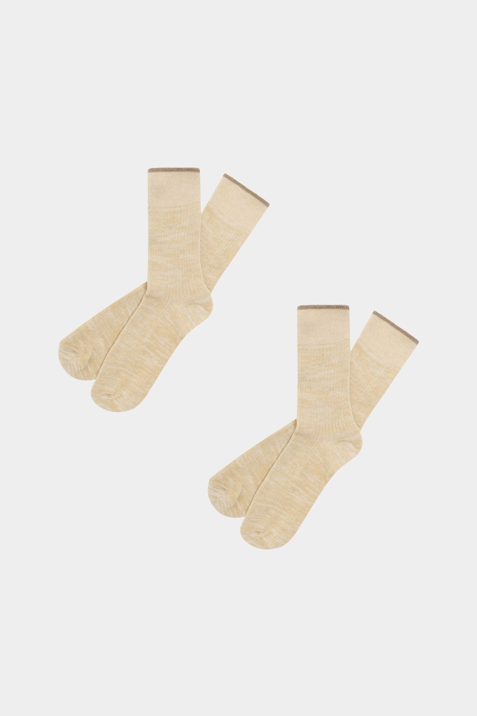 Strømperne er lavet af økologisk bomuldsgarn mikset med elastan for at sikre holdbarhed og god pasform. De er strikket i en tofarvet melange struktur med kontrastfarvet kant i toppen og har forstærkning ved tå og hæl.