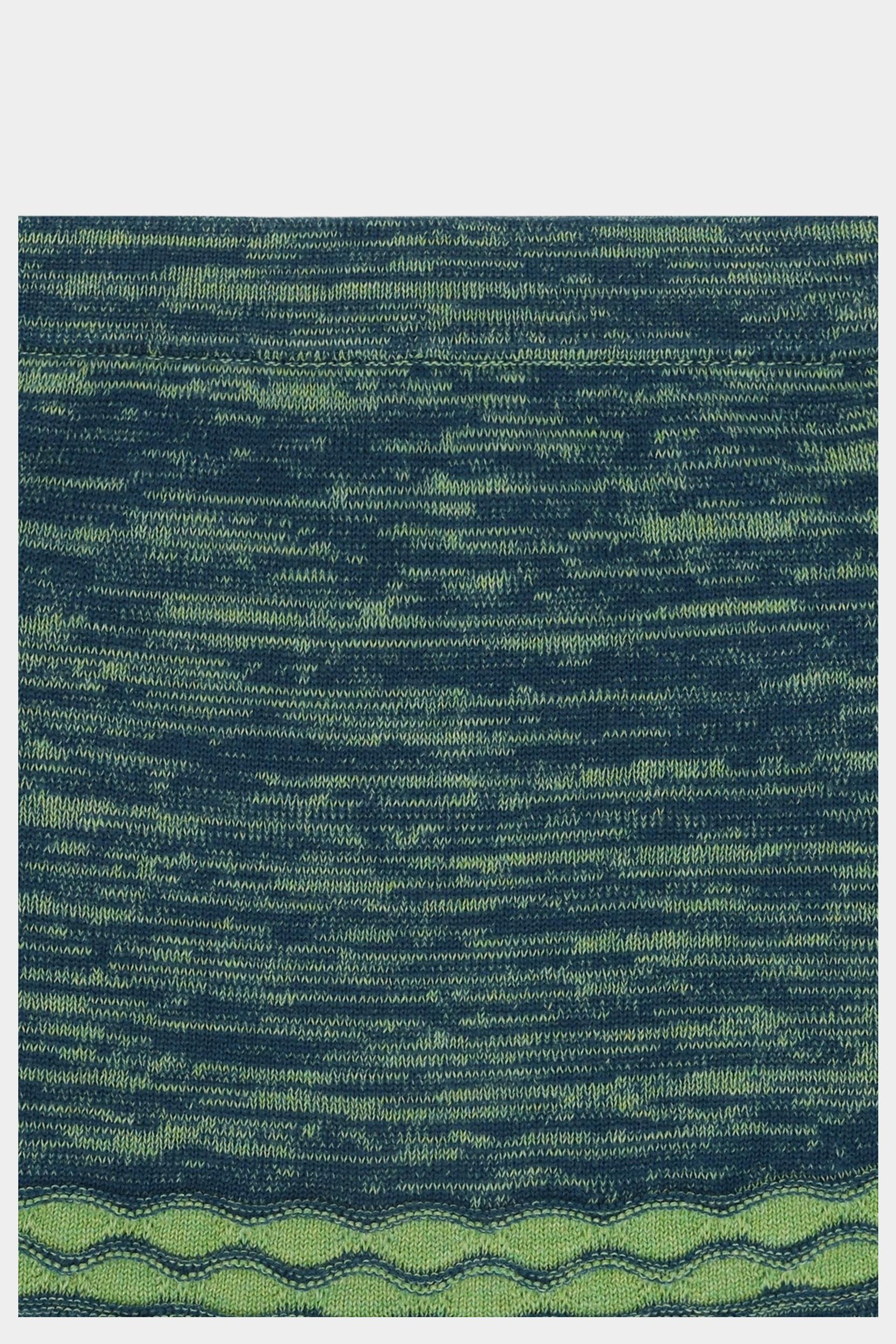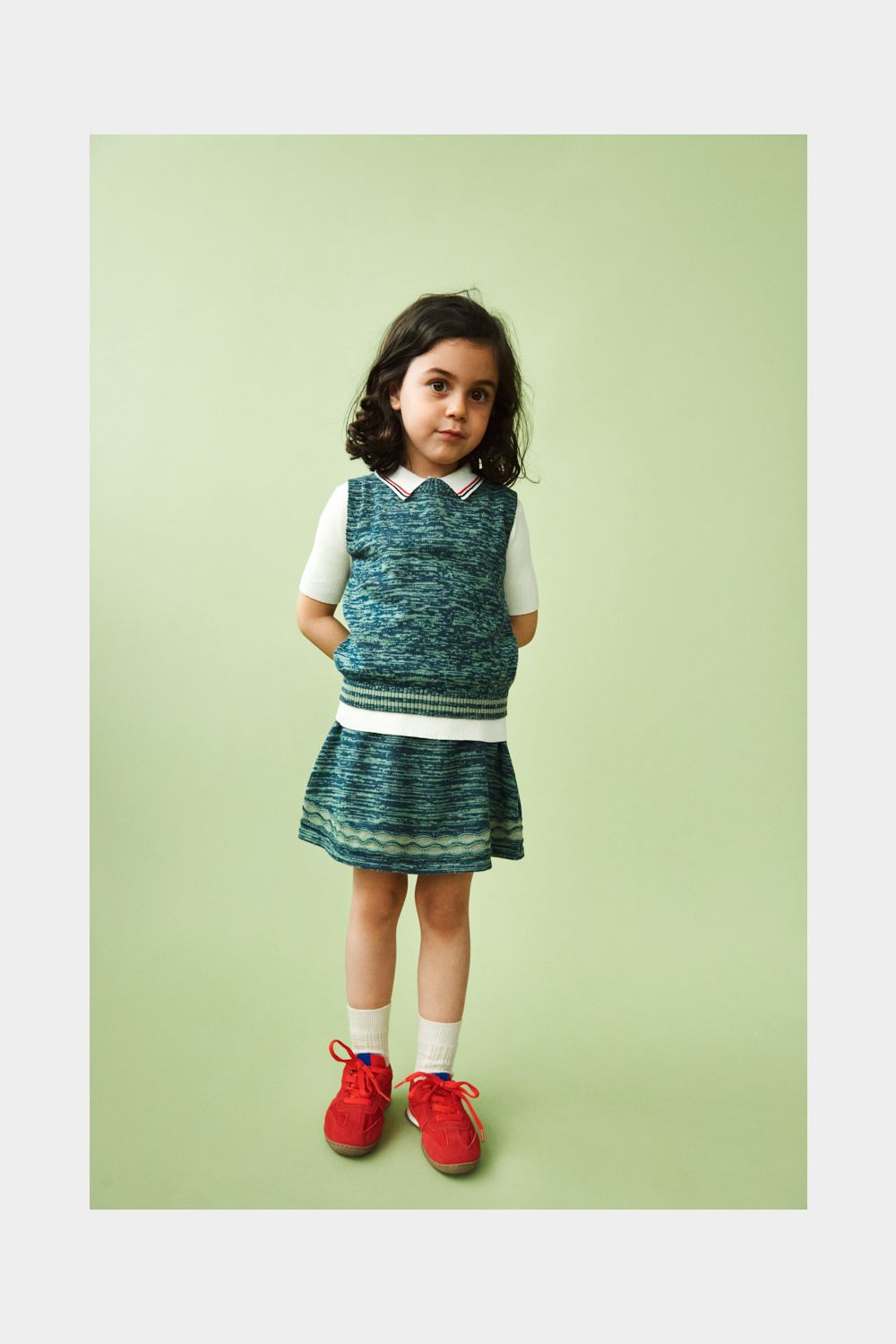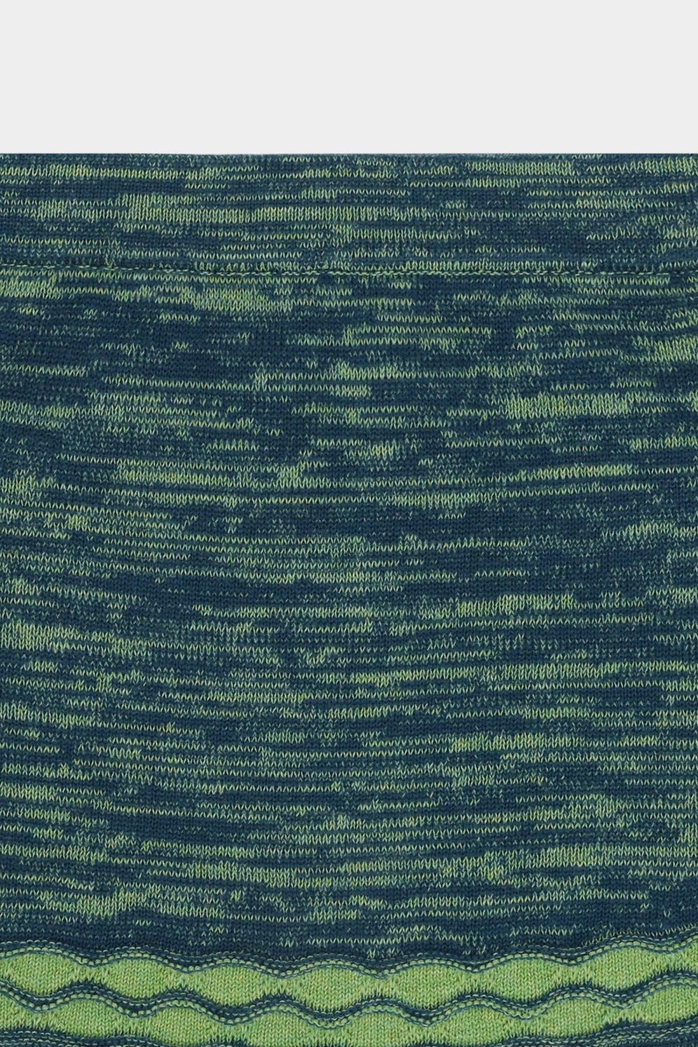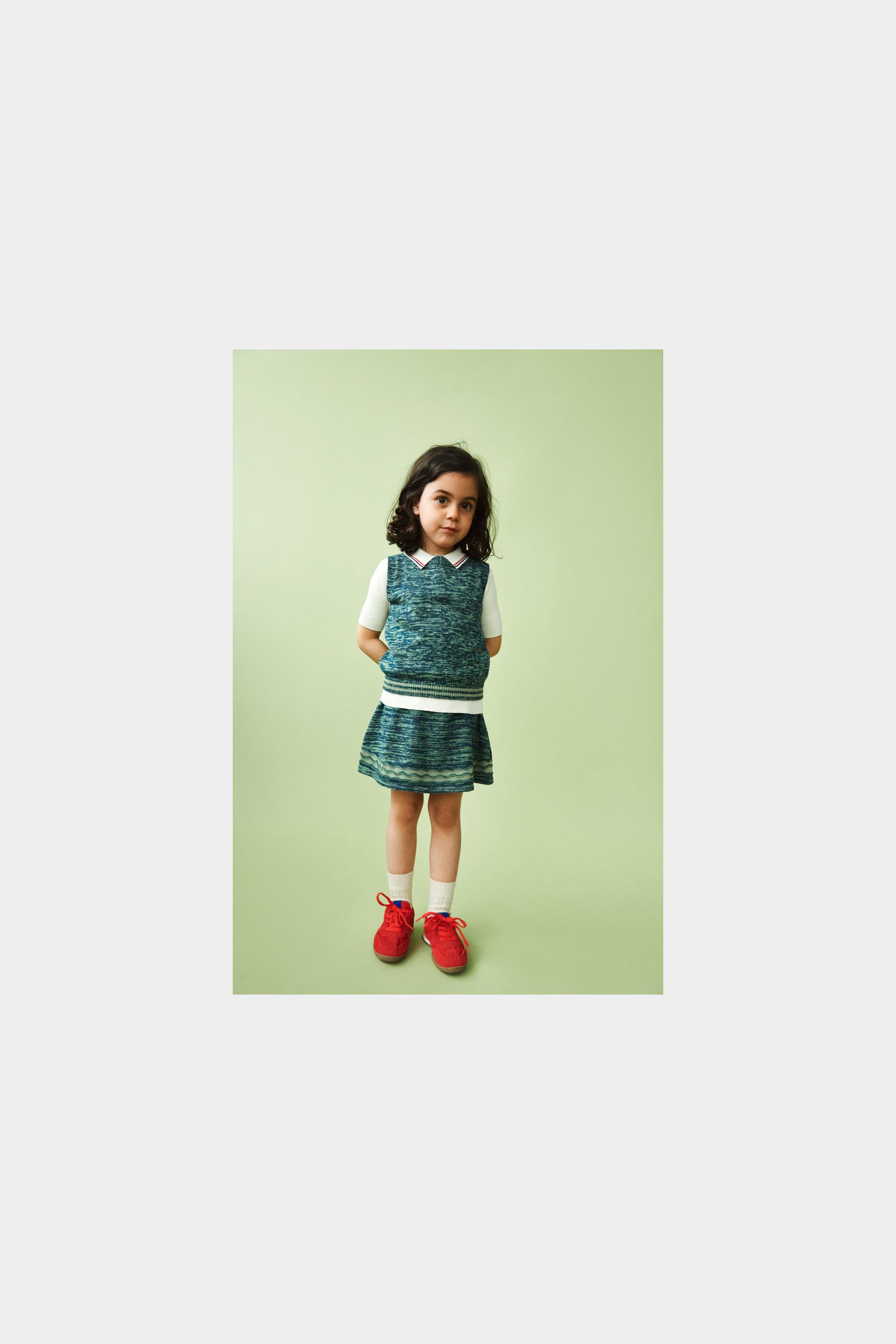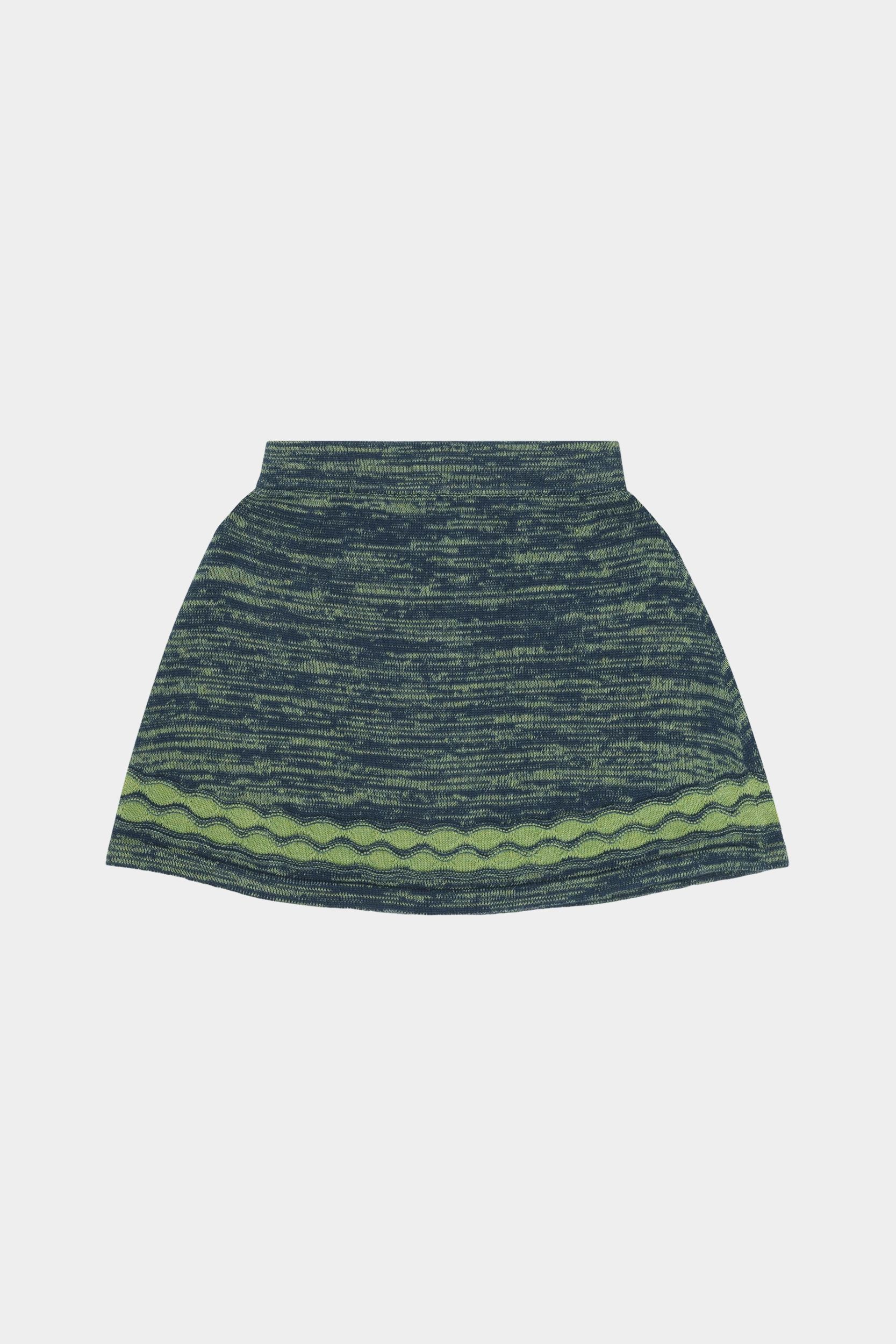 Denne nederdel i A-facon er strikket i en fast tofarvet melangestruktur. Den har en bred elastikkant i taljen, der sikrer en komfortabel pasform og er lavet af økologisk bomuld. Nederdelen stopper lige over knæet og har dekorative kontrastfarvede detaljer forneden.