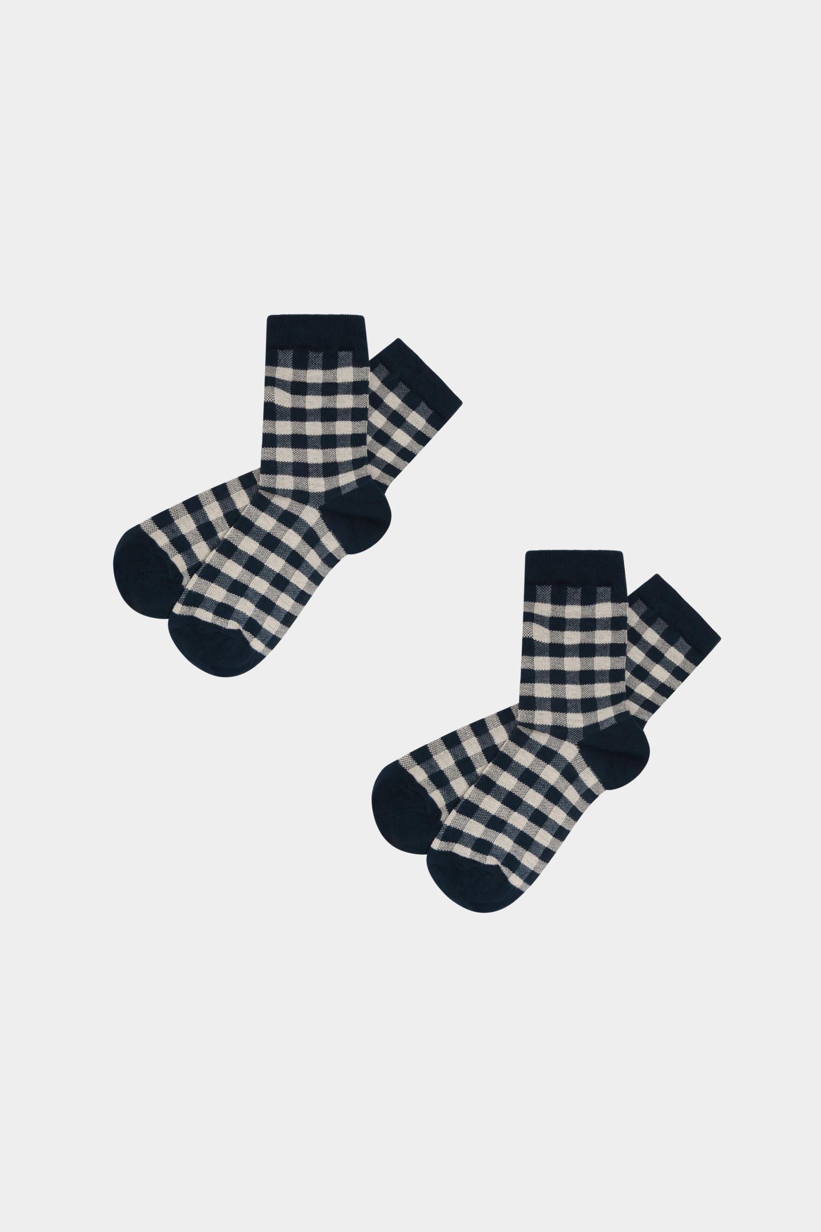 Strømperne er lavet af økologisk bomuldsgarn mikset med elastan for at sikre holdbarhed og god pasform. De er strikket i et grafisk ternmønster med kontrastfarvede detaljer og har forstærkning ved tå og hæl samt en fast dobbeltkant foroven for ekstra komfort.