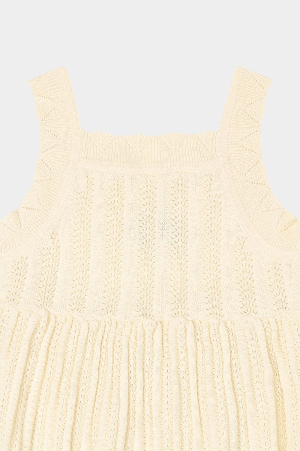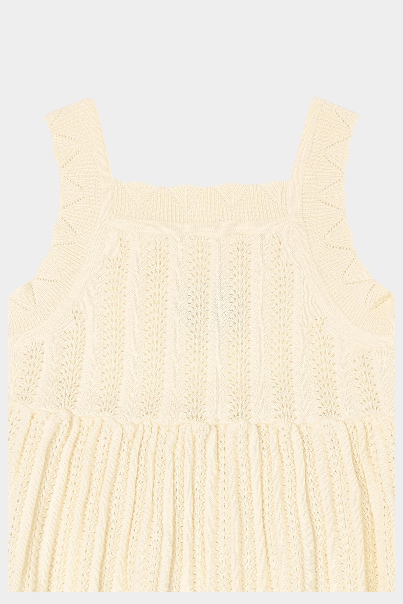 Denne knælange kjole med stropper er strikket i en delikat pointellestruktur. Kjolen har pointelle detaljer på stropperne og bløde rynk ved taljen, som giver skørtet volumen. Lavet af økologisk bomuld.