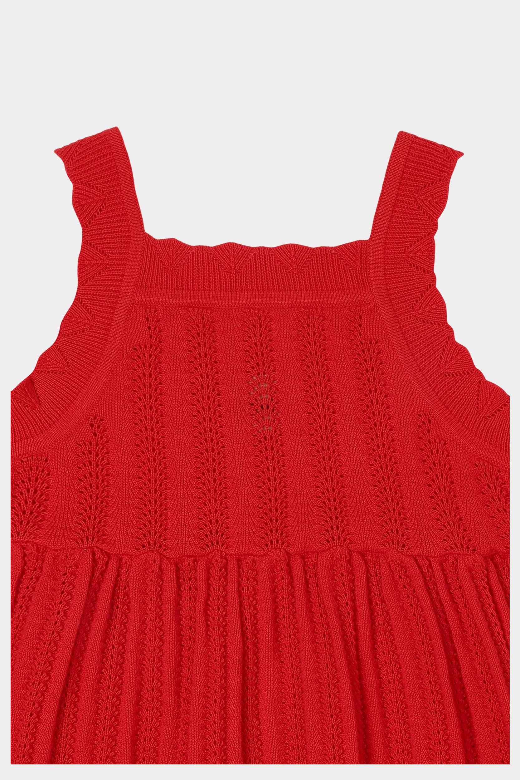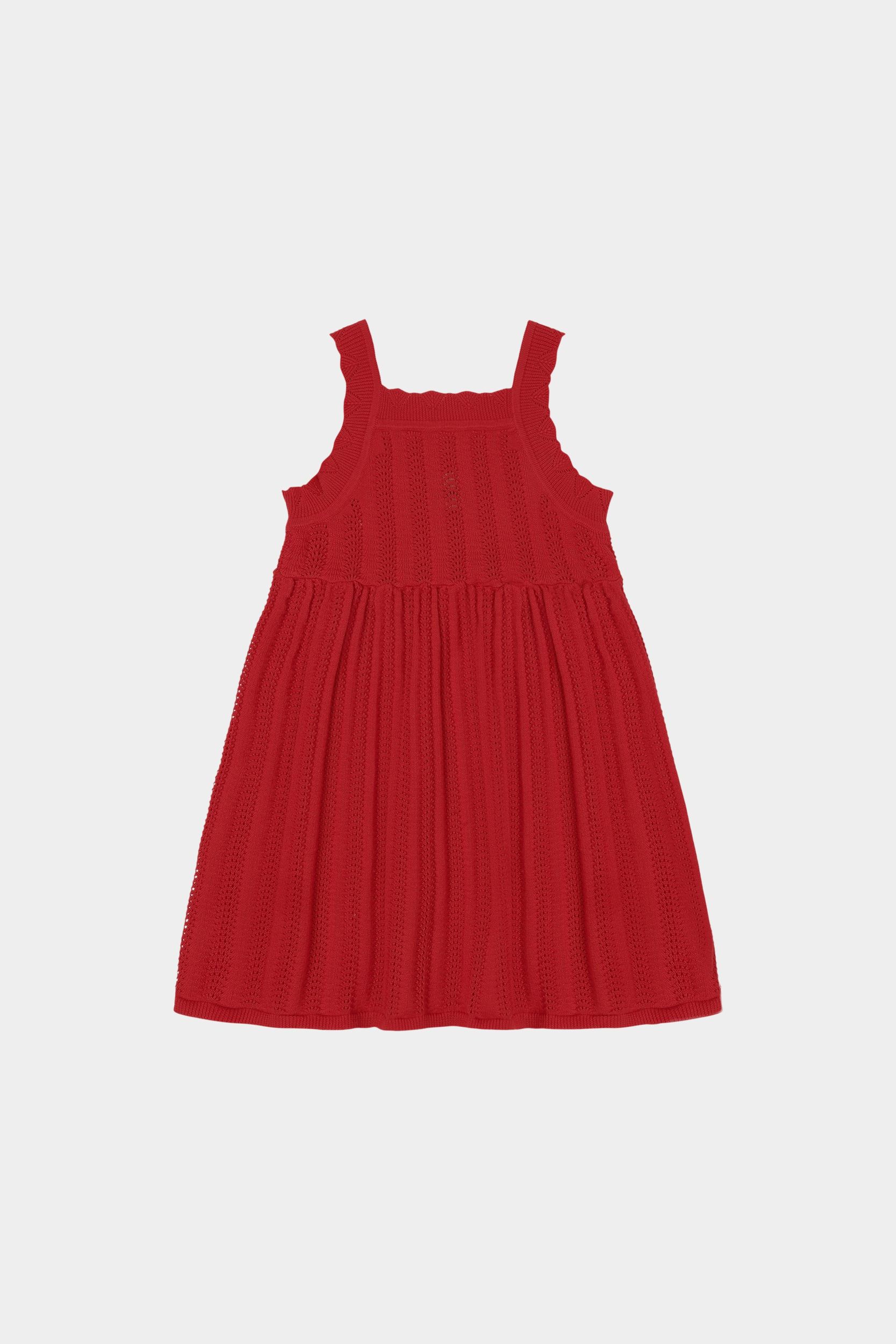 Denne knælange kjole med stropper er strikket i en delikat pointellestruktur. Kjolen har pointelle detaljer på stropperne og bløde rynk ved taljen, som giver skørtet volumen. Lavet af økologisk bomuld.