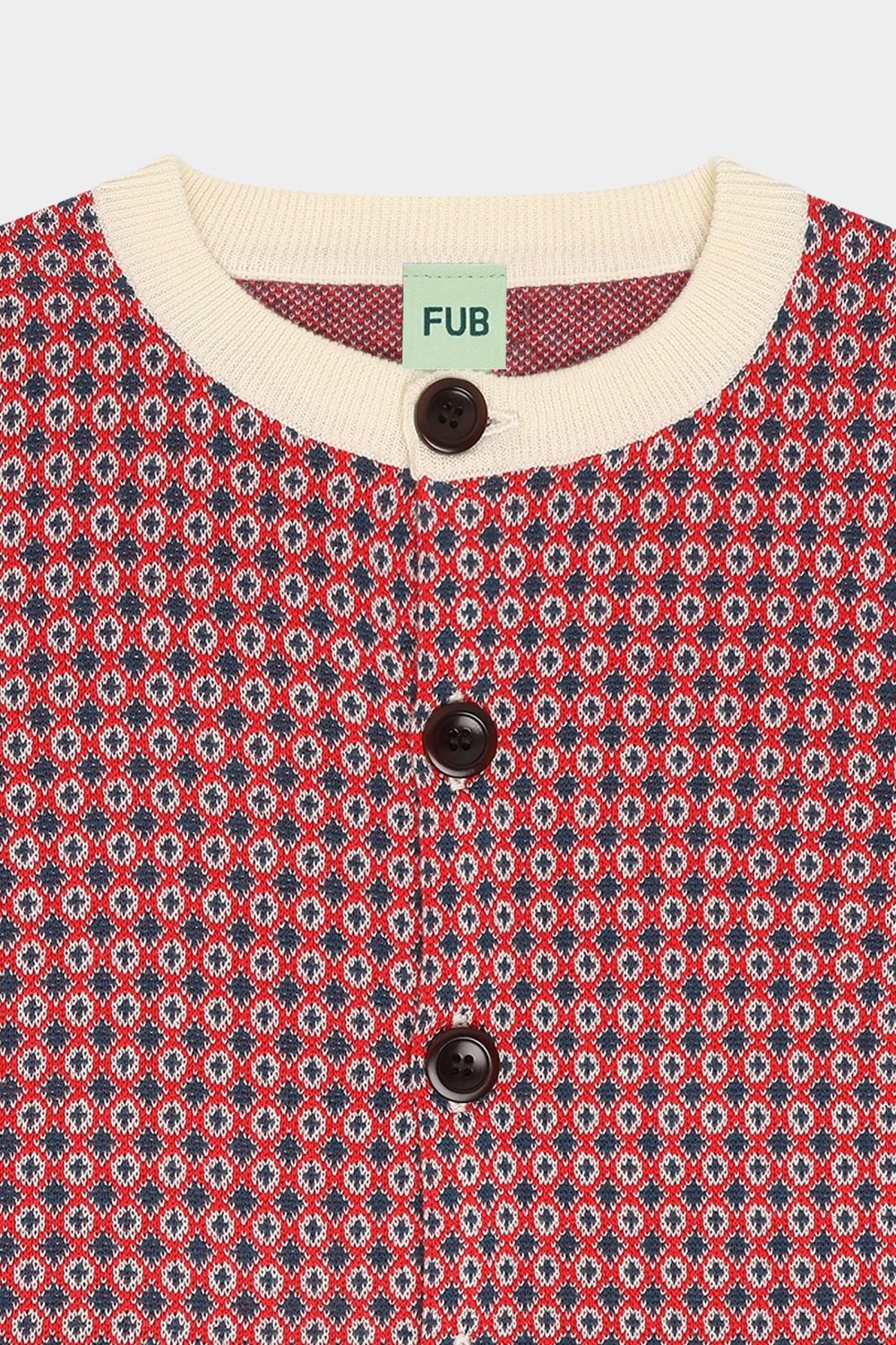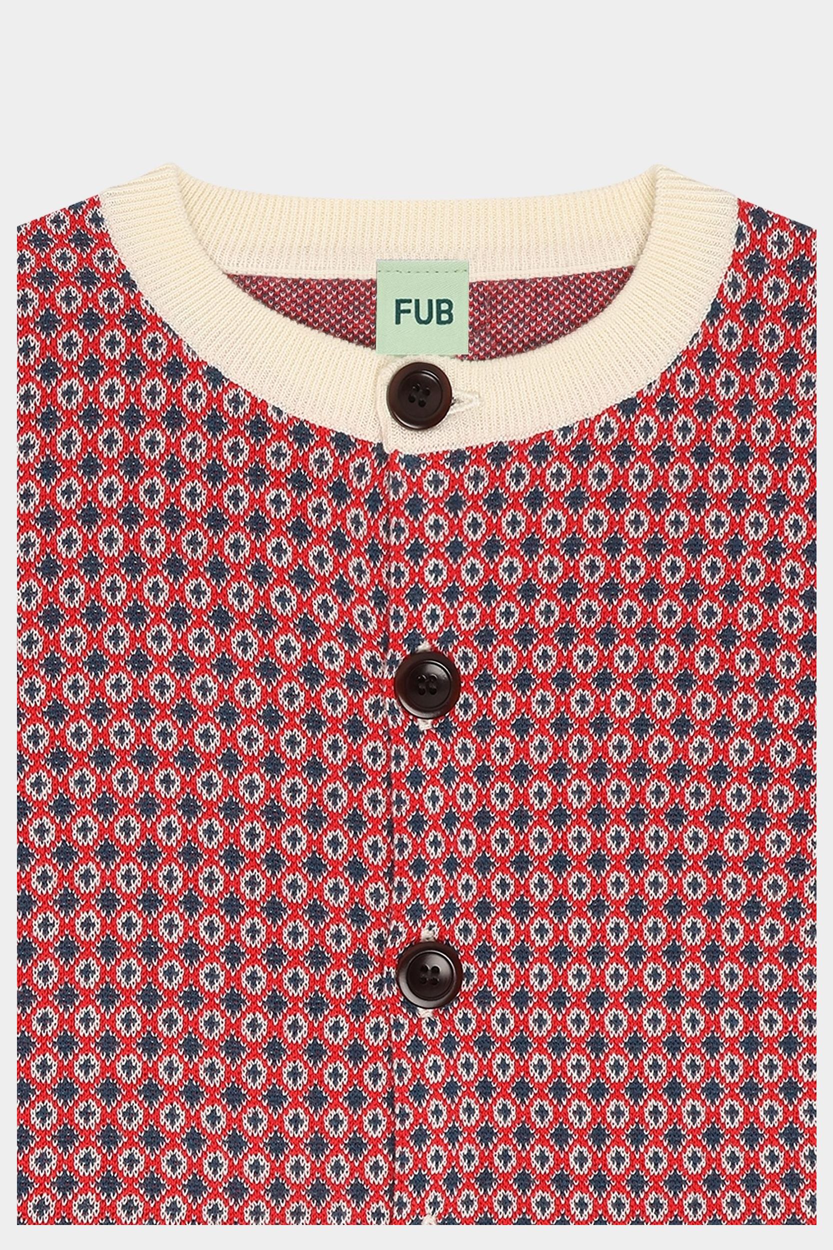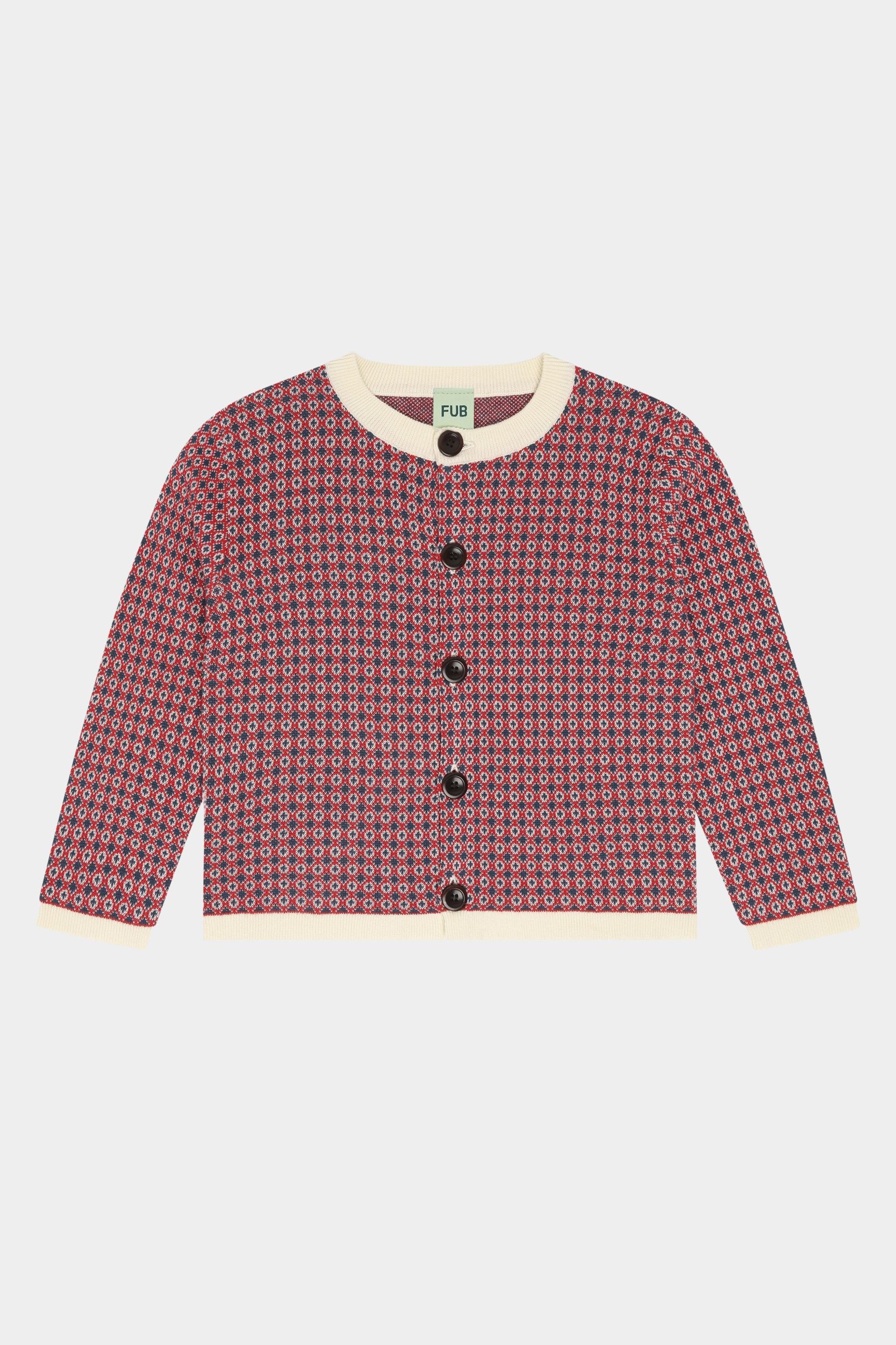 Denne cardigan er strikket i et grafisk jacquardmønster. Den har rund ribstrikket hals, en rummelig pasform og lukkes foran med knapper af corozonød. Cardiganen fås i et blomstermønster og i et grafisk nordisk mønster og er lavet af økologisk bomuld.