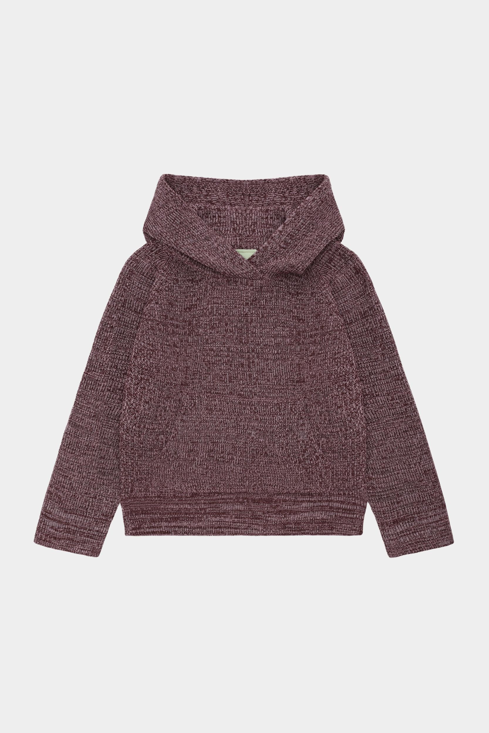 Denne hoodie er strikket i en klassisk ribstruktur og har en løs pasform med raglanærmer og lomme foran. Hoodien er designet med en rummelig facon og kan både bruges med en bluse under eller alene. Lavet af økologisk bomuld.