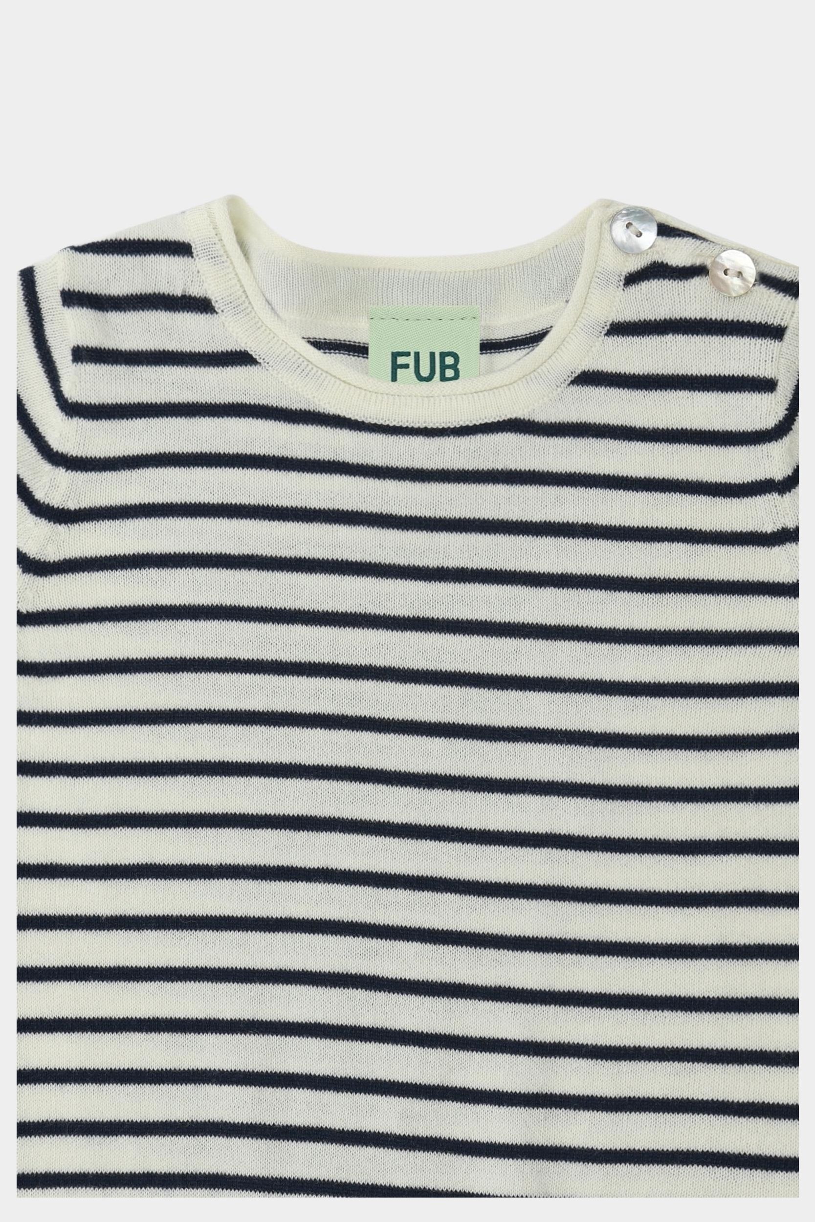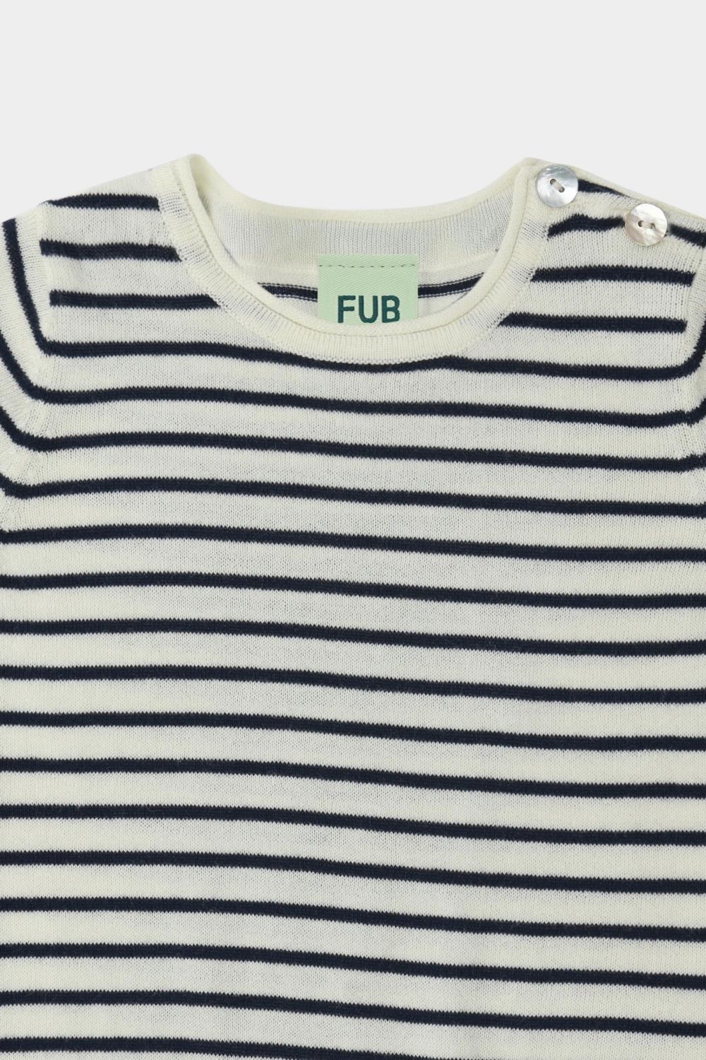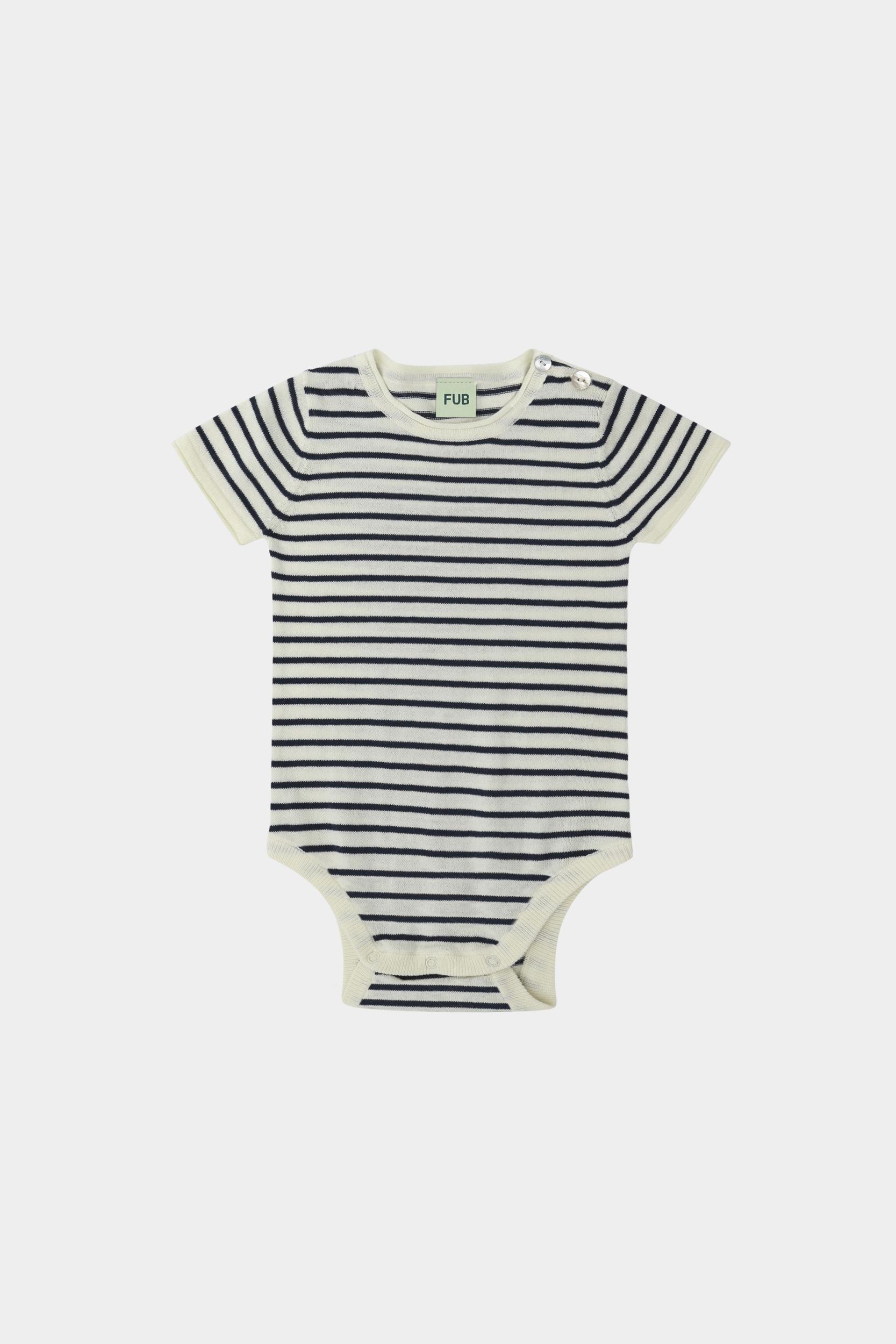 Denne stribede bodystocking er en FUB-klassiker. Den har korte ærmer, rund hals og rullekanter ved ærmer og halsudskæring. Bodyen har en praktisk lukning ved skulderen med perlemorsknapper og trykknapper forneden. Den er strikket i let single jersey med striber og er lavet af økologisk bomuld.