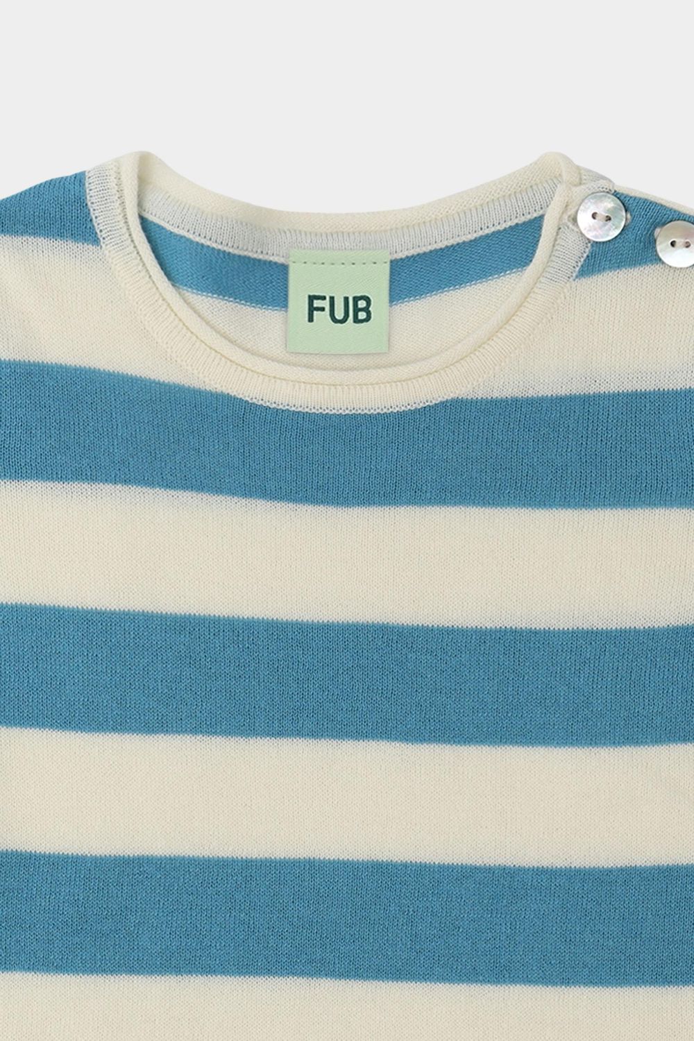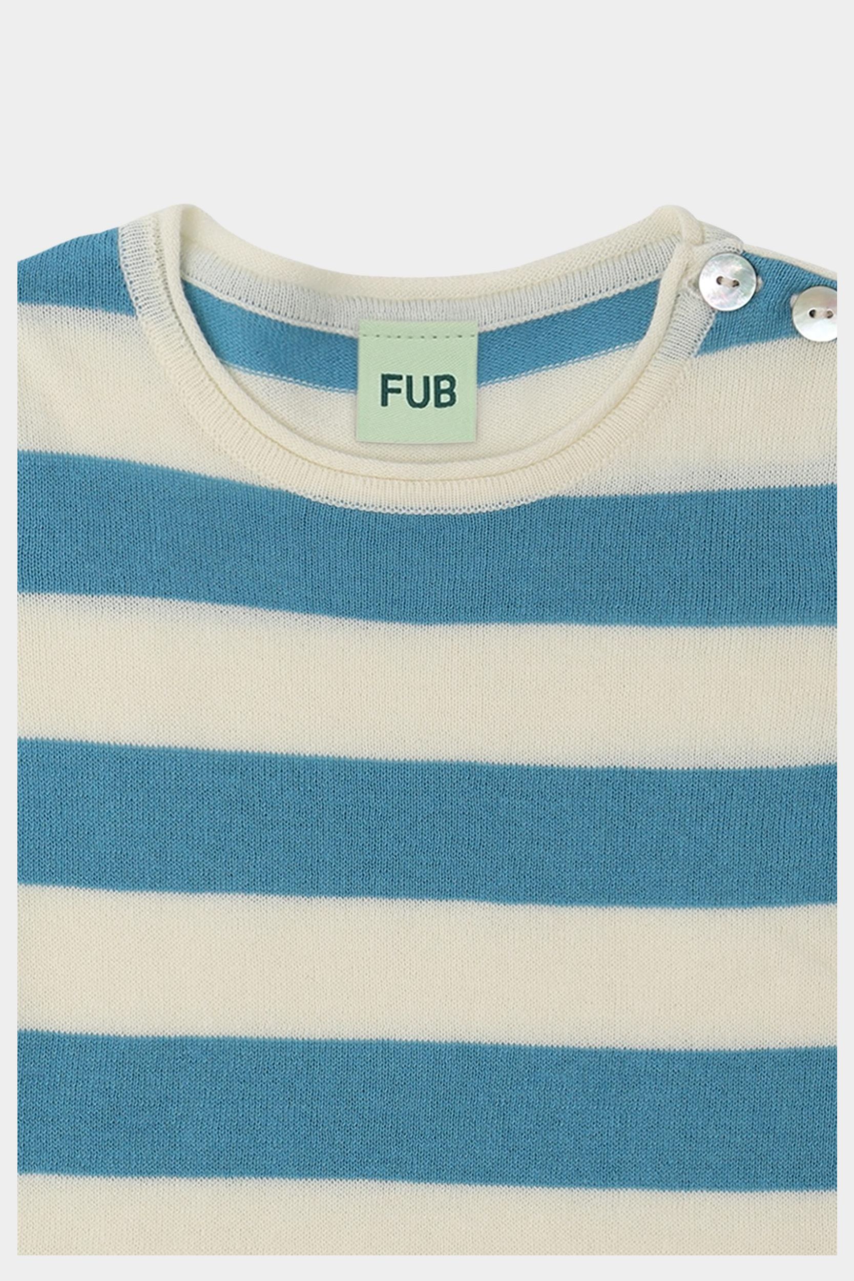 Denne stribede bodystocking er en FUB-klassiker. Den har korte ærmer, rund hals og rullekanter ved ærmer og halsudskæring. Bodyen har en praktisk lukning ved skulderen med perlemorsknapper og trykknapper forneden. Den er strikket i let single jersey med striber og er lavet af økologisk bomuld.