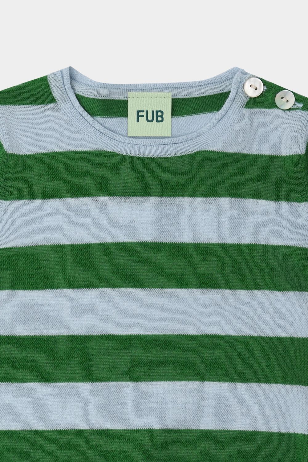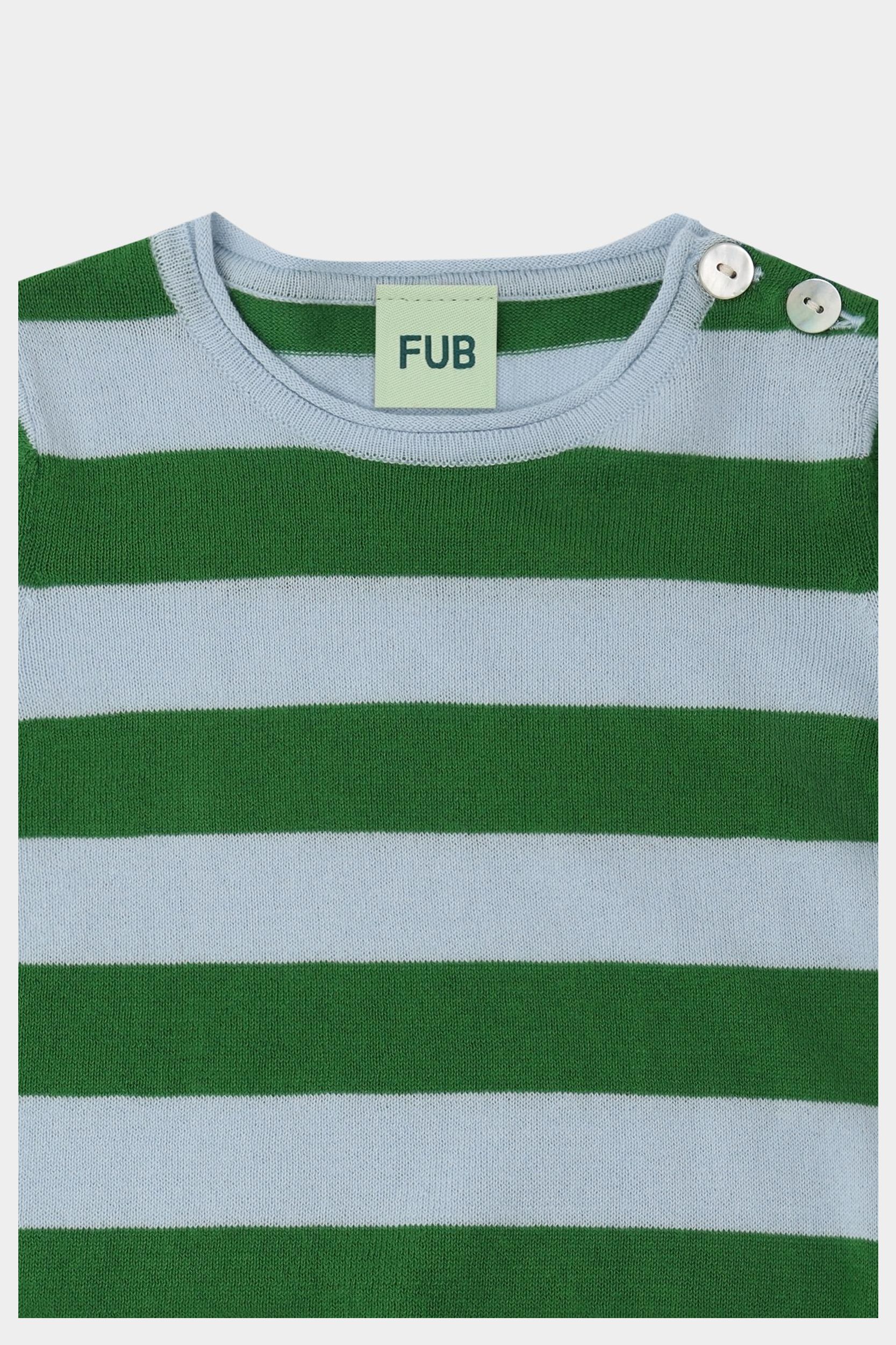Denne stribede bodystocking er en FUB-klassiker. Den har korte ærmer, rund hals og rullekanter ved ærmer og halsudskæring. Bodyen har en praktisk lukning ved skulderen med perlemorsknapper og trykknapper forneden. Den er strikket i let single jersey med striber og er lavet af økologisk bomuld.