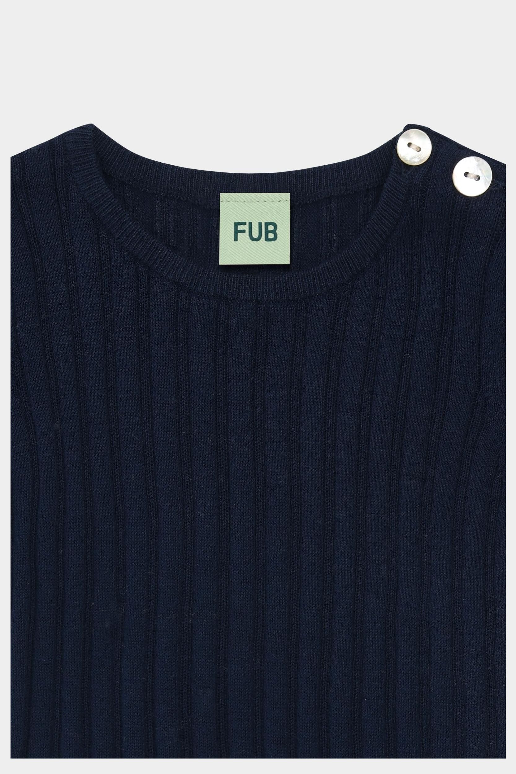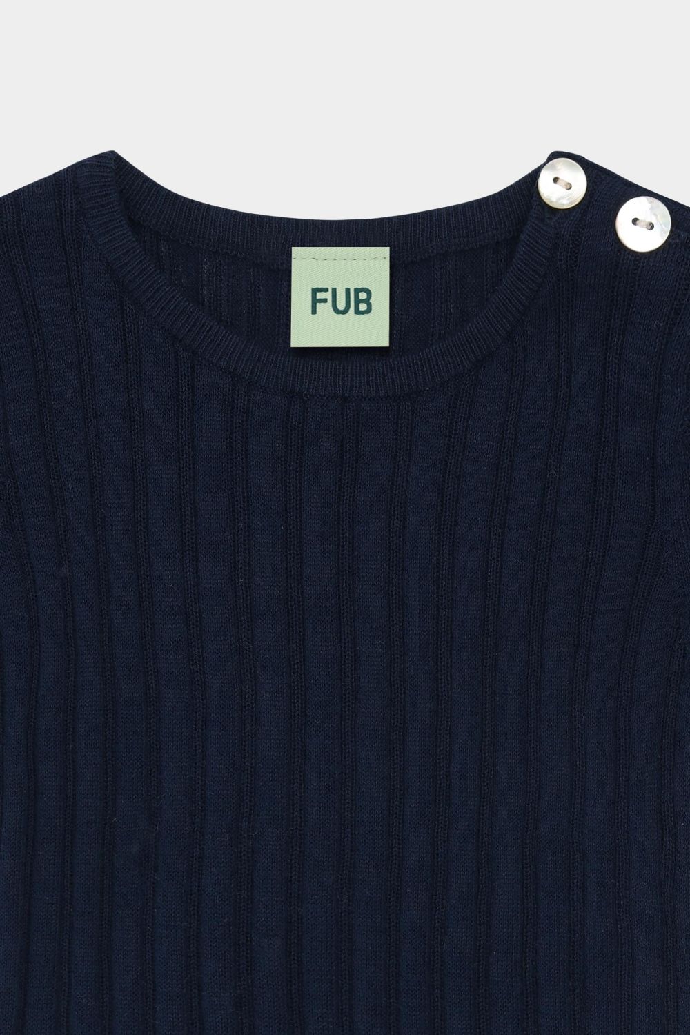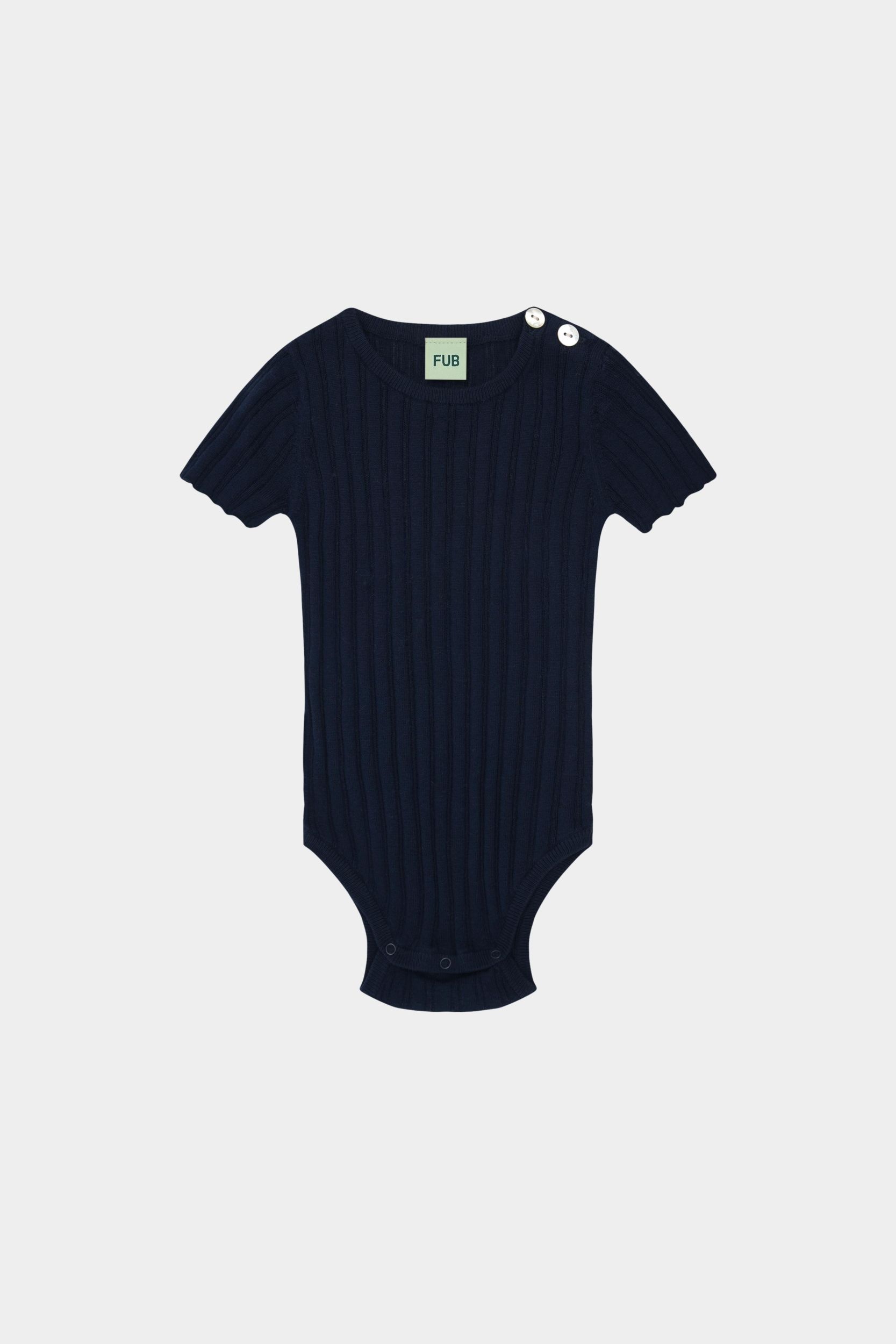 Denne bodystocking er strikket i en bred ribstruktur og har korte ærmer og rund hals. Bodyen har en praktisk lukning ved skulderen med perlemorsknapper og trykknapper forneden. Lavet af økologisk bomuld.