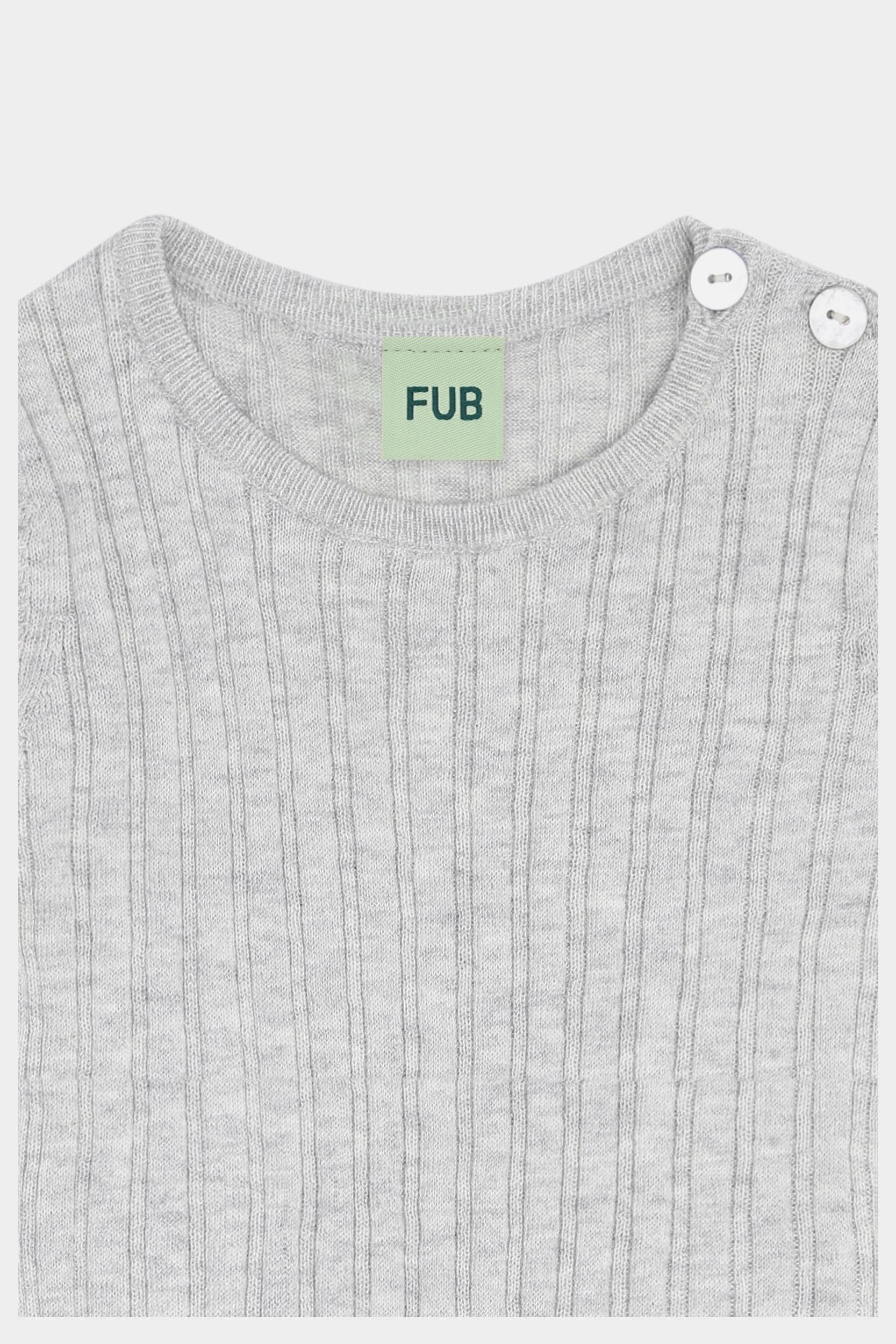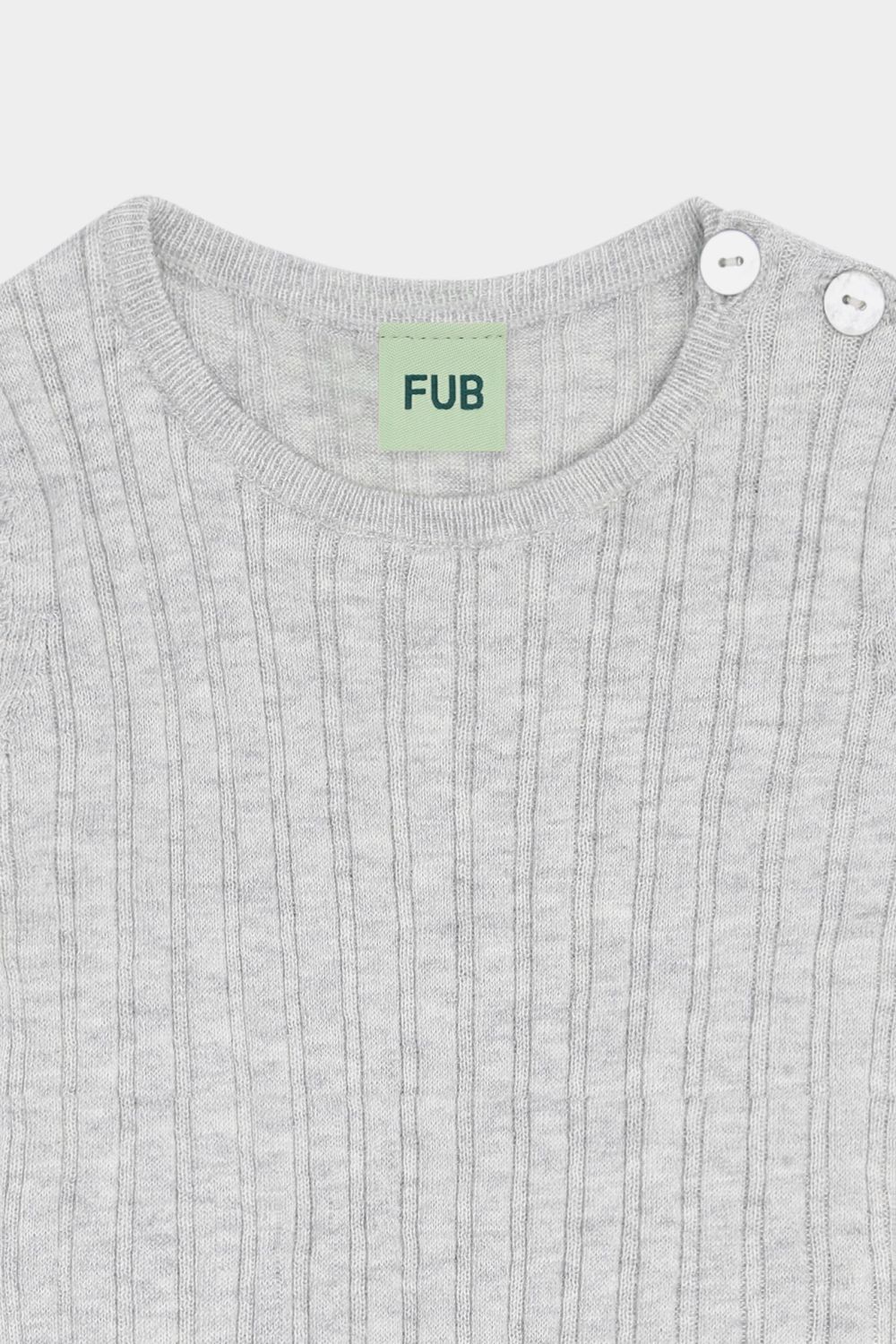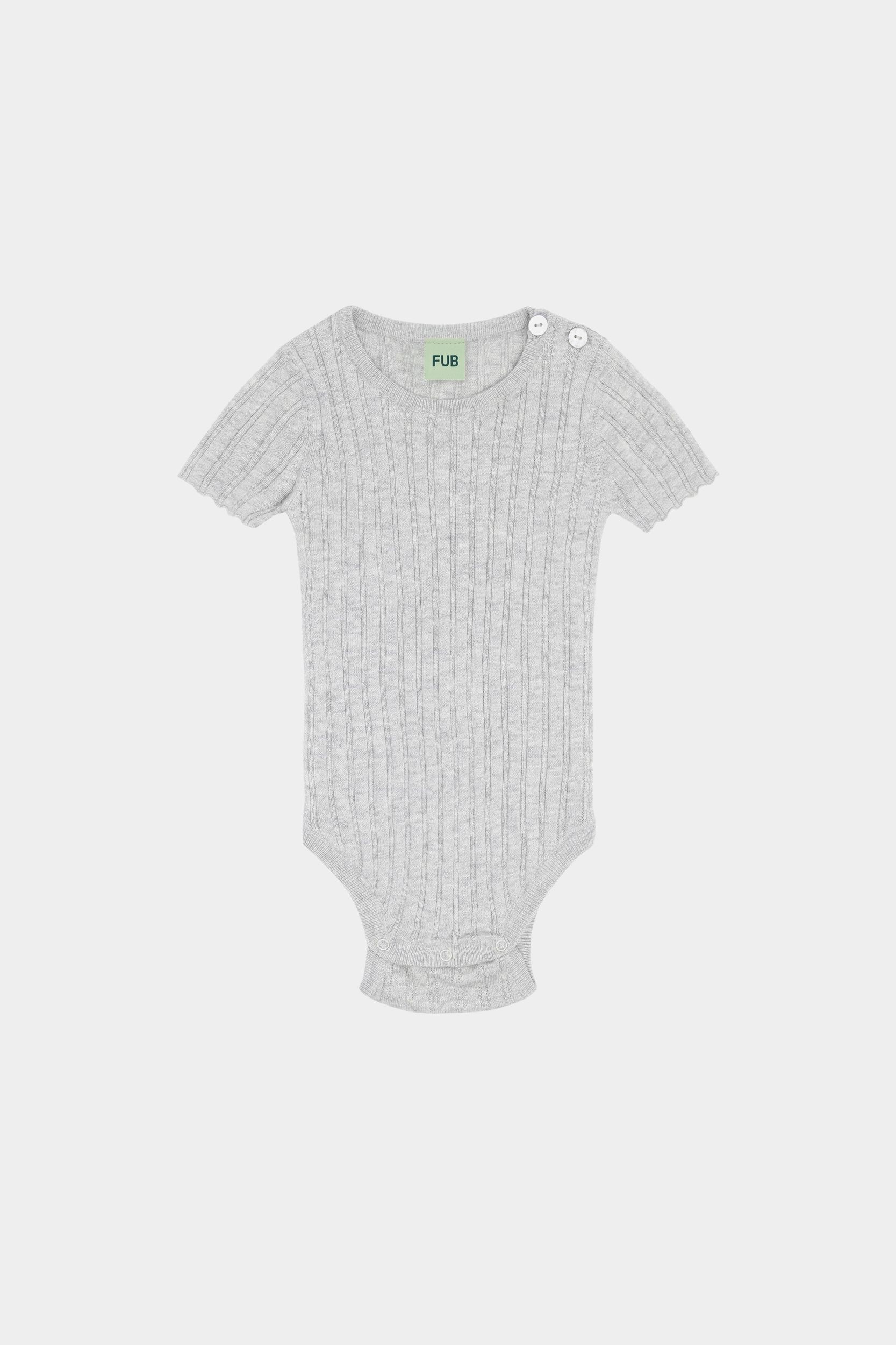 Denne bodystocking er strikket i en bred ribstruktur og har korte ærmer og rund hals. Bodyen har en praktisk lukning ved skulderen med perlemorsknapper og trykknapper forneden. Lavet af økologisk bomuld.