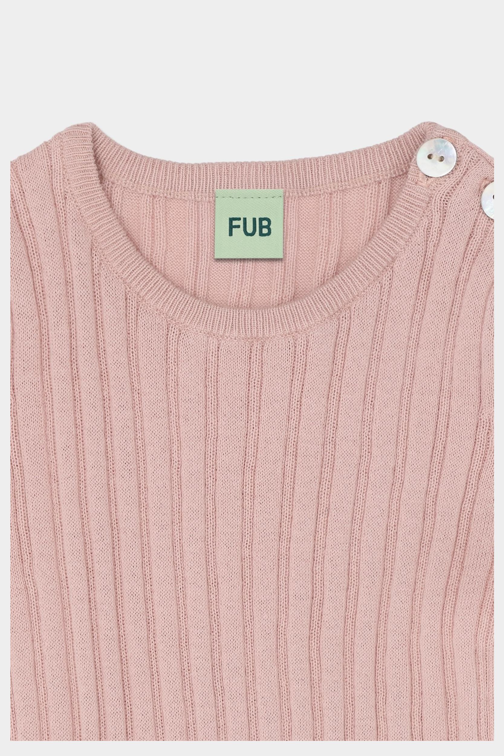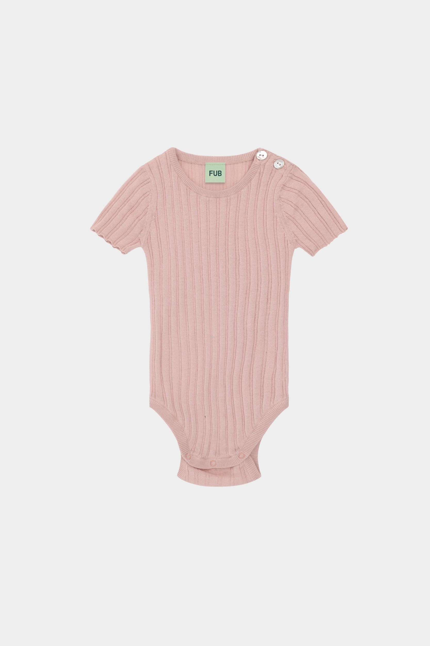 Denne bodystocking er strikket i en bred ribstruktur og har korte ærmer og rund hals. Bodyen har en praktisk lukning ved skulderen med perlemorsknapper og trykknapper forneden. Lavet af økologisk bomuld.